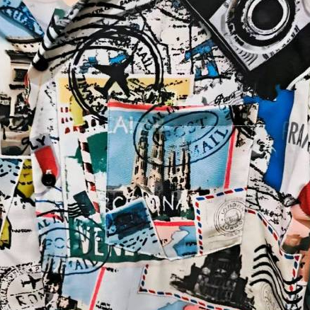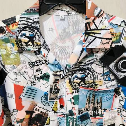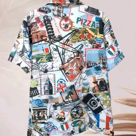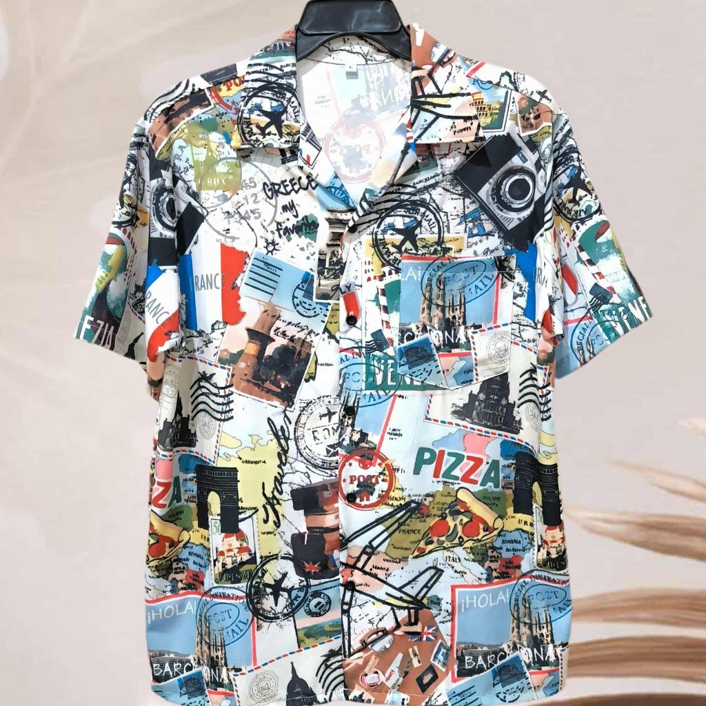 เสื้อเชิ้ตฮาวาย ลายแลนท์มาร์ทยุโรป (พื้นสีขาว) ผ้าไหมอิตาลี