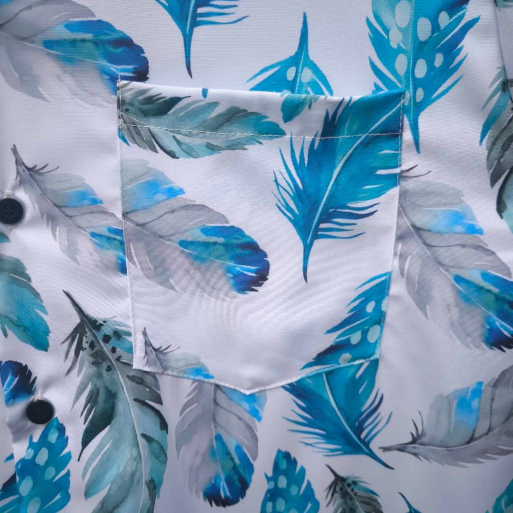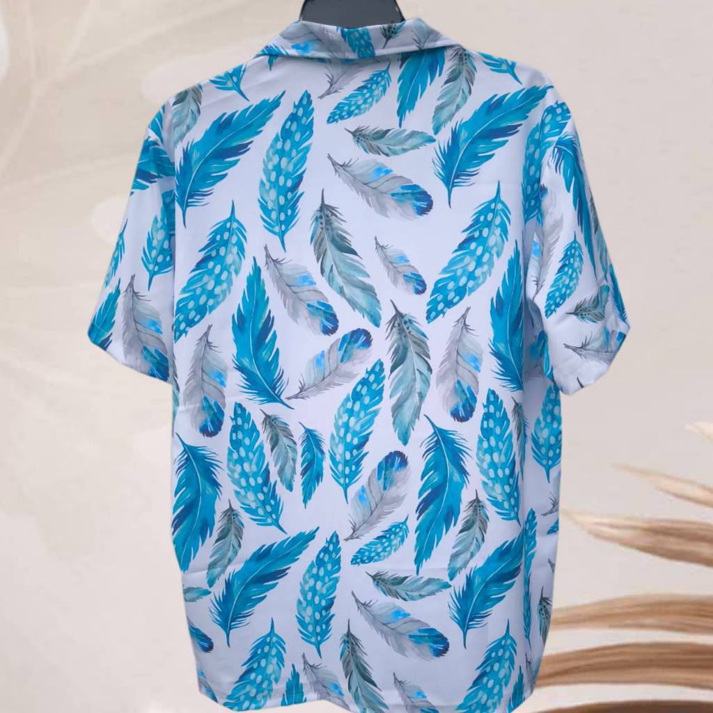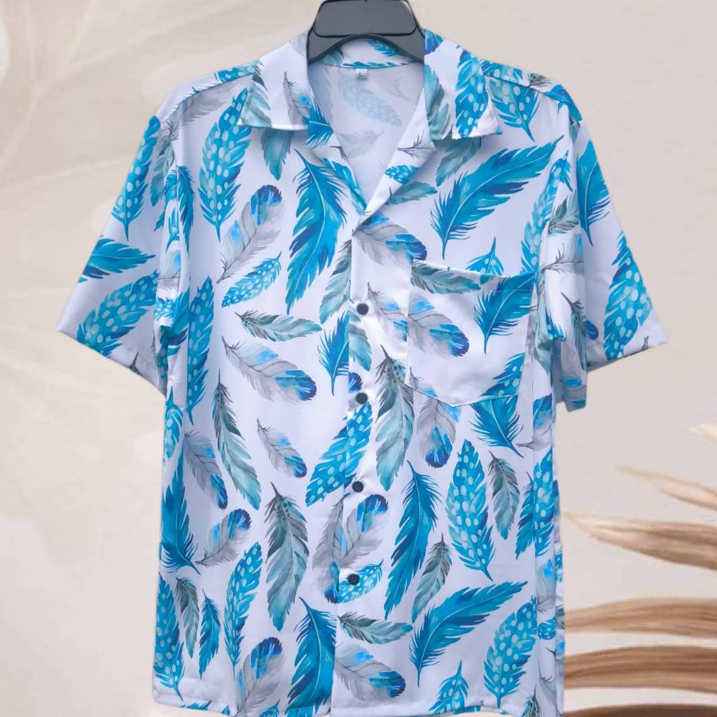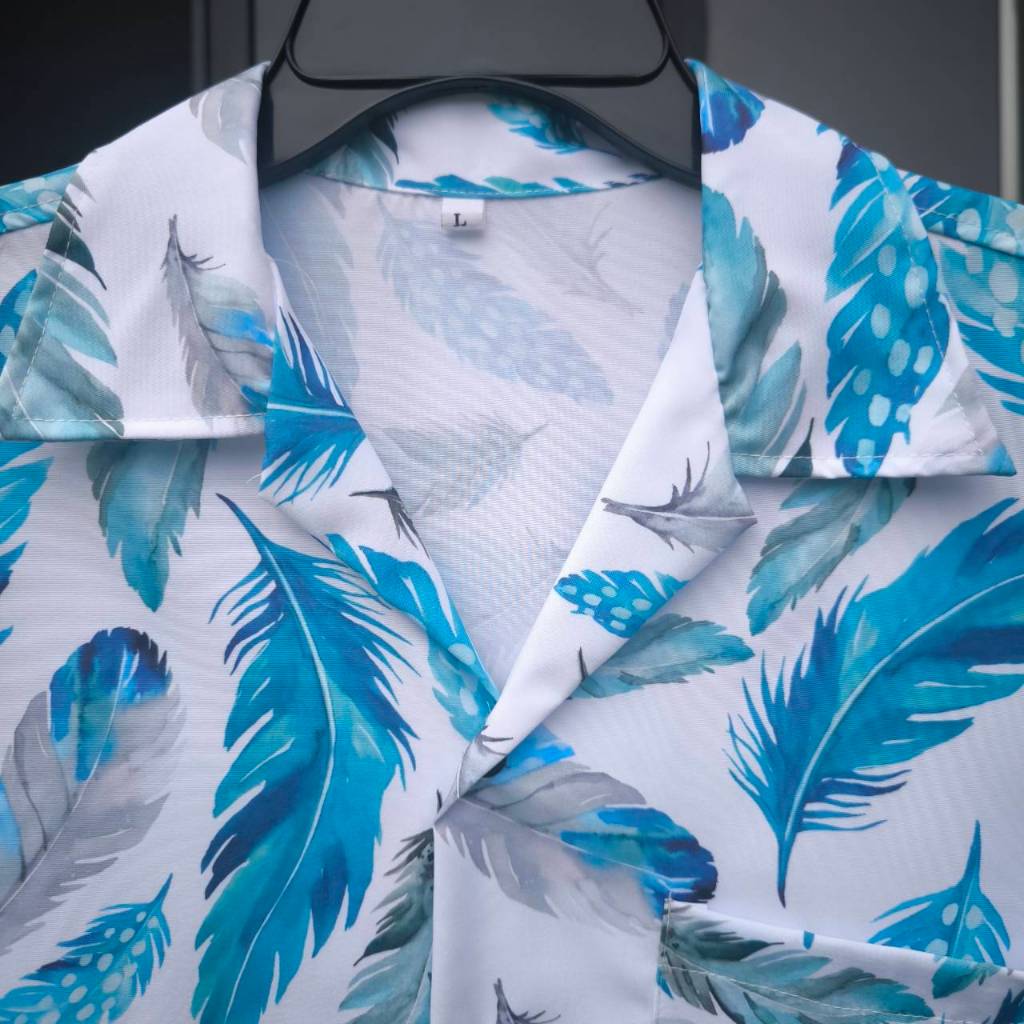 เสื้อเชิ้ตฮาวาย ลายขนนกฟ้าใหญ่ (พื้นสีขาว) ผ้าไหมอิตาลี
