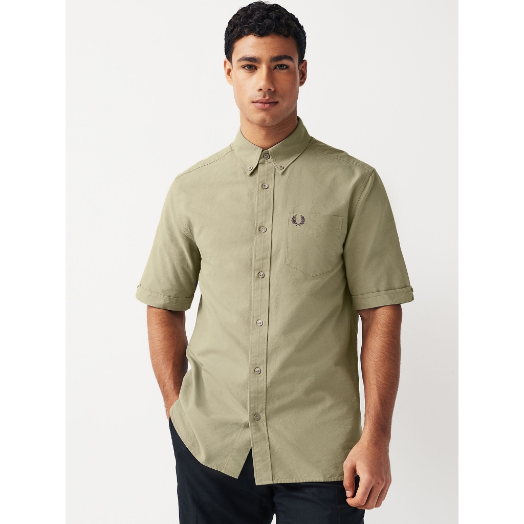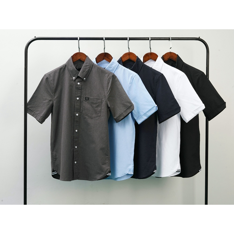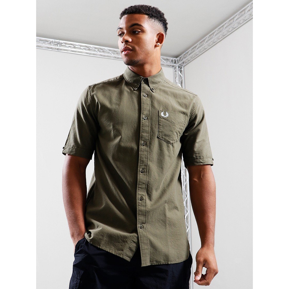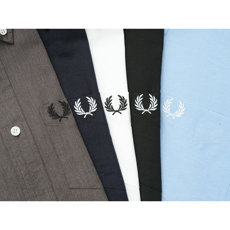 FredPerry เสื้อเชิ้ตแขนสั้น Oxford สีทึบ Laurel พวงหรีดปักกระเป๋า Buttoned Slit Sleeve Mens Top Shirt Youth Leisure สไตล์