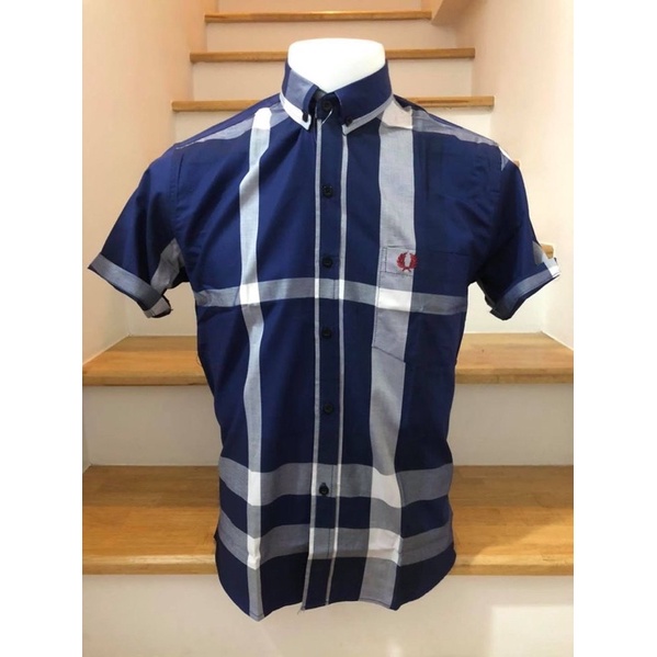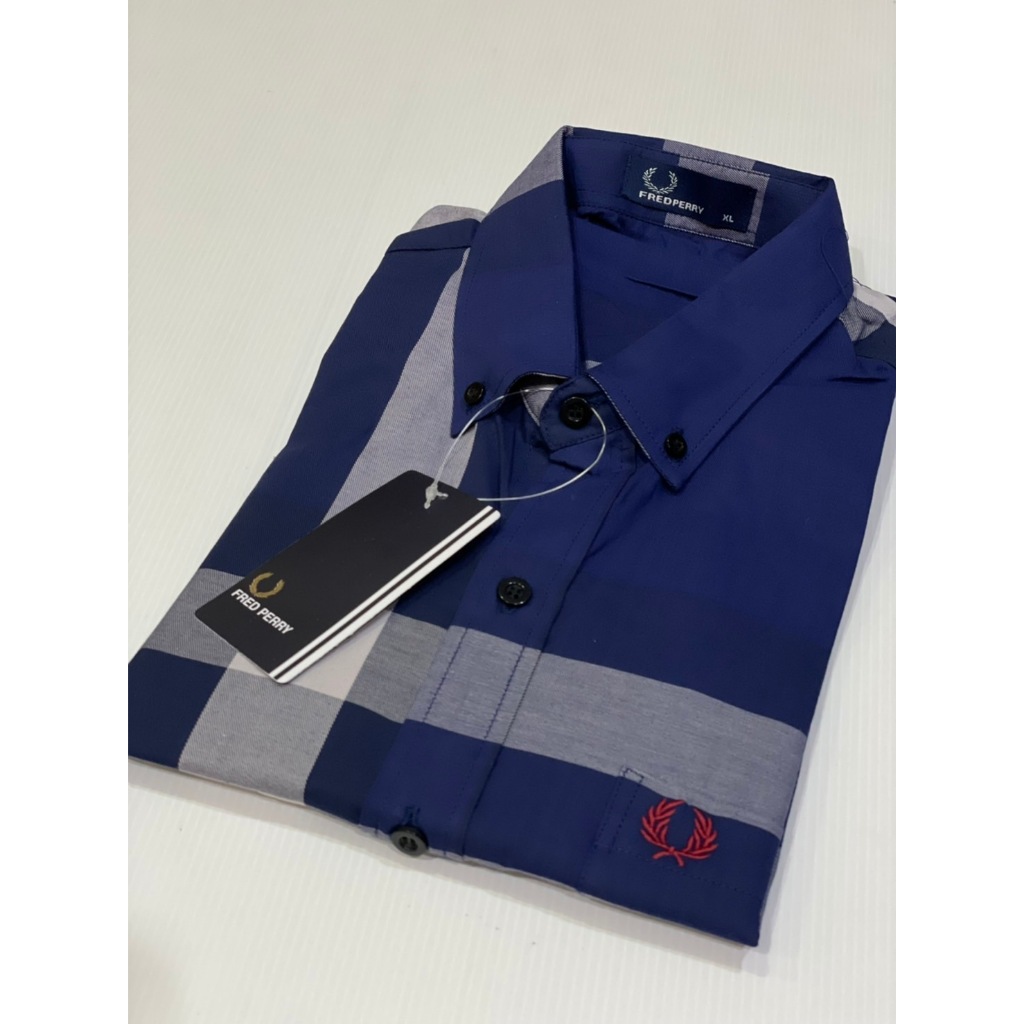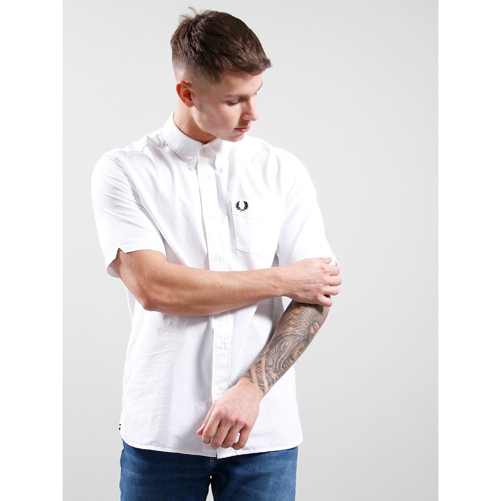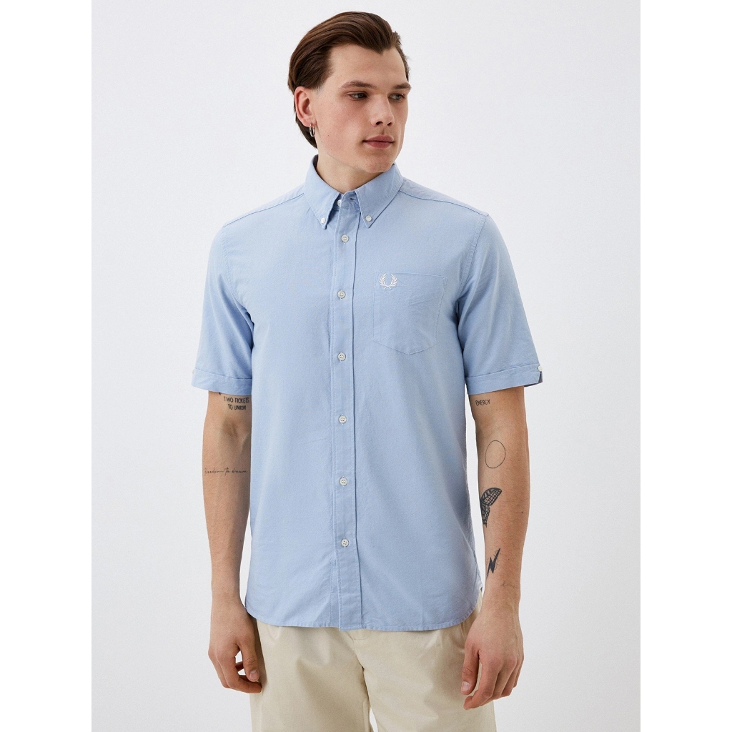 FredPerry เสื้อเชิ้ตแขนสั้น Oxford สีทึบ Laurel พวงหรีดปักกระเป๋า Buttoned Slit Sleeve Mens Top Shirt Youth Leisure สไตล์