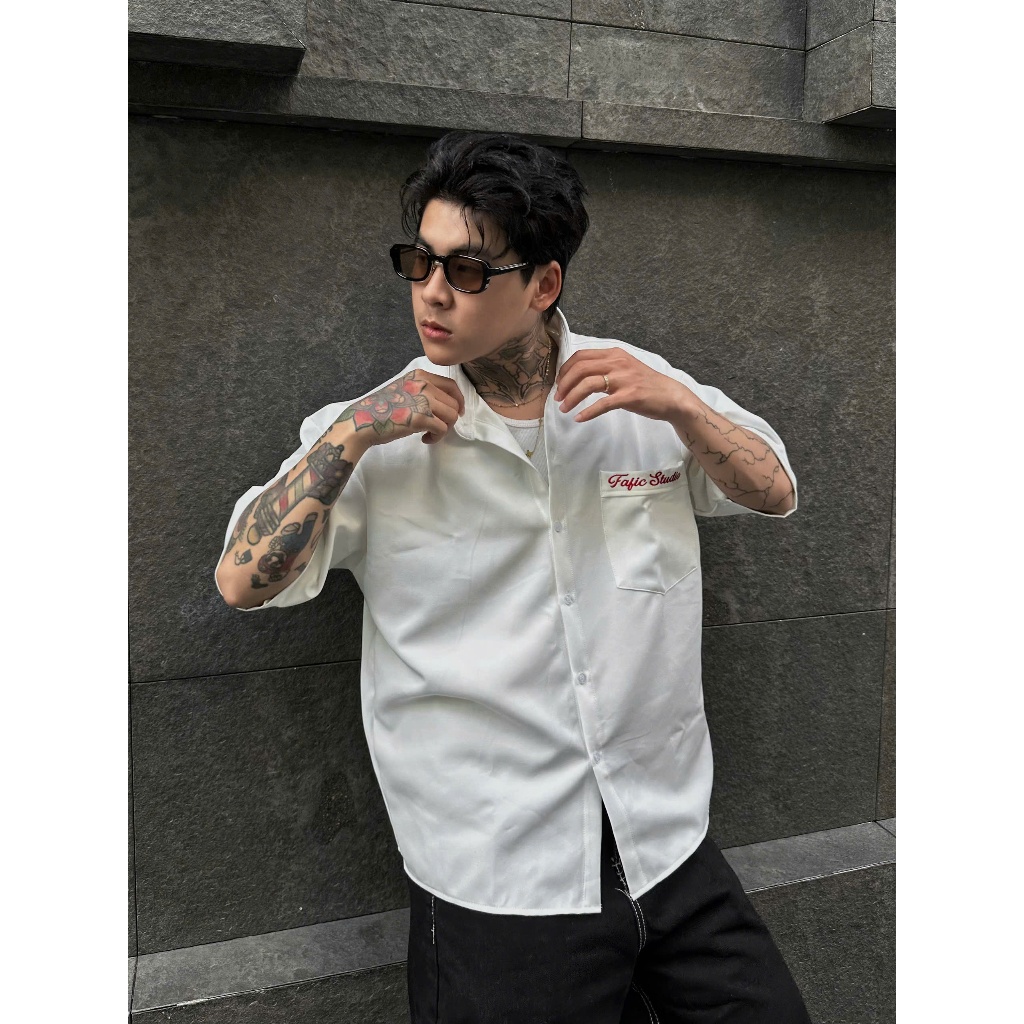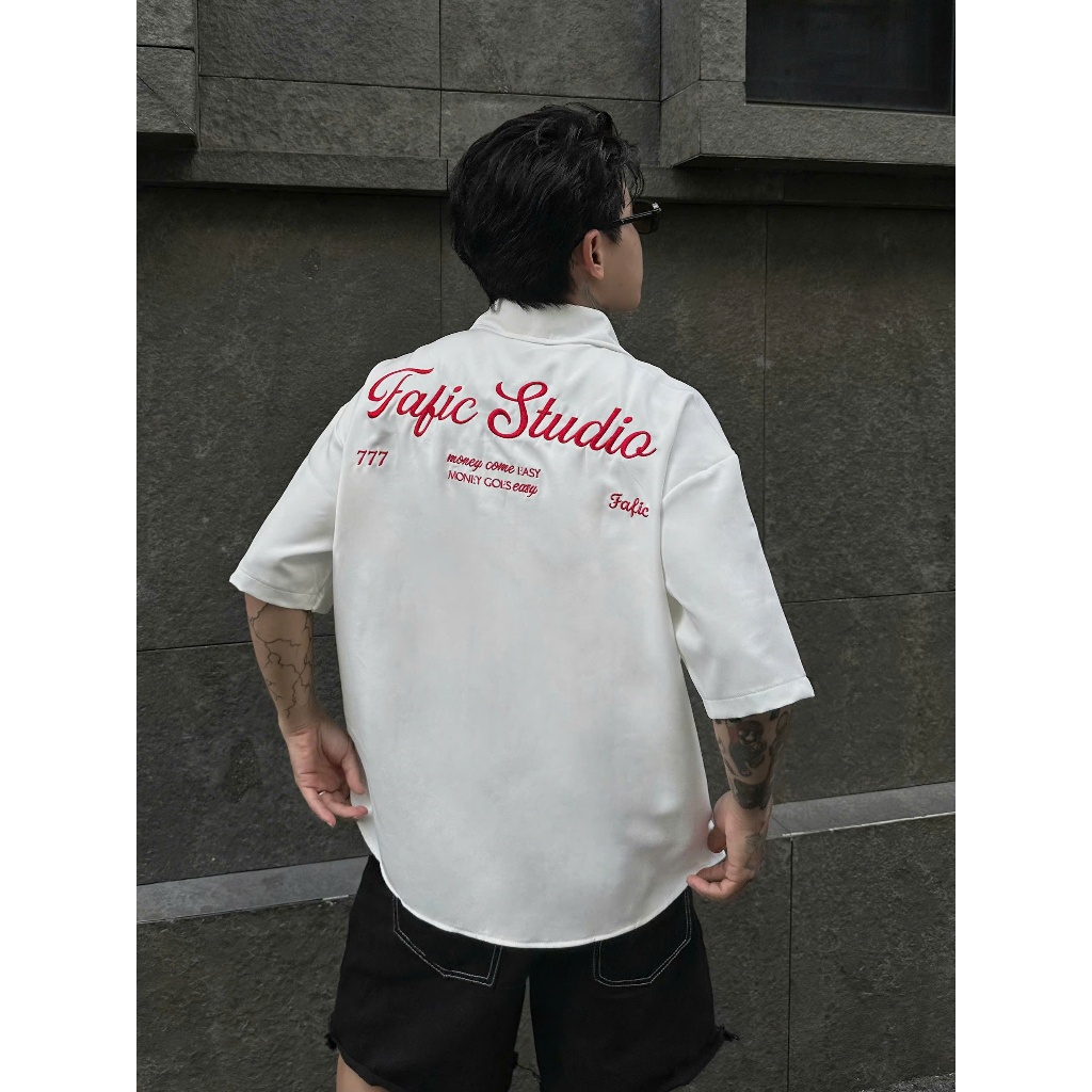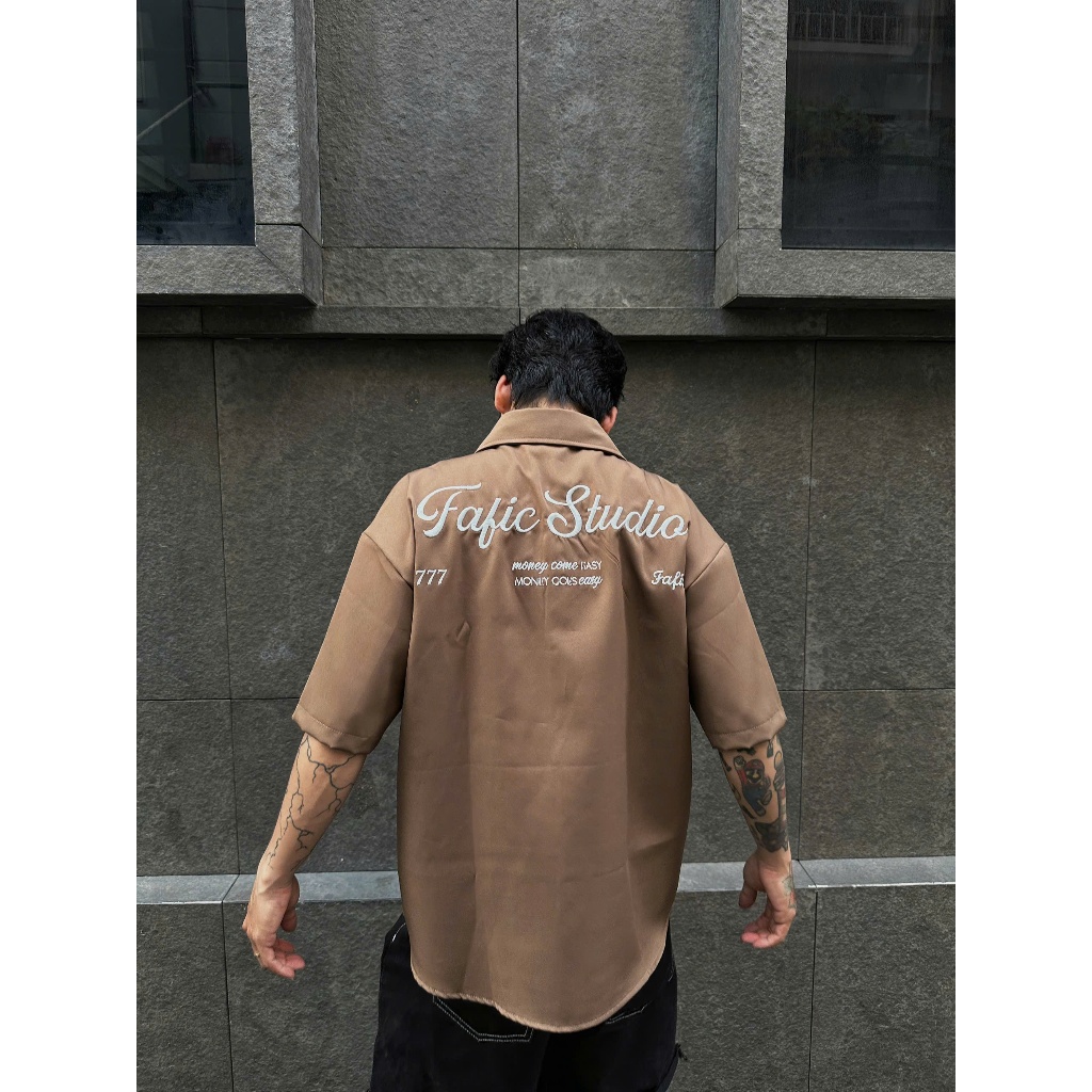 Fafic เสื้อเชิ้ตแขนสั้นปัก oxford มีกระเป๋าเสื้อเชิ้ตลายพื้นฐานหลวมรูปแบบกล่องแบรนด์ท้องถิ่น unisex สําหรับผู้ชายและผู้หญิง
