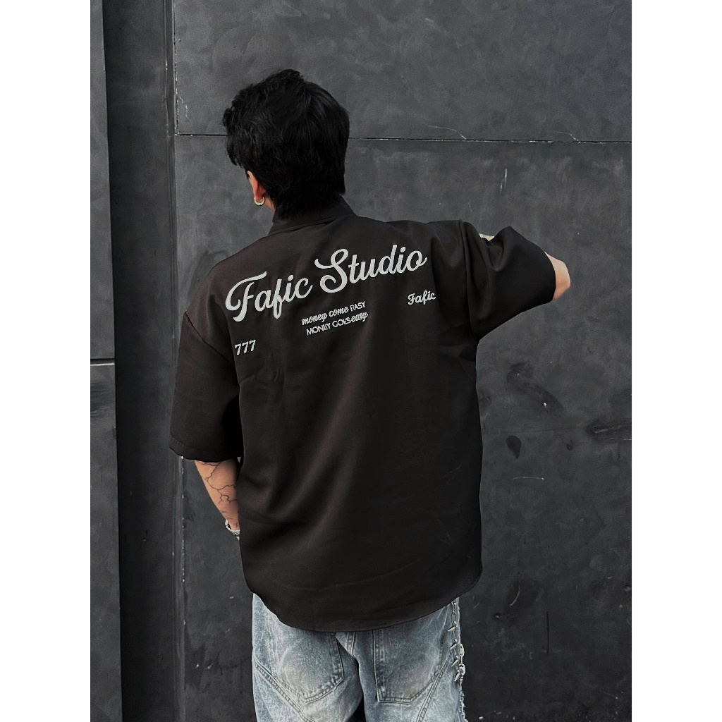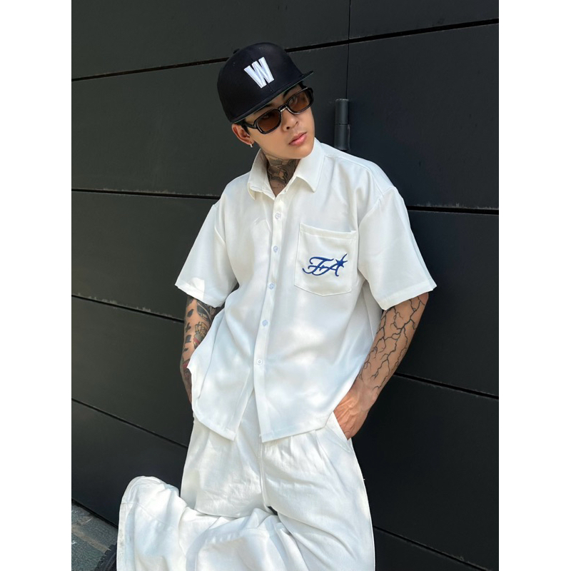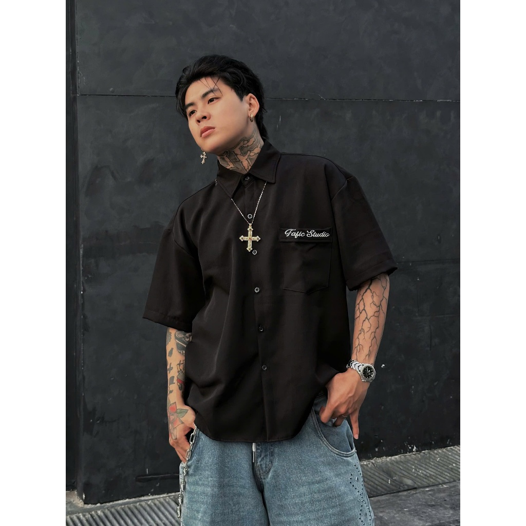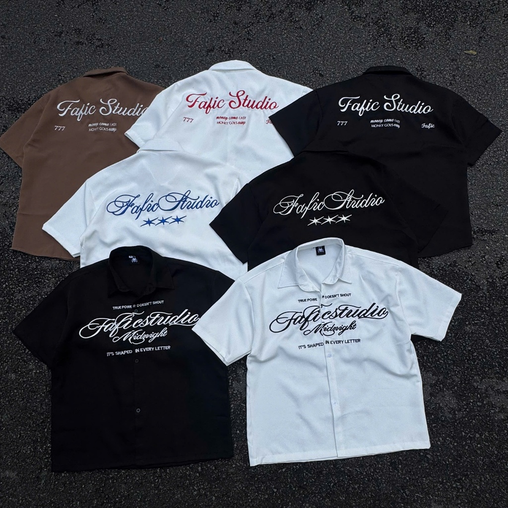 Fafic เสื้อเชิ้ตแขนสั้นปัก oxford มีกระเป๋าเสื้อเชิ้ตลายพื้นฐานหลวมรูปแบบกล่องแบรนด์ท้องถิ่น unisex สําหรับผู้ชายและผู้หญิง