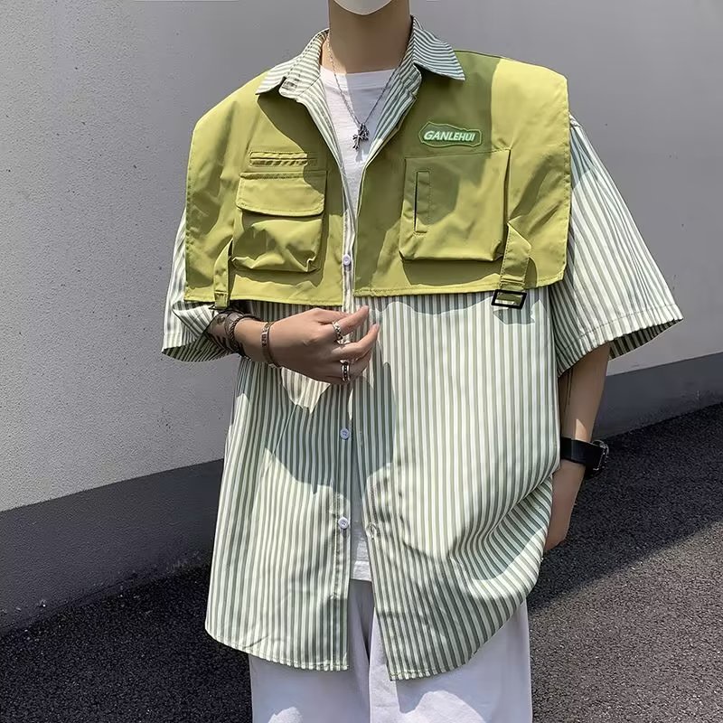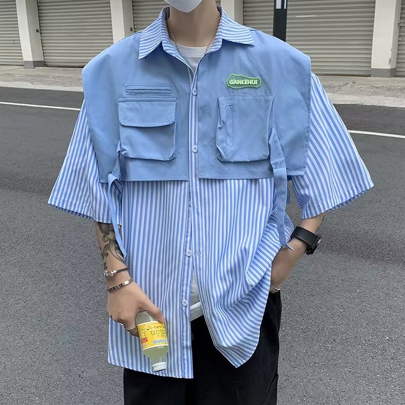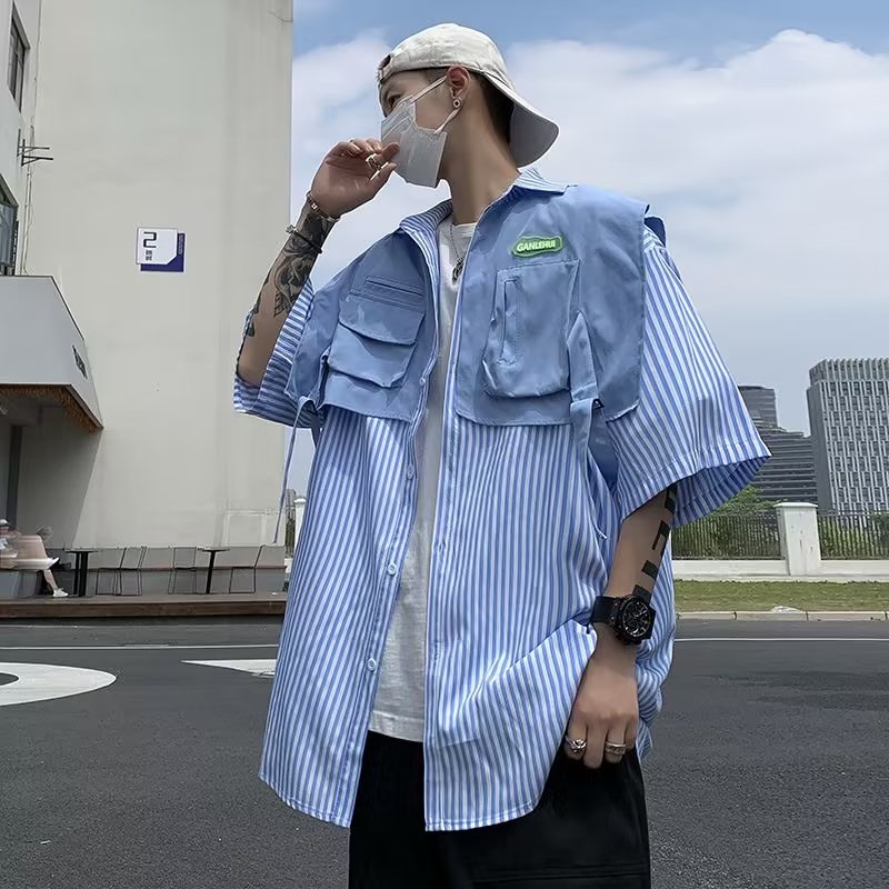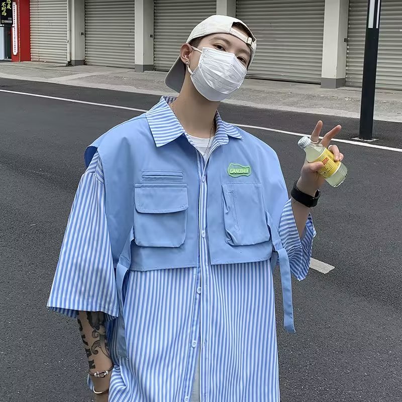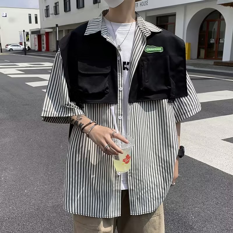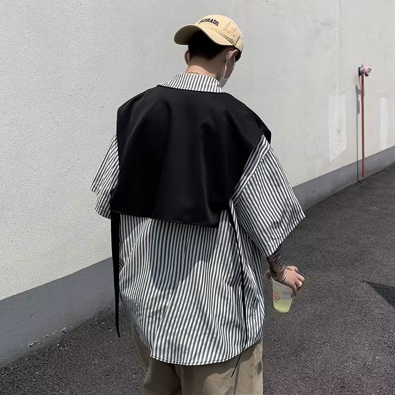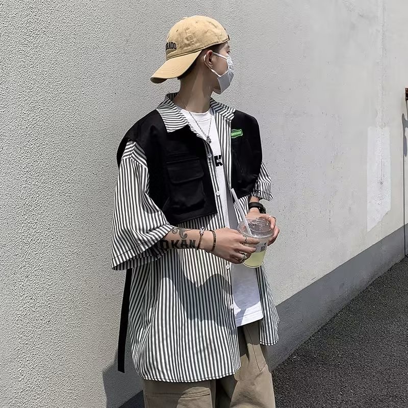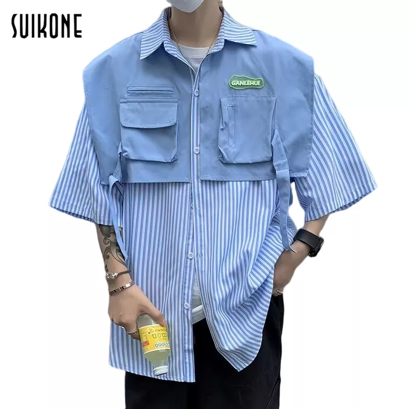 Suikone เสื้อเชิ้ตผู้ชายแขนสั้นแฟชั่นญี่ปุ่นสไตล์ฮาราจูกุสไตล์ฮ่องกงเสื้อเชิ้ตแขนสั้นลายทางสบายๆใส่ได้ทั้งผู้ชายและผู้หญิง