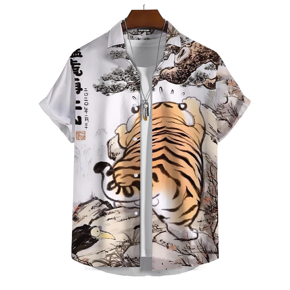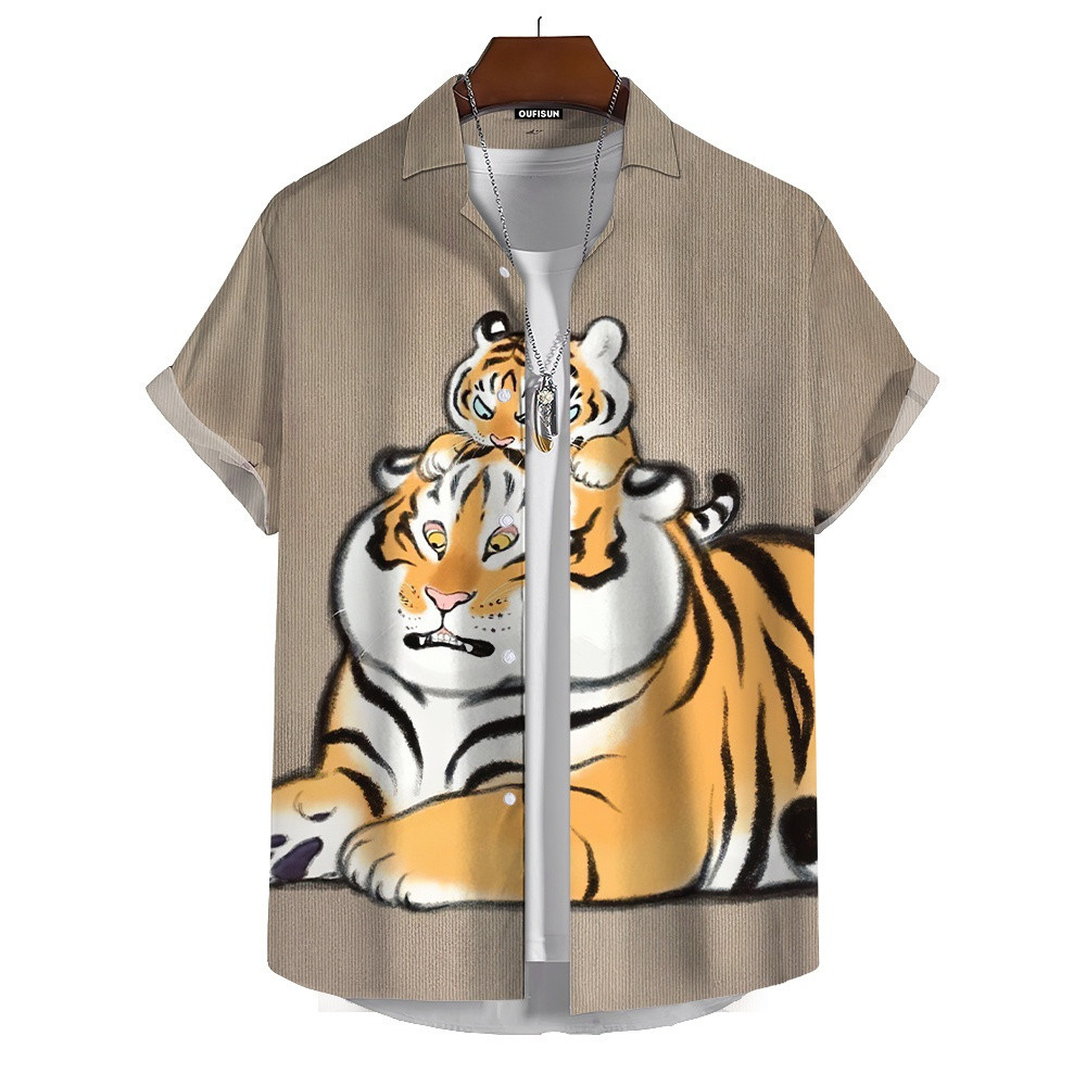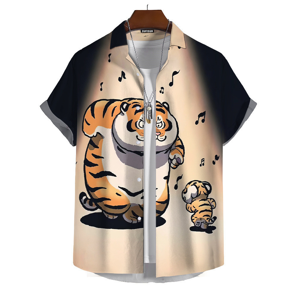 ชุดเสื้อแขนสั้นผู้ชายลายการ์ตูนเสืออ้วน Oufisun ซีรีส์ฤดูร้อนพิมพ์ย้อนยุคฮิปฮอปสตรีทดอกไม้