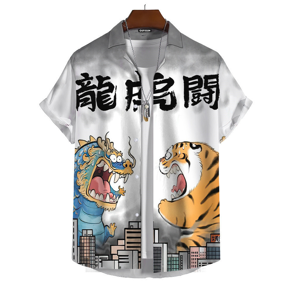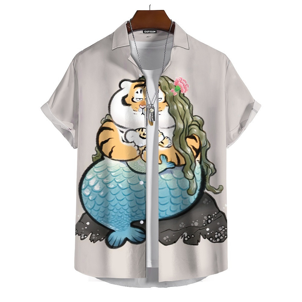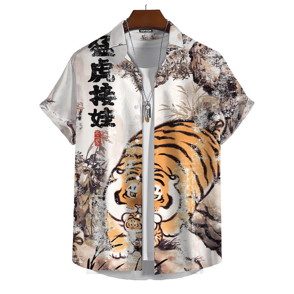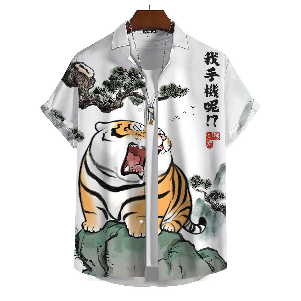 ชุดเสื้อแขนสั้นผู้ชายลายการ์ตูนเสืออ้วน Oufisun ซีรีส์ฤดูร้อนพิมพ์ย้อนยุคฮิปฮอปสตรีทดอกไม้