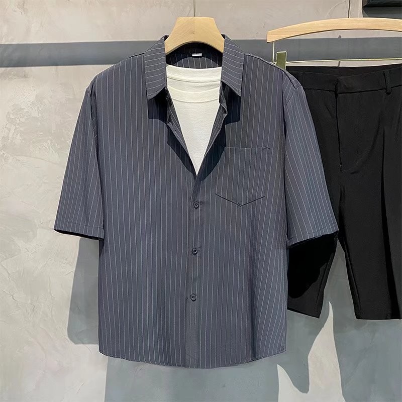 ธุรกิจแฟชั่นผ้าไหมน้ําแข็งบางลายเสื้อแขนสั้นผู้ชาย ขนาดใหญ่เกินไป หลวมระบายอากาศ