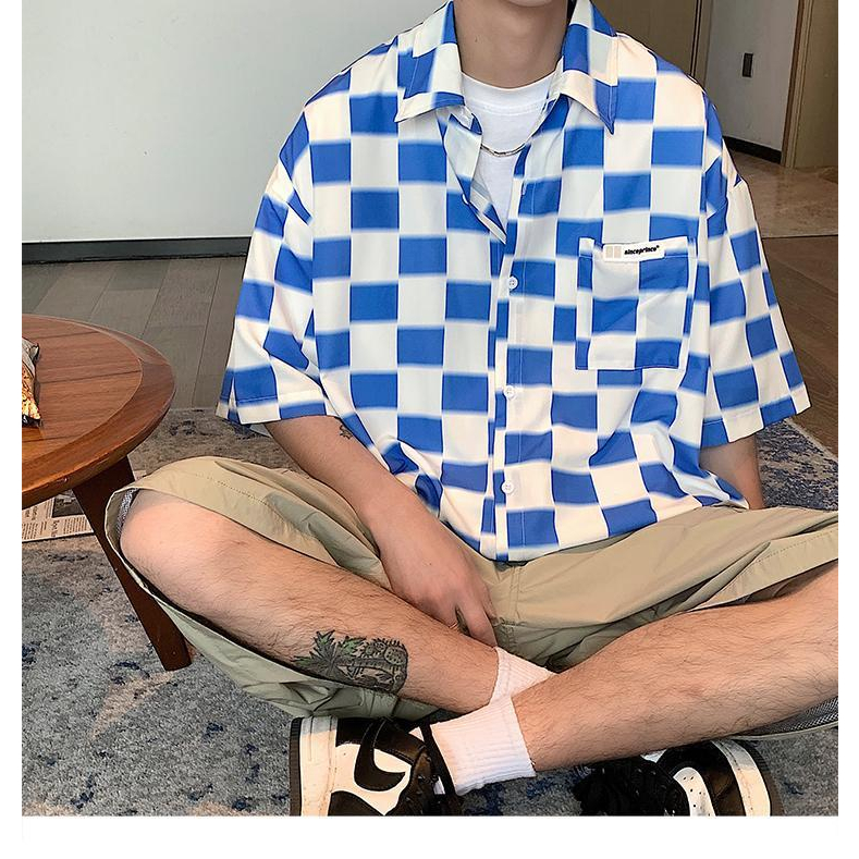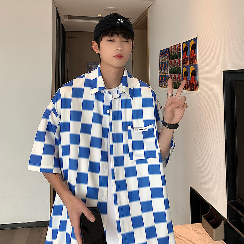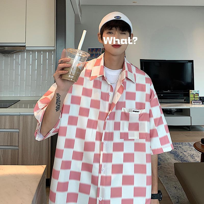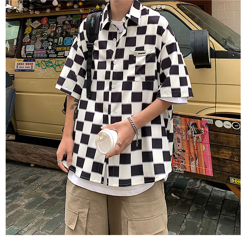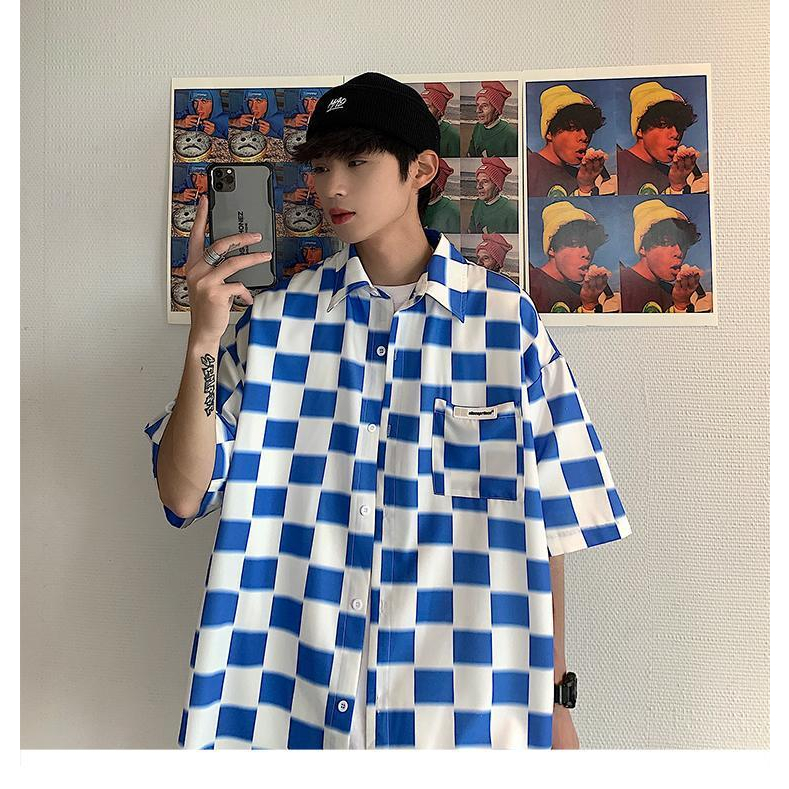 พร้อมส่ง😁CTA190😁เสื้อเชิ้ตลายสก๊อตคอปกแขนสั้นผู้ชาย oversize เสื้อแฟชั่นสไตล์เกาหลีย้อนยุค