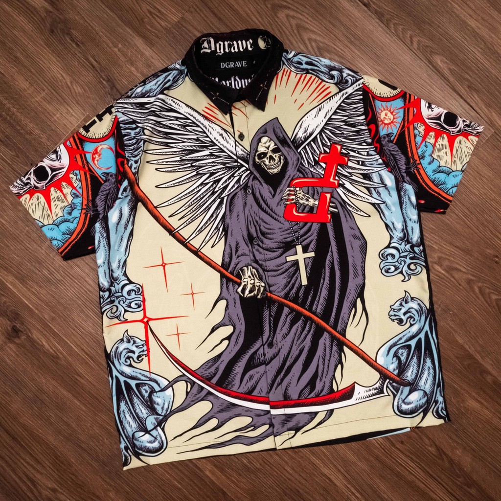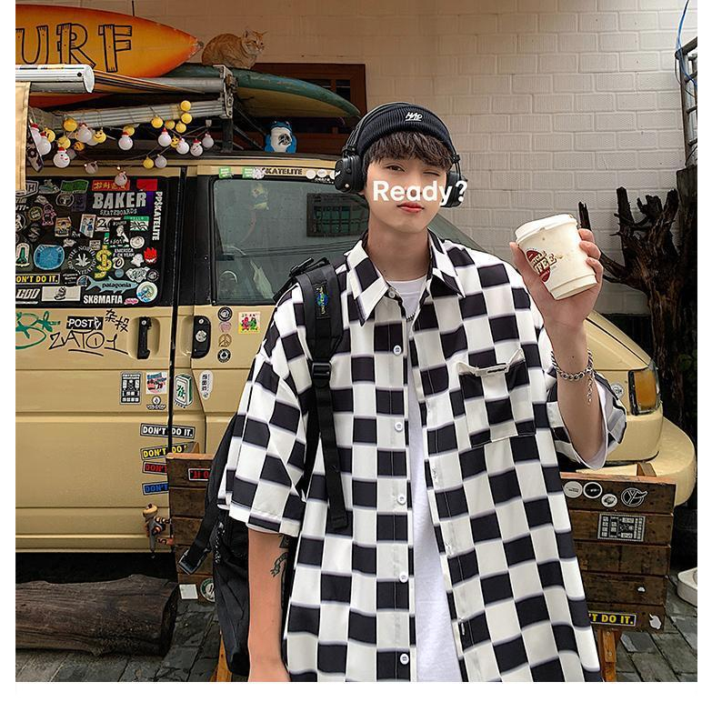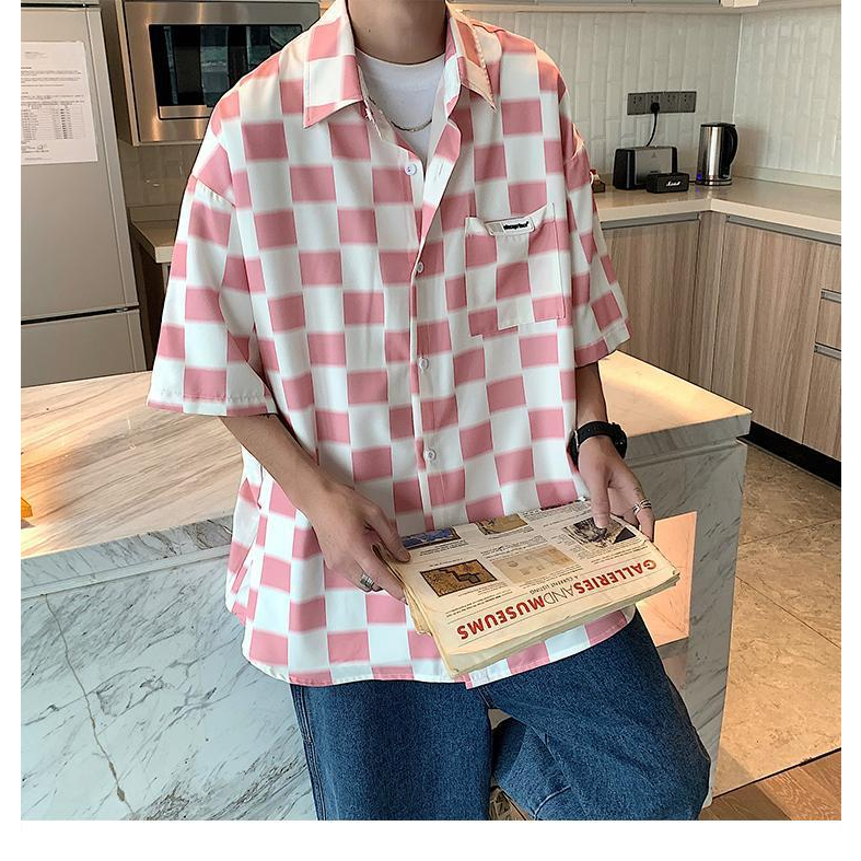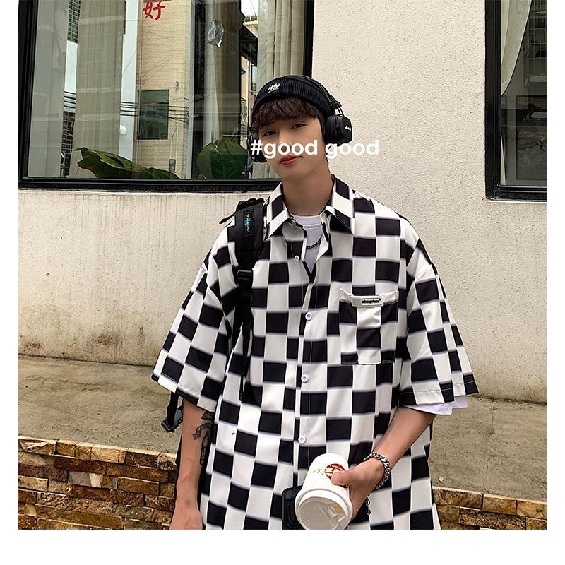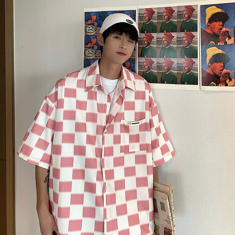 พร้อมส่ง😁CTA190😁เสื้อเชิ้ตลายสก๊อตคอปกแขนสั้นผู้ชาย oversize เสื้อแฟชั่นสไตล์เกาหลีย้อนยุค