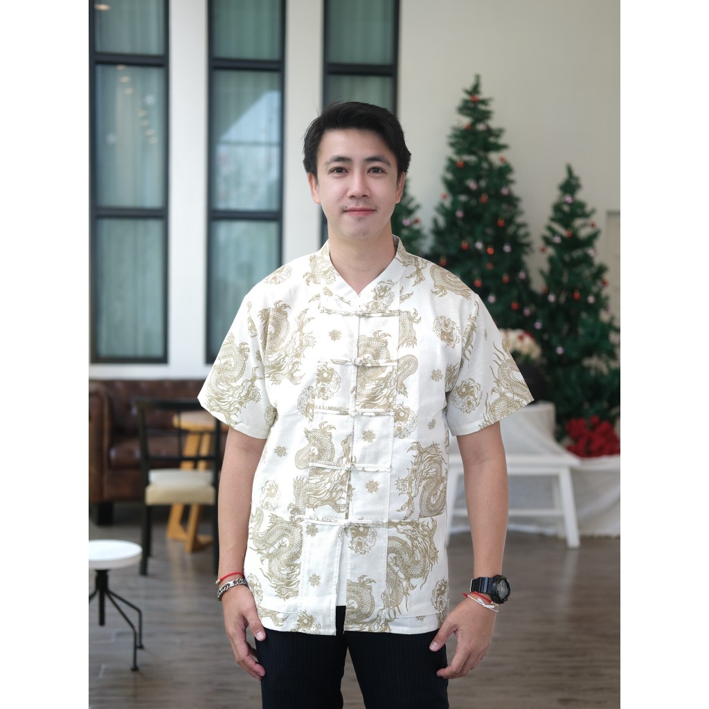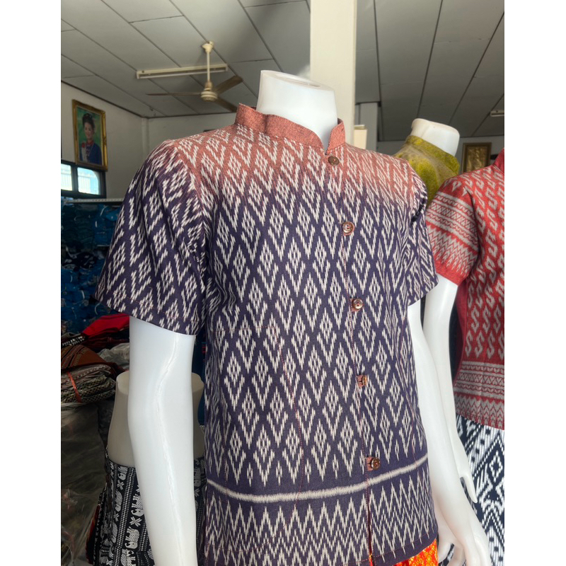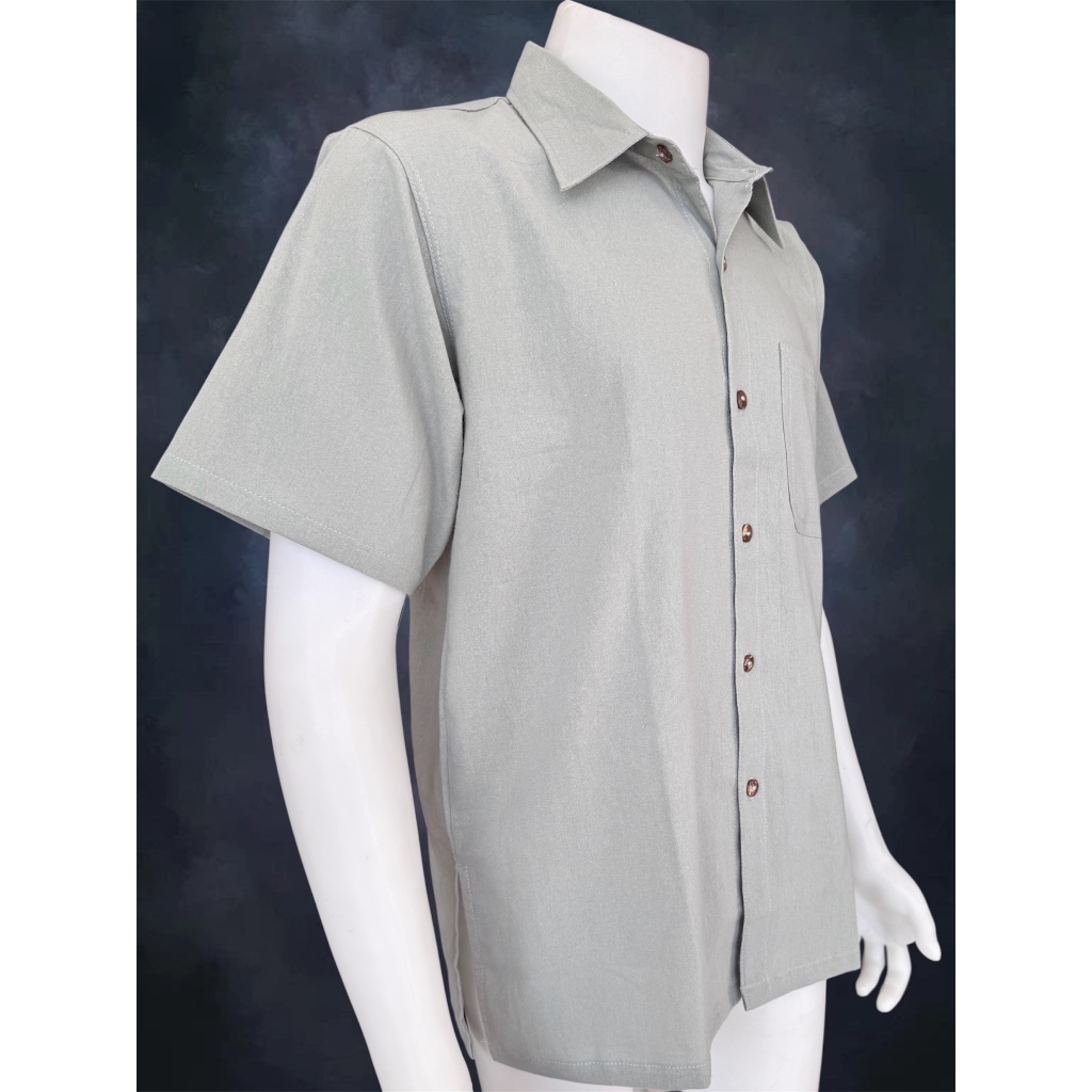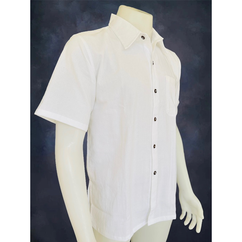 เสื้อผ้าฝ้าย ผ้าพื้นเมือง (หนังกบ) คอเชิ้ต ผ่าหน้า กระดุมกะลา แขนสั้น สีขาว