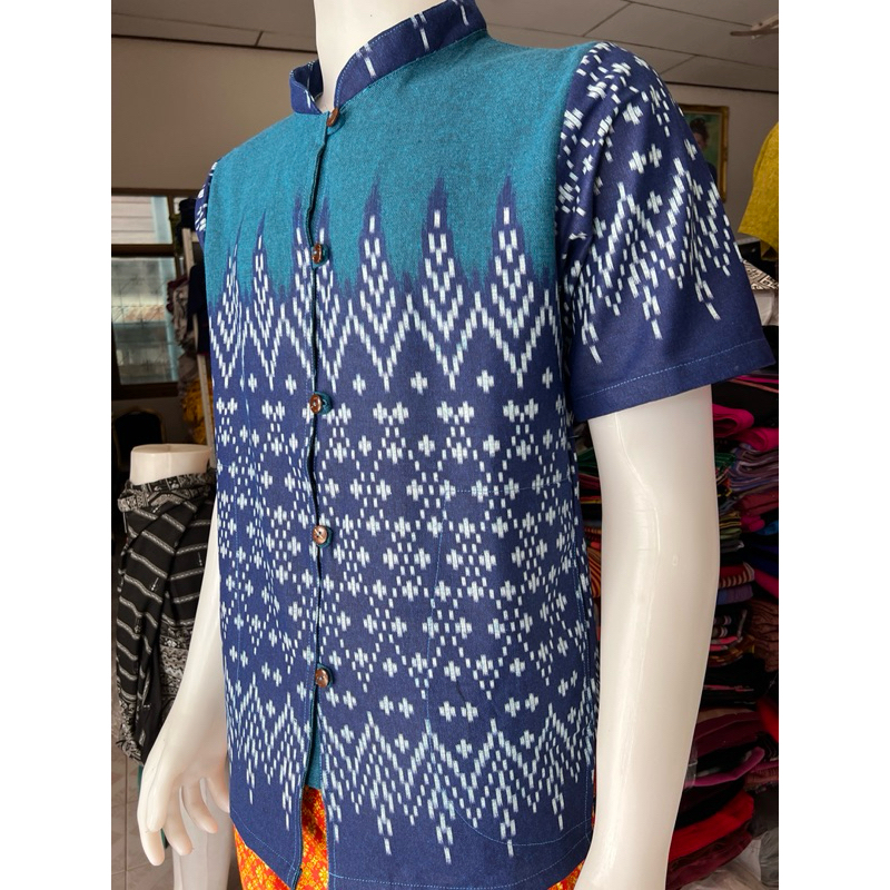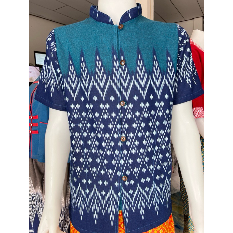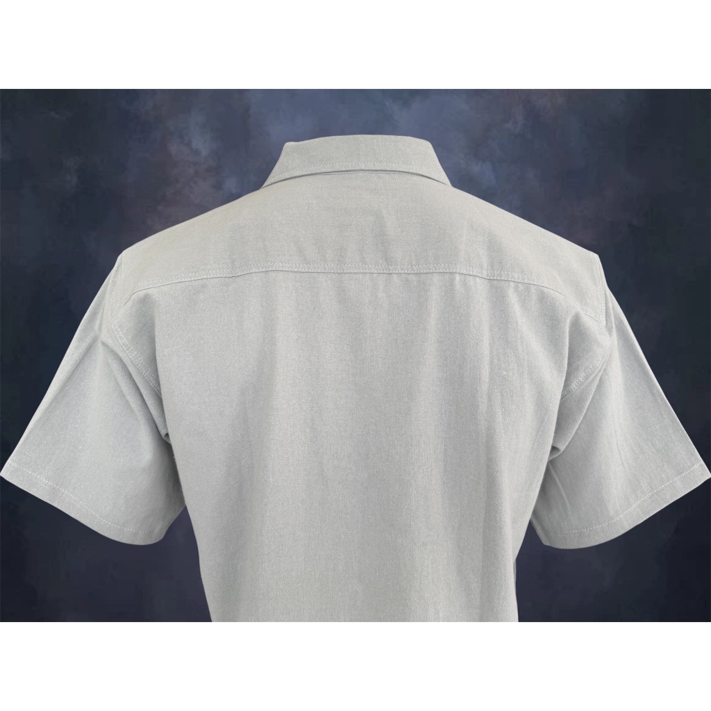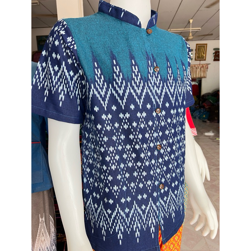 เสื้อผ้าฝ้าย ผ้าพื้นเมือง (หนังกบ) คอเชิ้ต ผ่าหน้า กระดุมกะลา แขนสั้น สีขาว