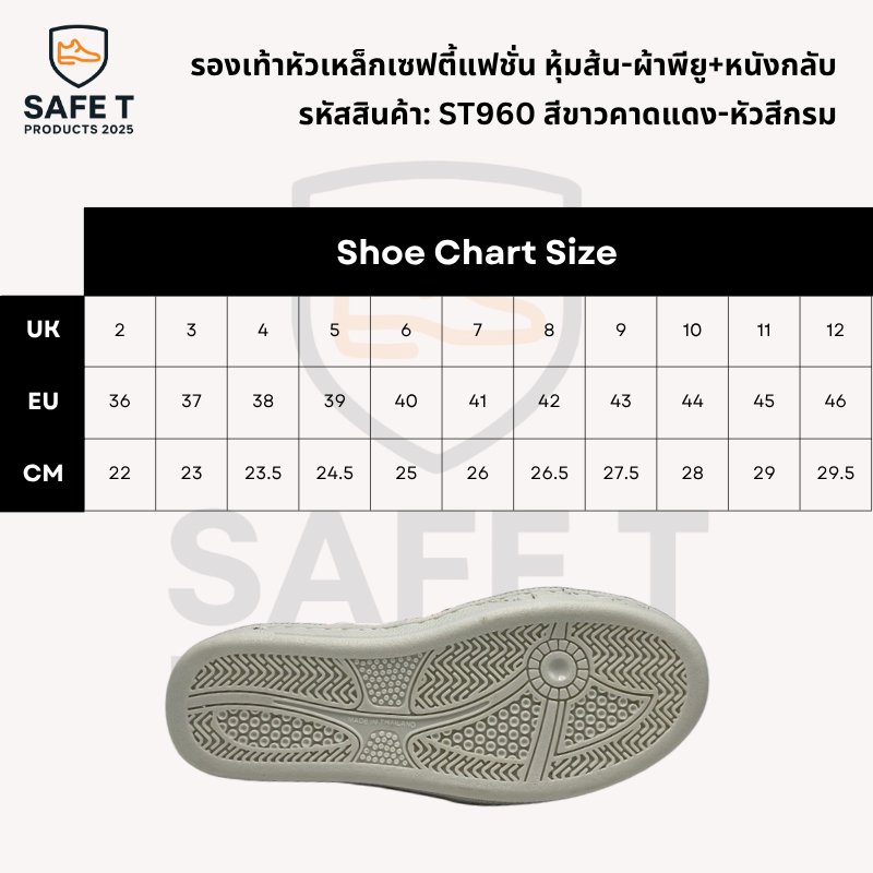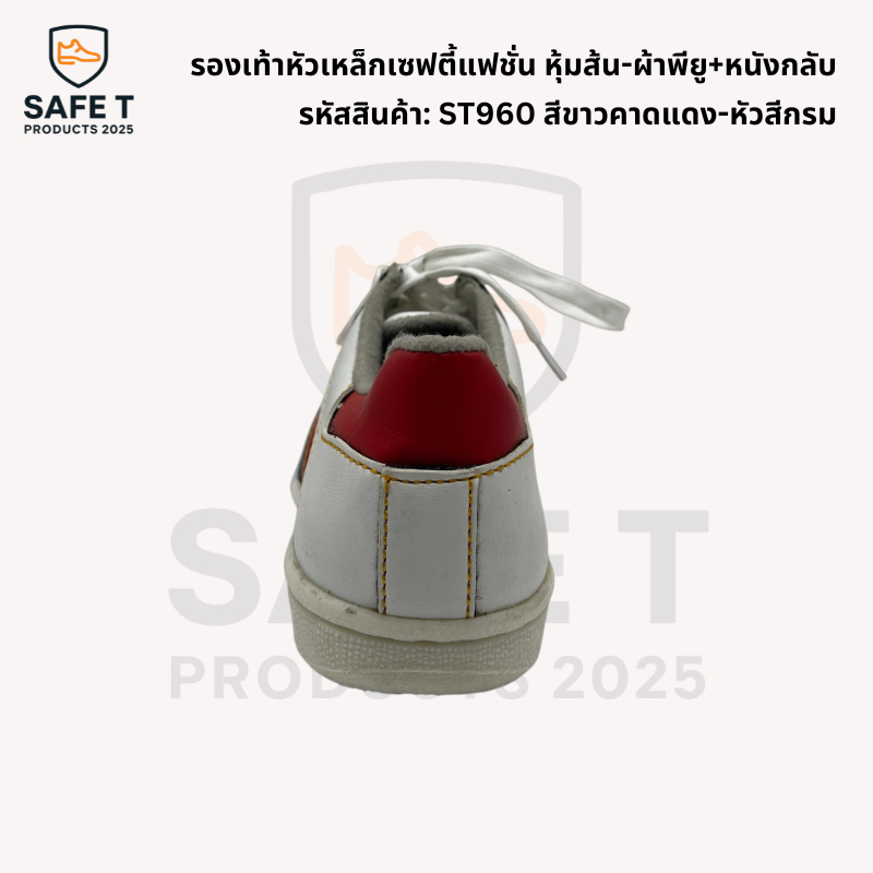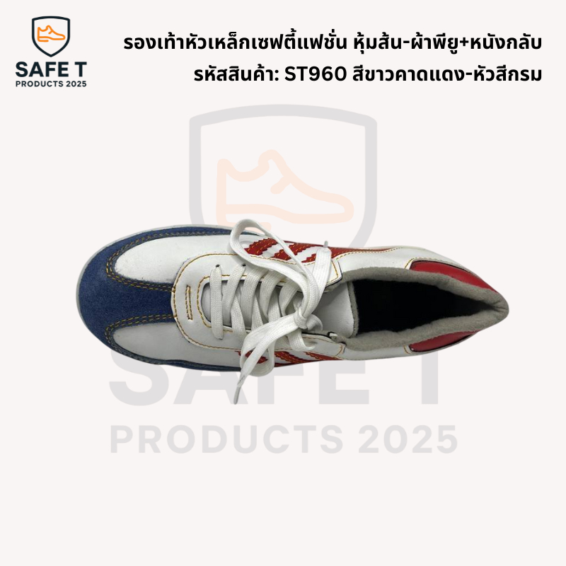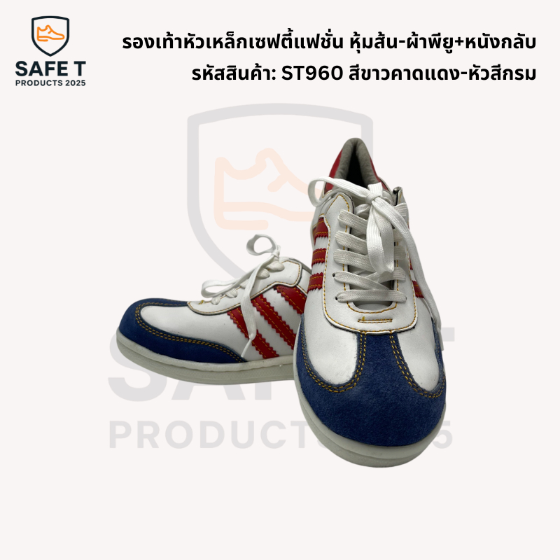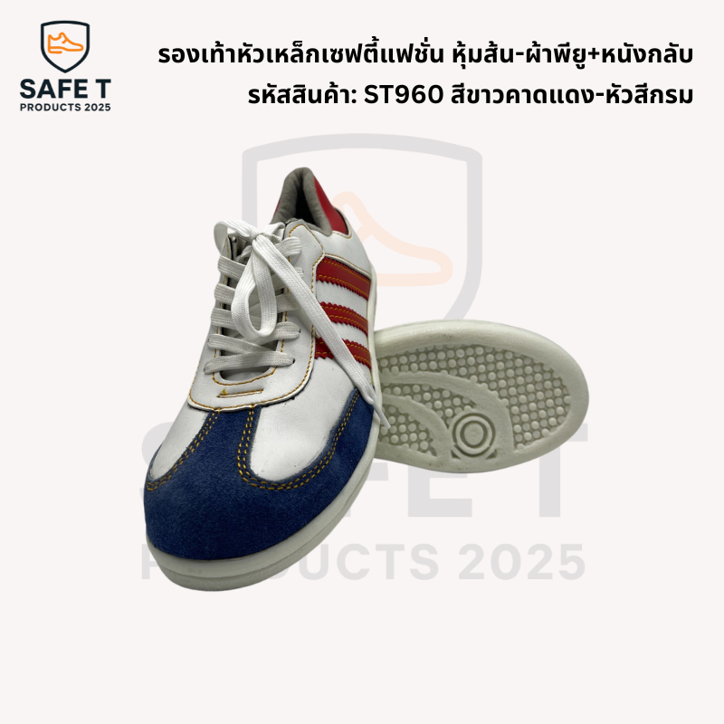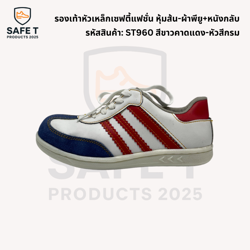 รองเท้าหัวเหล็กเซฟตี้แฟชั่น หุ้มส้น-ผ้าพียู+หนังกลับ รหัสสินค้า: ST960 สีกรมคาดแดง