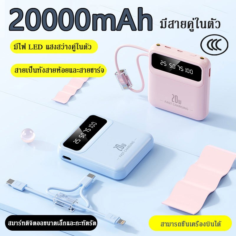 【China CCC】Power Bank 20000mAh มีสายชาร์จคู่ใช้งานได้ ไฟ LED สองดวงให้แสงสว่างมาก เหมาะสำหรับโทรศัพท์มือถือทุกรุ่น