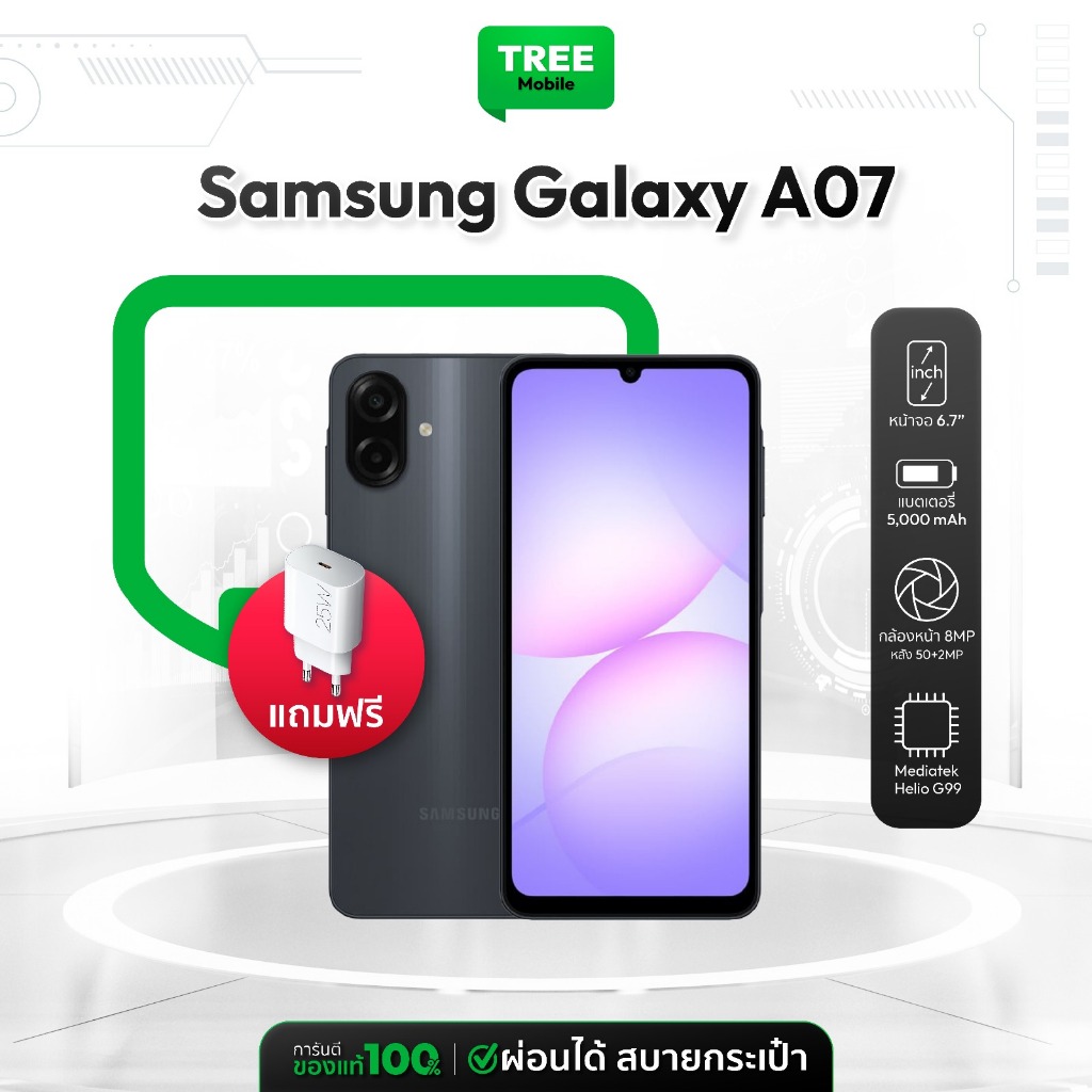 [ แถมฟรีหัวชาร์จ 25W ] มือถือ Samsung Galaxy A07 Ram 4/64GB ประกันศูนย์ ซัมซุง จอ 6.7 นิ้ว กล้อง 50MP | TreeMobile