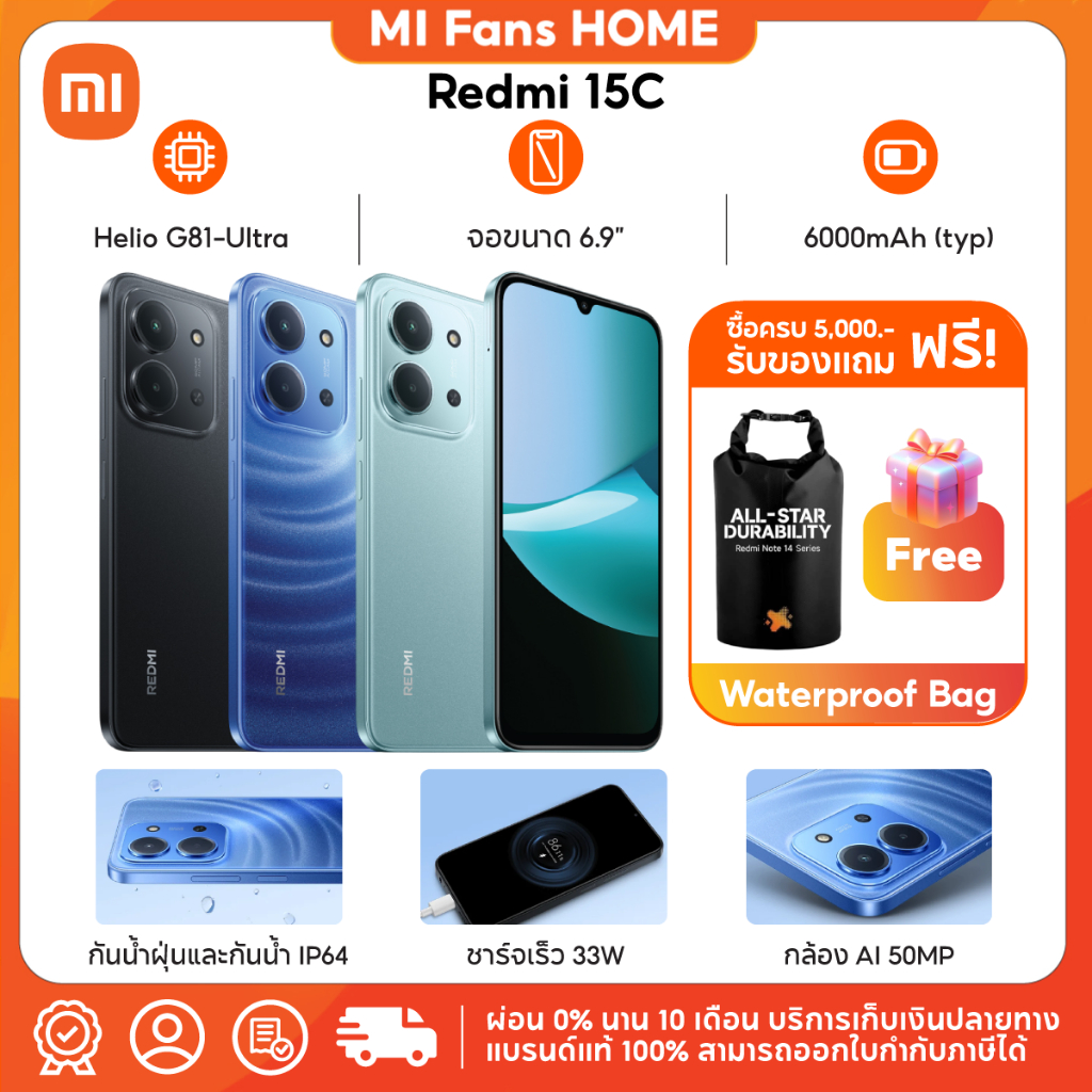 (NEW) XIAOMI Redmi 15C 4G (6+128GB/8+256GB) แบตเตอรี่ 6000mAh หน้าจอใหญ่ 6.9 นิ้ว ชาร์จเร็ว 33W กล้องคู่ AI คมชัด 50MP