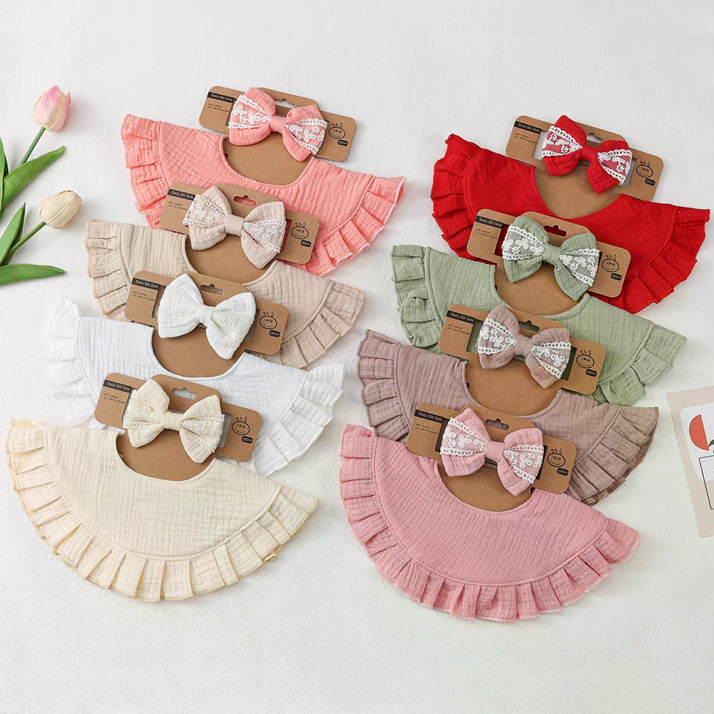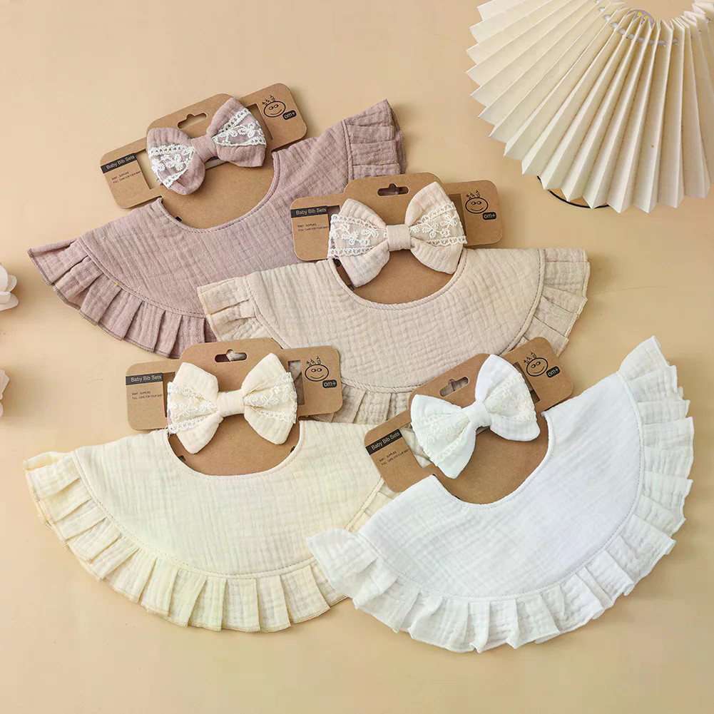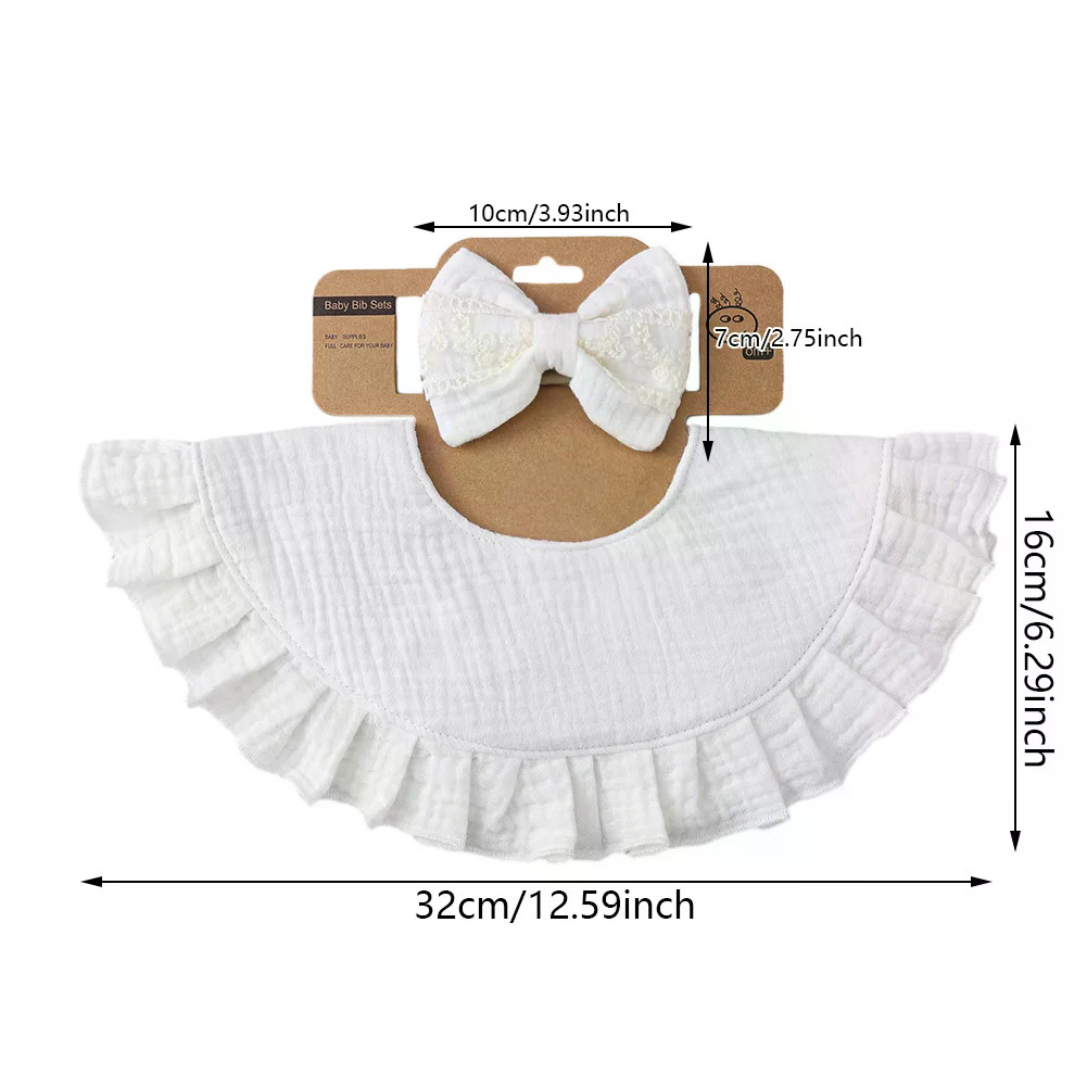 2 ชิ้น/เซ็ต Muslin Cotton Baby Bibs & Nylon Bows Hairbands Vintage Lace Headbands Princess Girls Solid Ruffled Frilly Saliva Towel