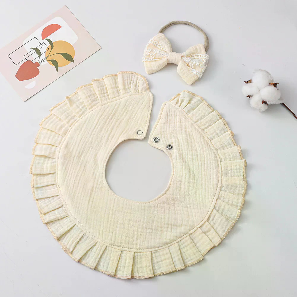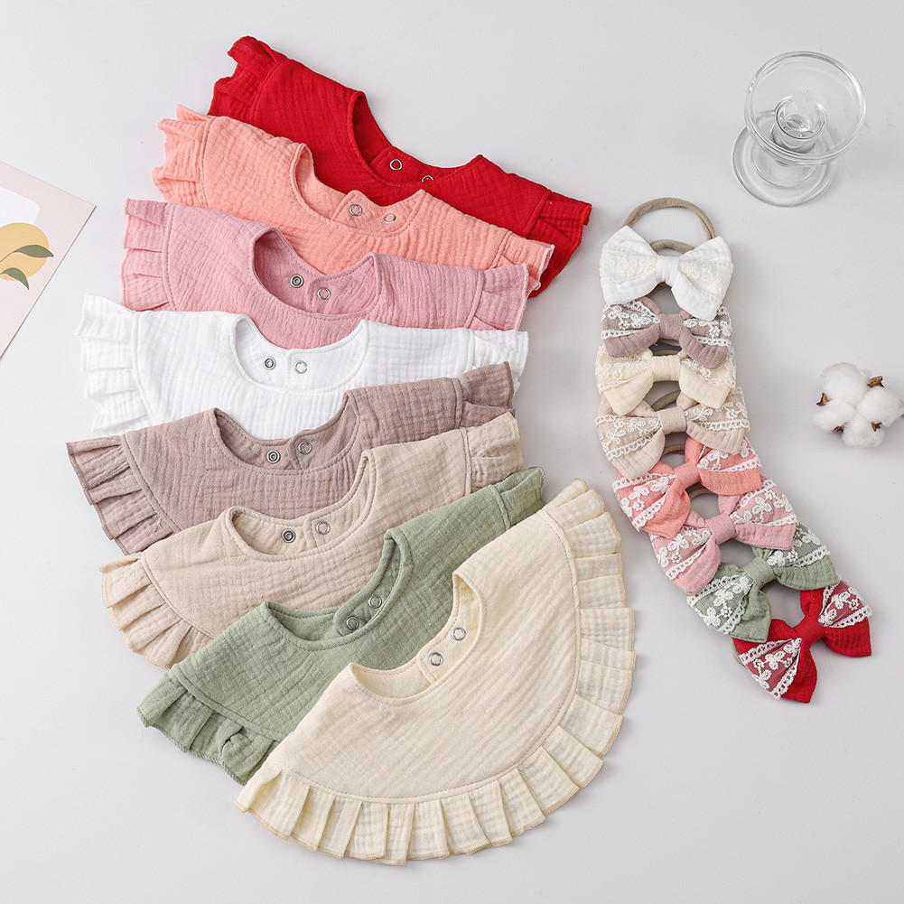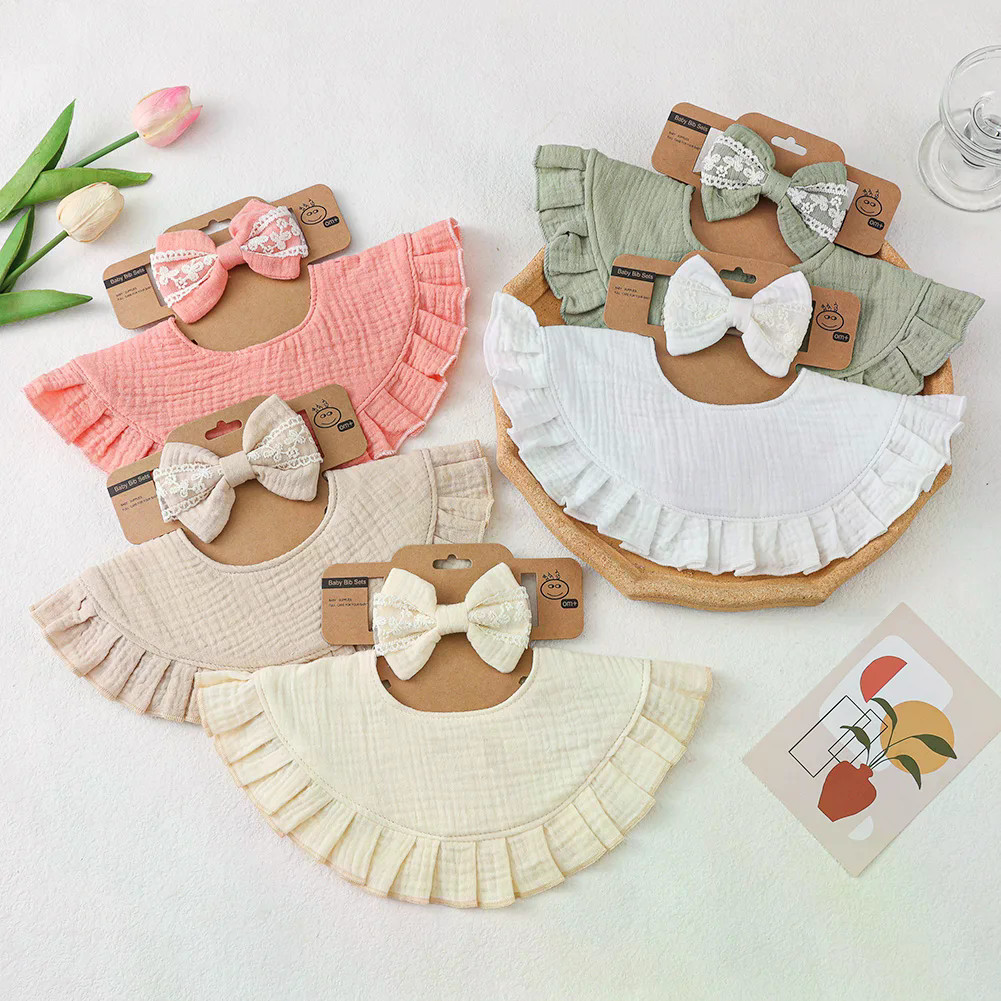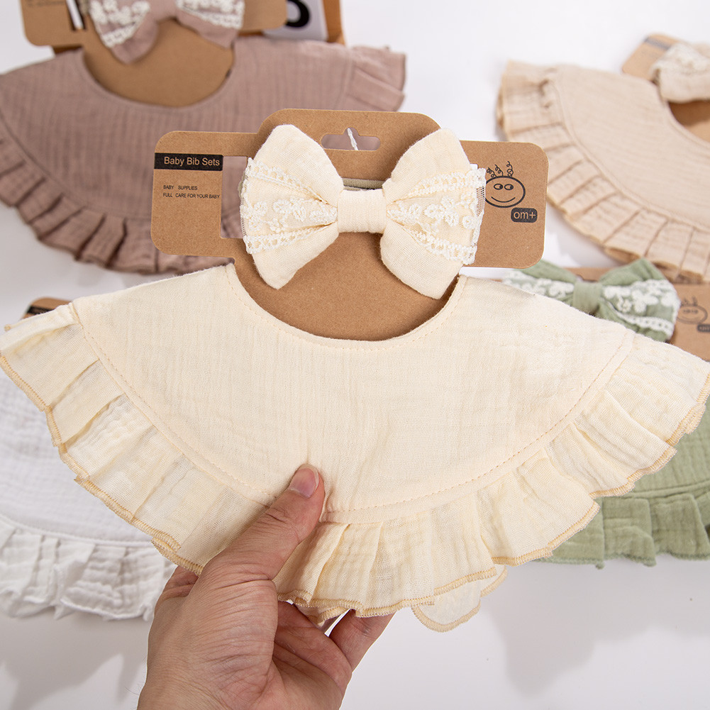 2 ชิ้น/เซ็ต Muslin Cotton Baby Bibs & Nylon Bows Hairbands Vintage Lace Headbands Princess Girls Solid Ruffled Frilly Saliva Towel