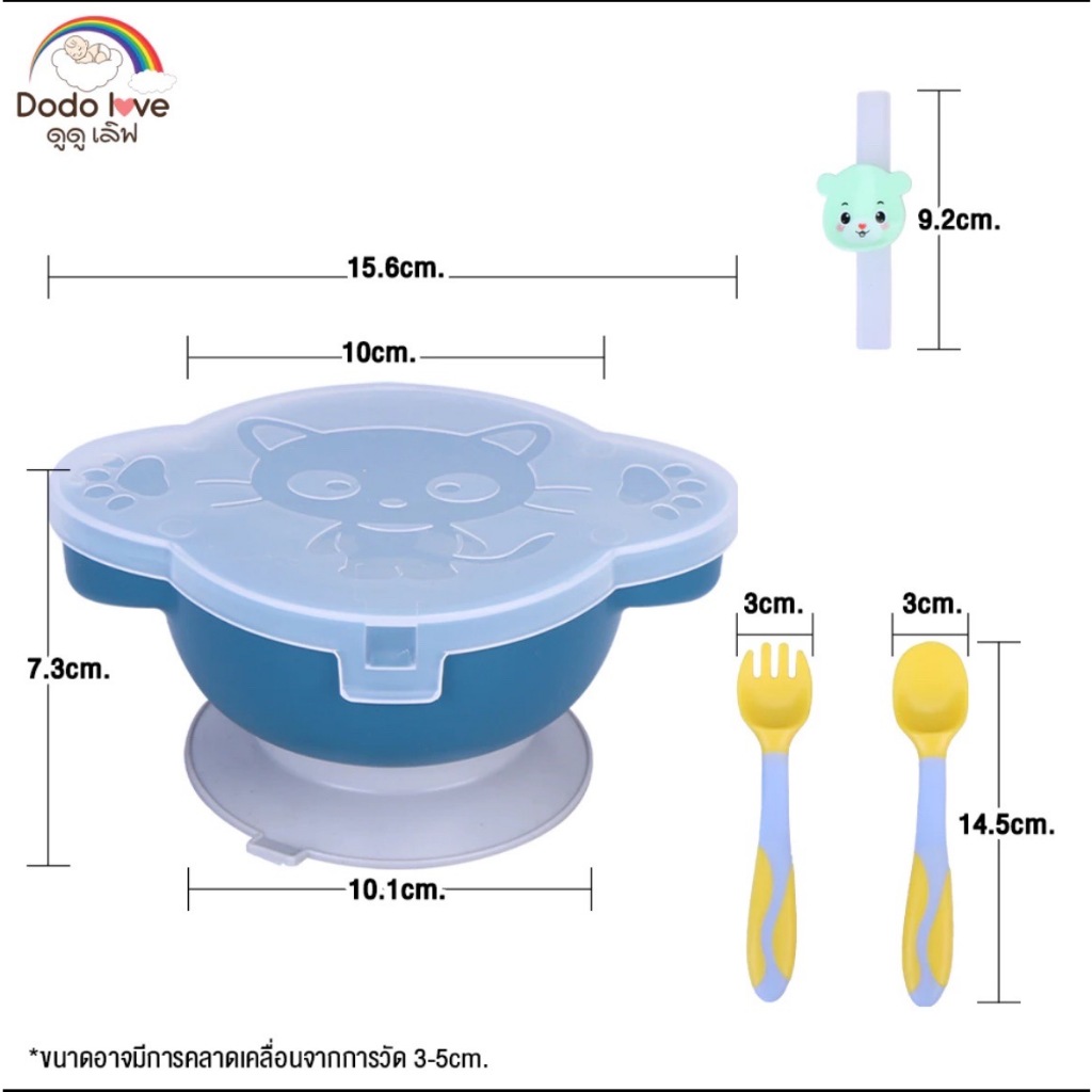 ชามข้าวเด็ก (Ab53) – เซ็ตชามข้าวเด็กก้นดูดมีฝาปิด พร้อมช้อนส้อม+หลอดดูดซุป