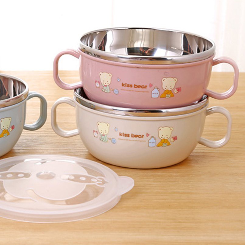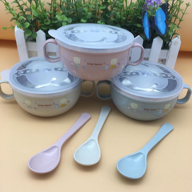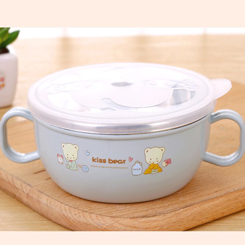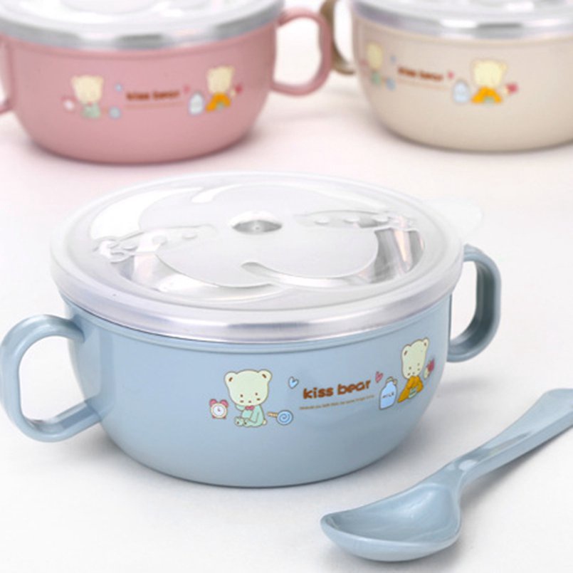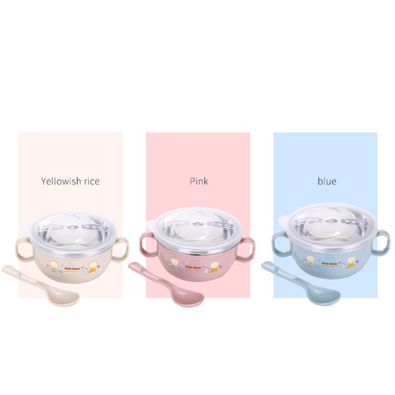 โรงเรียนอนุบาล ชามสเตนเลส 304 กันความร้อน แบบมีฝาปิดและช้อน สำหรับป้อนข้าวเด็ก