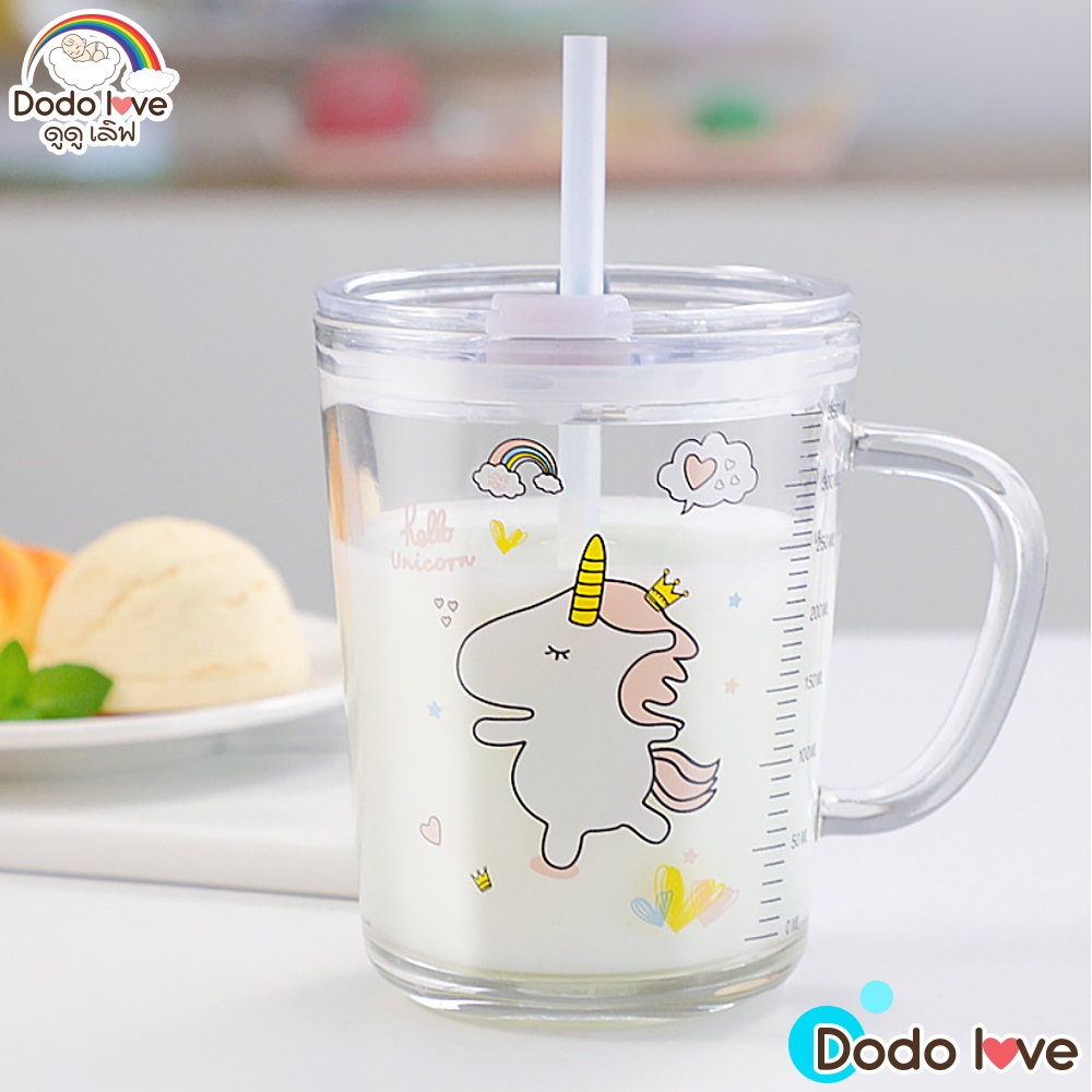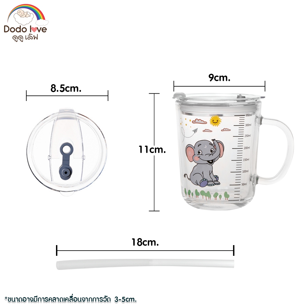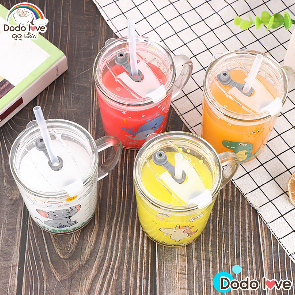 แก้วน้ำใส พร้อมหลอดดูด แก้วน้ำสำหรับเด็กมีฝาปิดขอบยางซิลิโคนจุกปิด 350 ml. แก้วใส หนาพิเศษ พร้อมฝาปิด แก้วกันหก