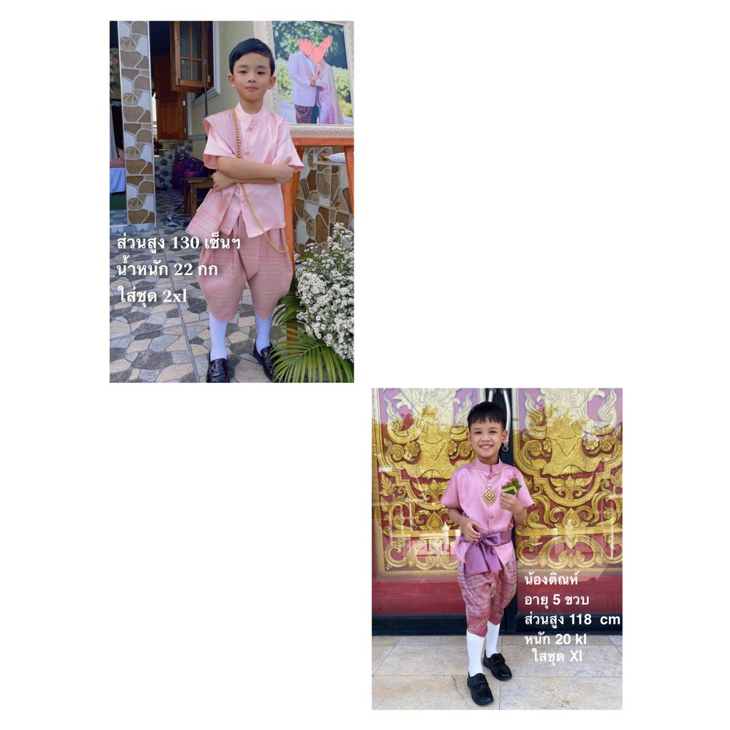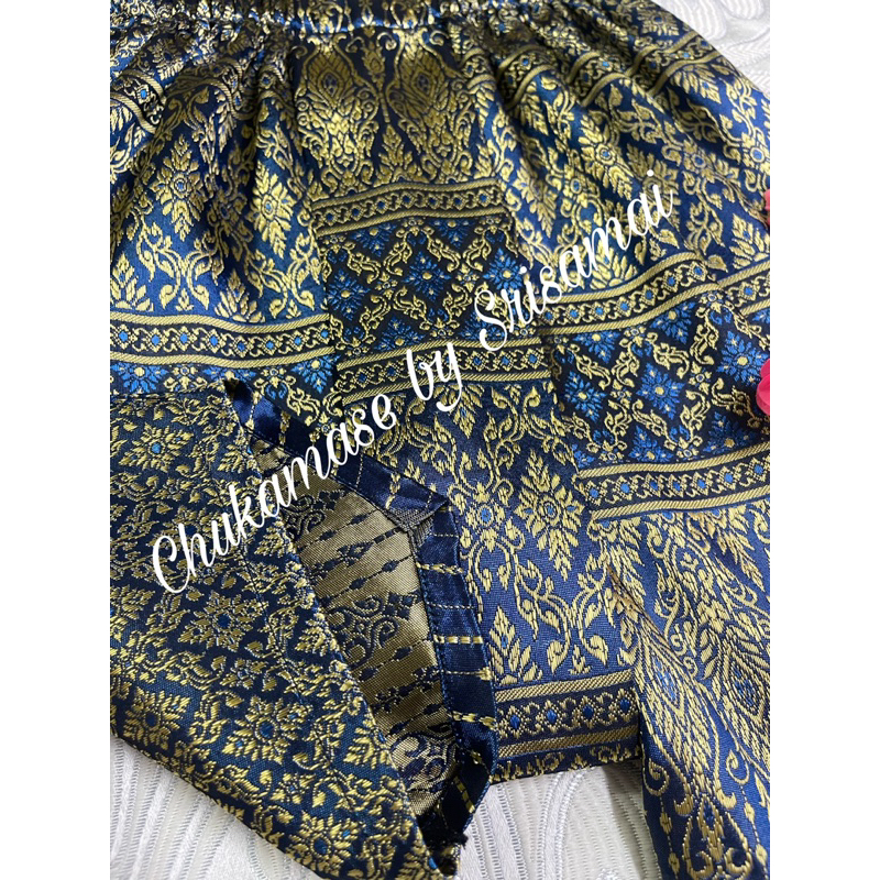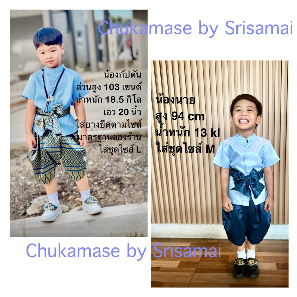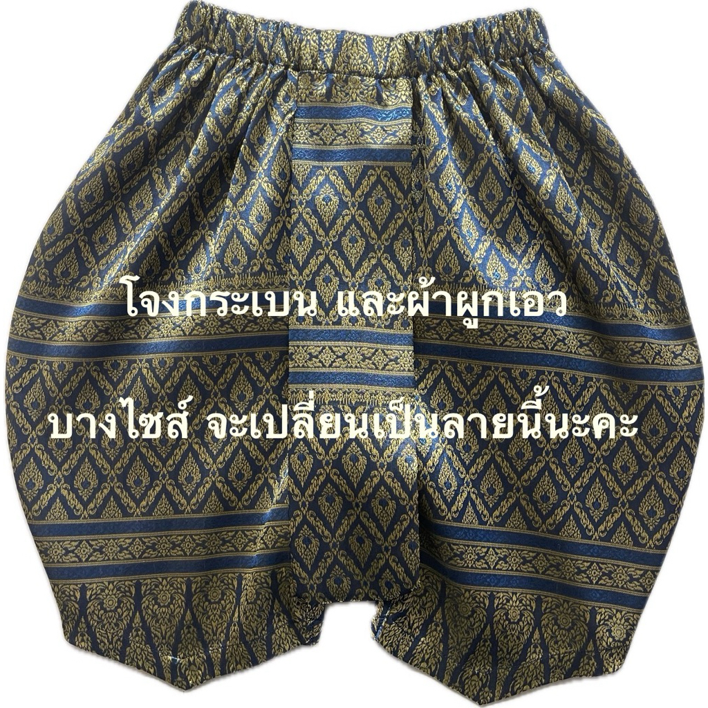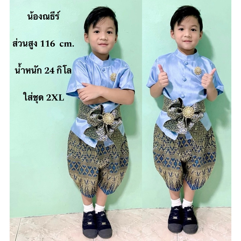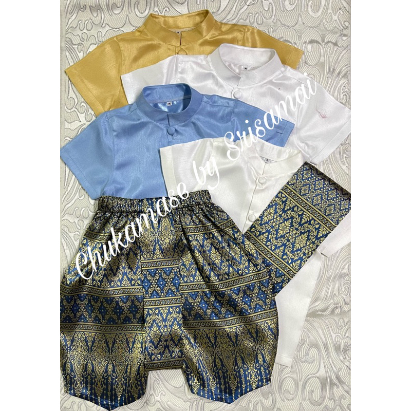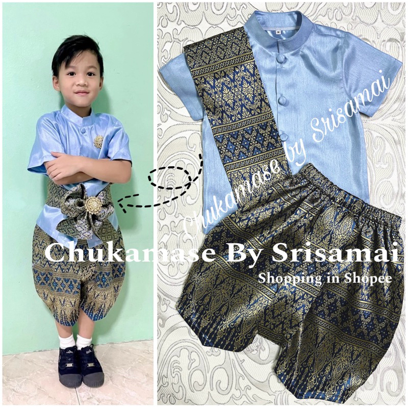 ชุดไทยเด็กผู้ชายใช้ผ้าไหมอิตาลีสีฟ้า โจงกระเบนผ้าไหมไทยทอลายสีน้ำเงิน ผ้าจะเปลี่ยนไปตามลายของผ้าที่ทางร้านมี ณ ปัจจุบัน