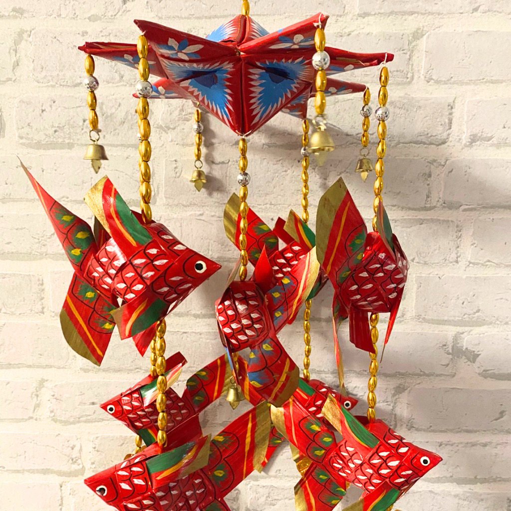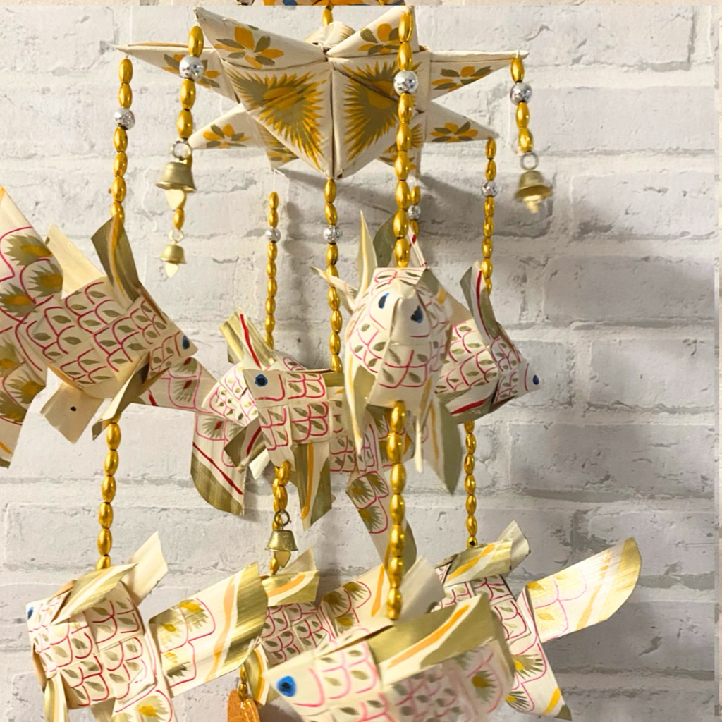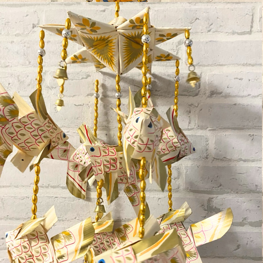 โมบาย ปลาตะเพียนสานใบลาน รุ่นกระโจม ลูกปลา 9 ตัว มีลูกปัด กระดิ่งสีทอง
