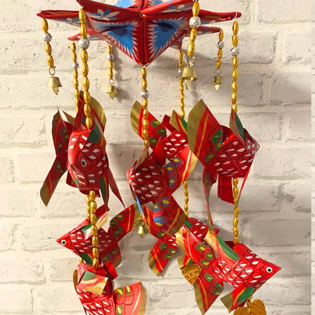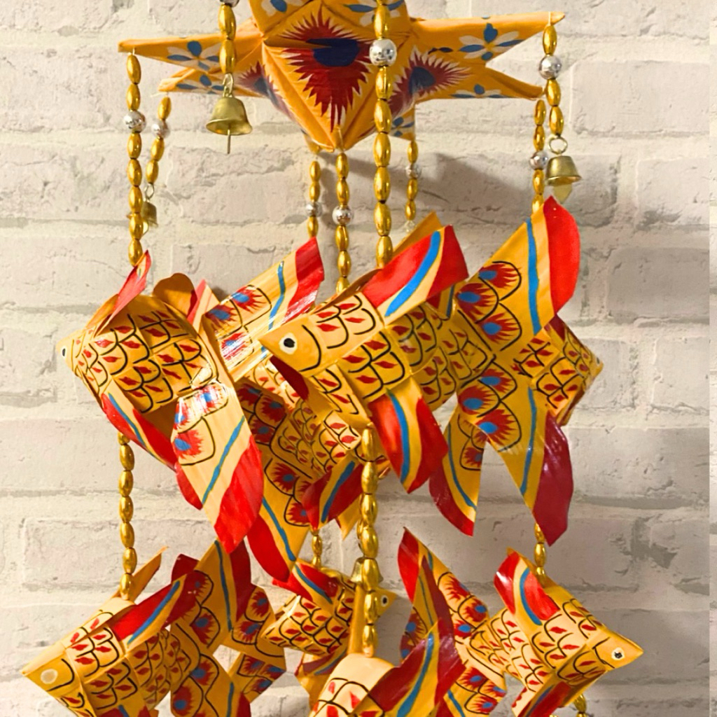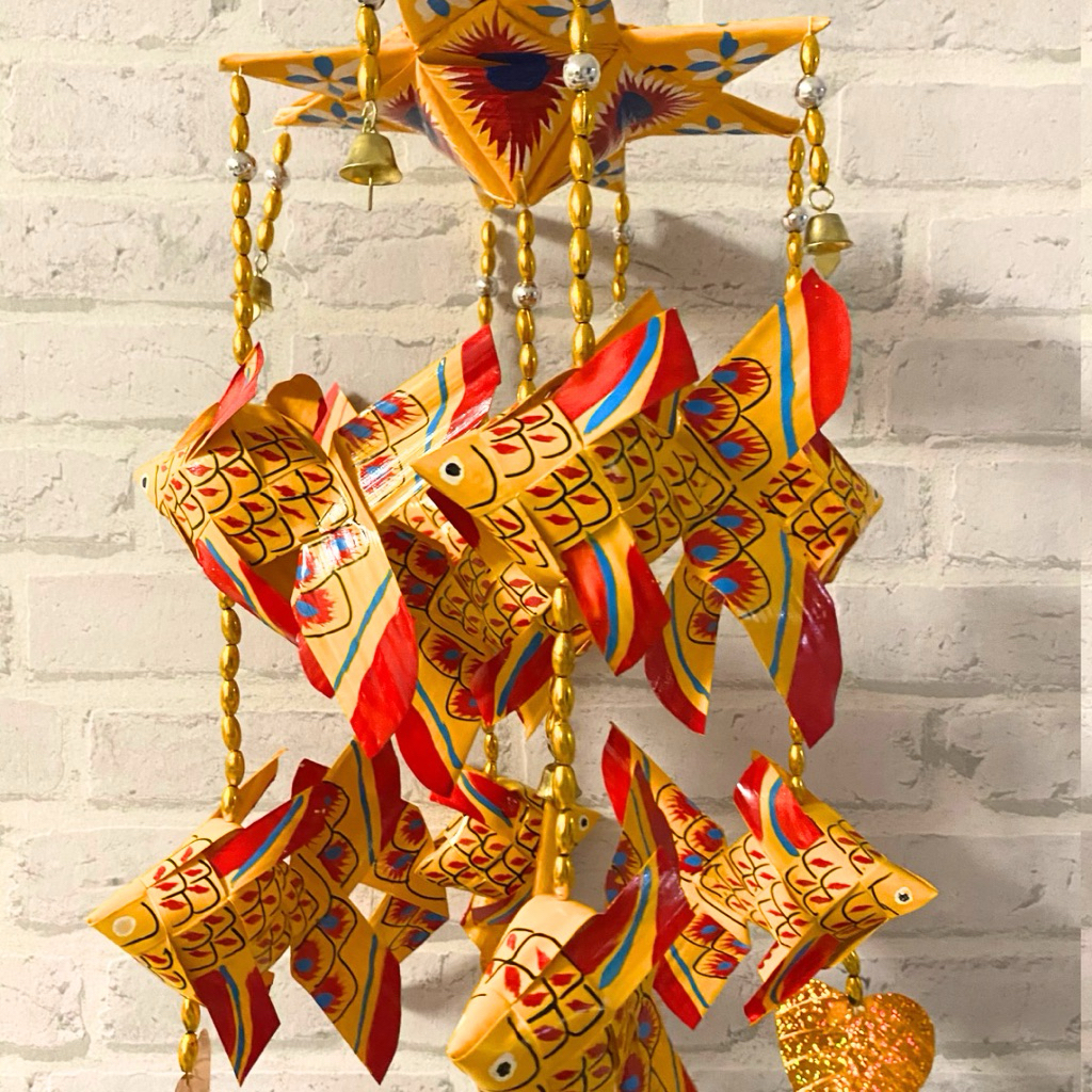 โมบาย ปลาตะเพียนสานใบลาน รุ่นกระโจม ลูกปลา 9 ตัว มีลูกปัด กระดิ่งสีทอง