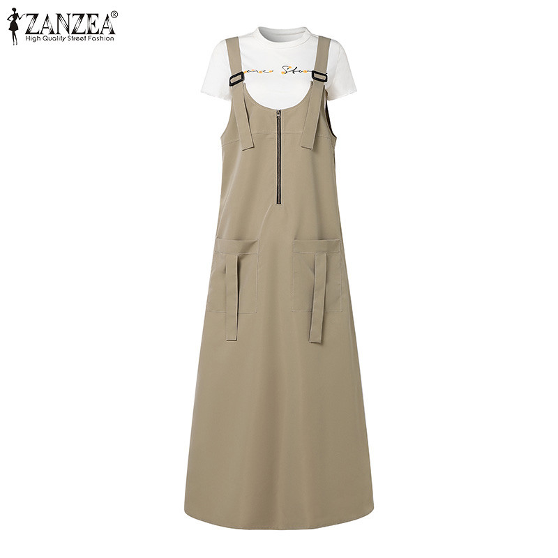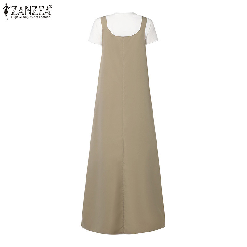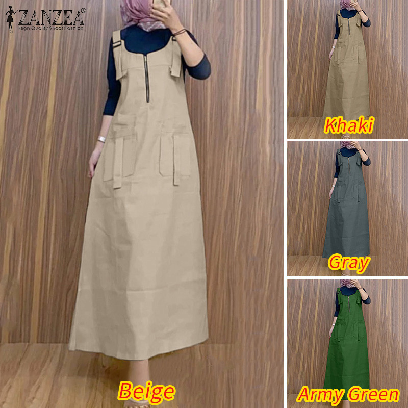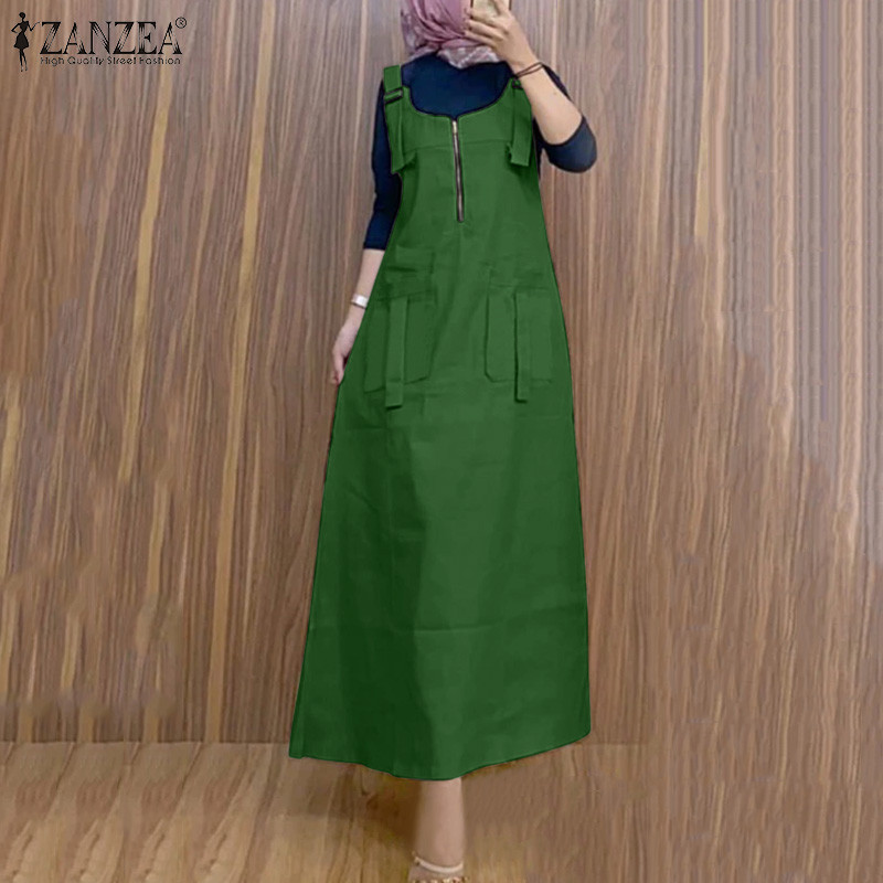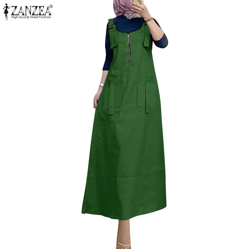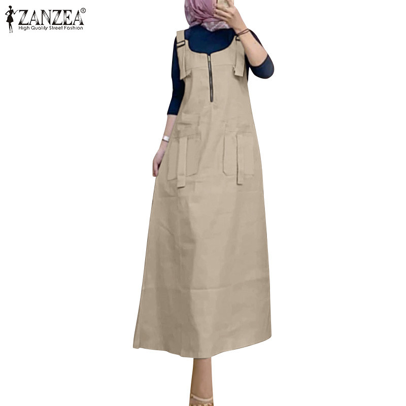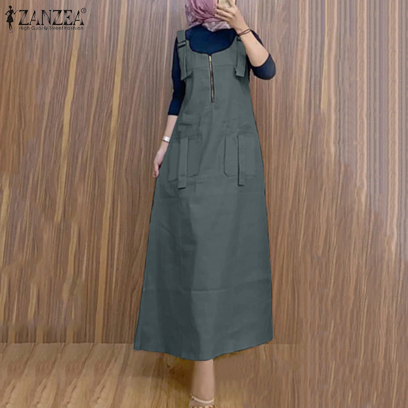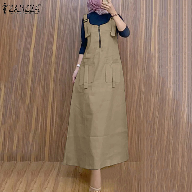 ZANZEA ใส่ ซานเซีย ผู้หญิงมุสลิมแข็ง ยู คอแขนกุดแฟชั่น ชุดเอี๊ยม ชุดแขวน