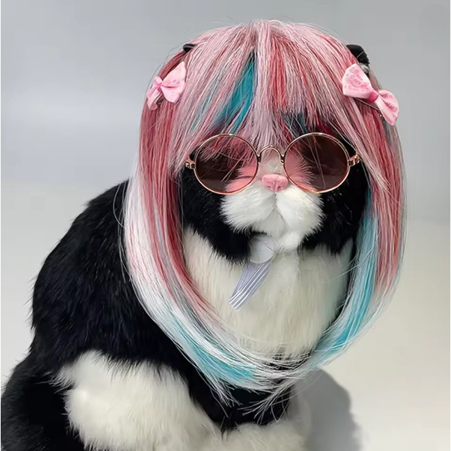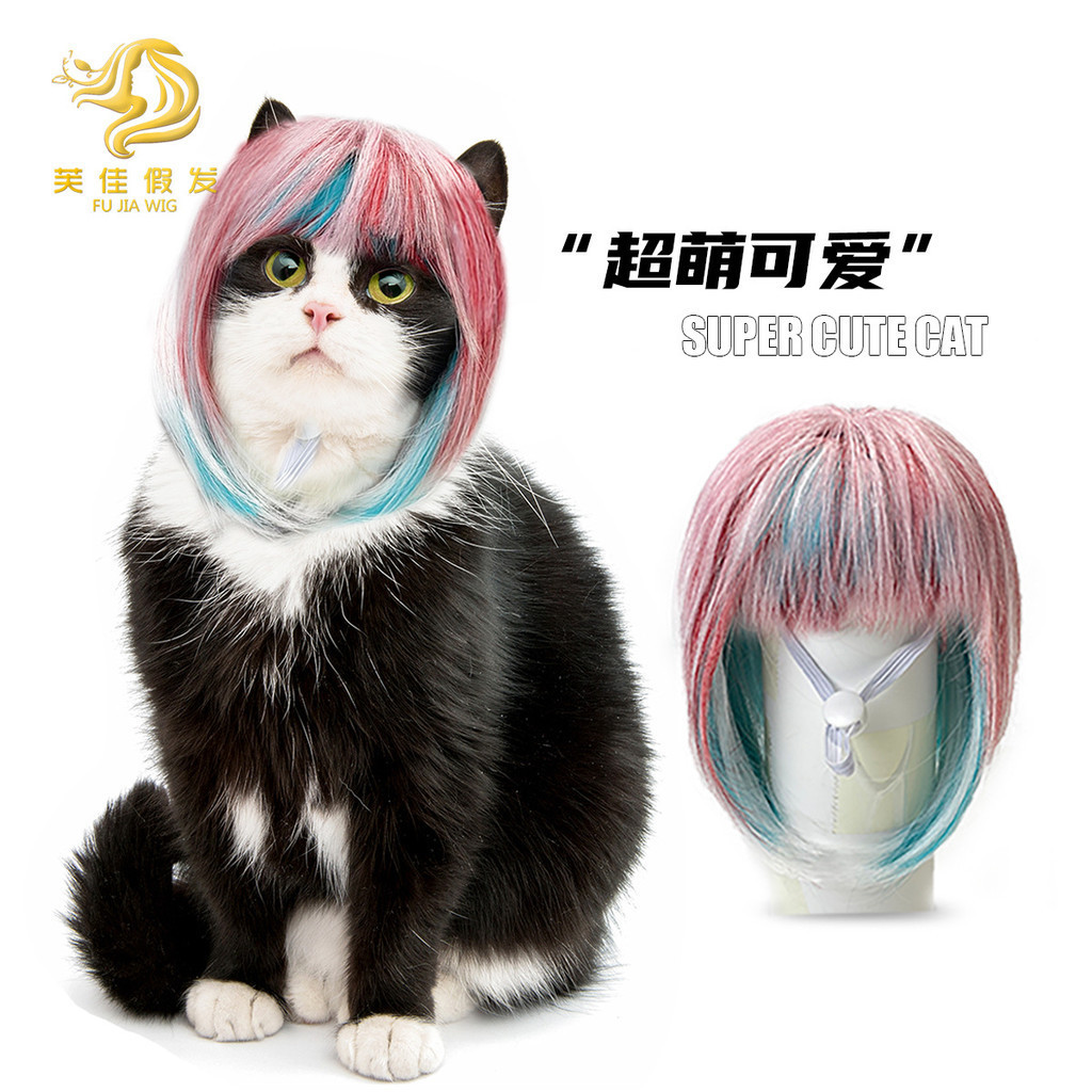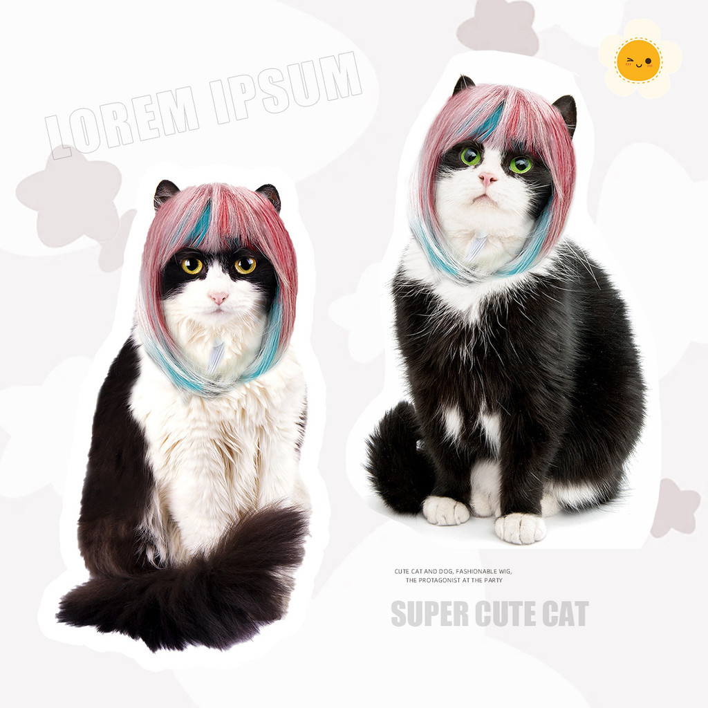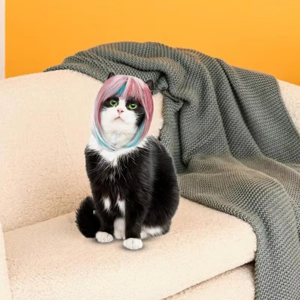 วิกผมสุนัขแมวสัตว์เลี้ยงวิกผมแมวหลากสีผมยาวตรงสีฟ้าสีชมพูสไตล์แมวน่ารัก
