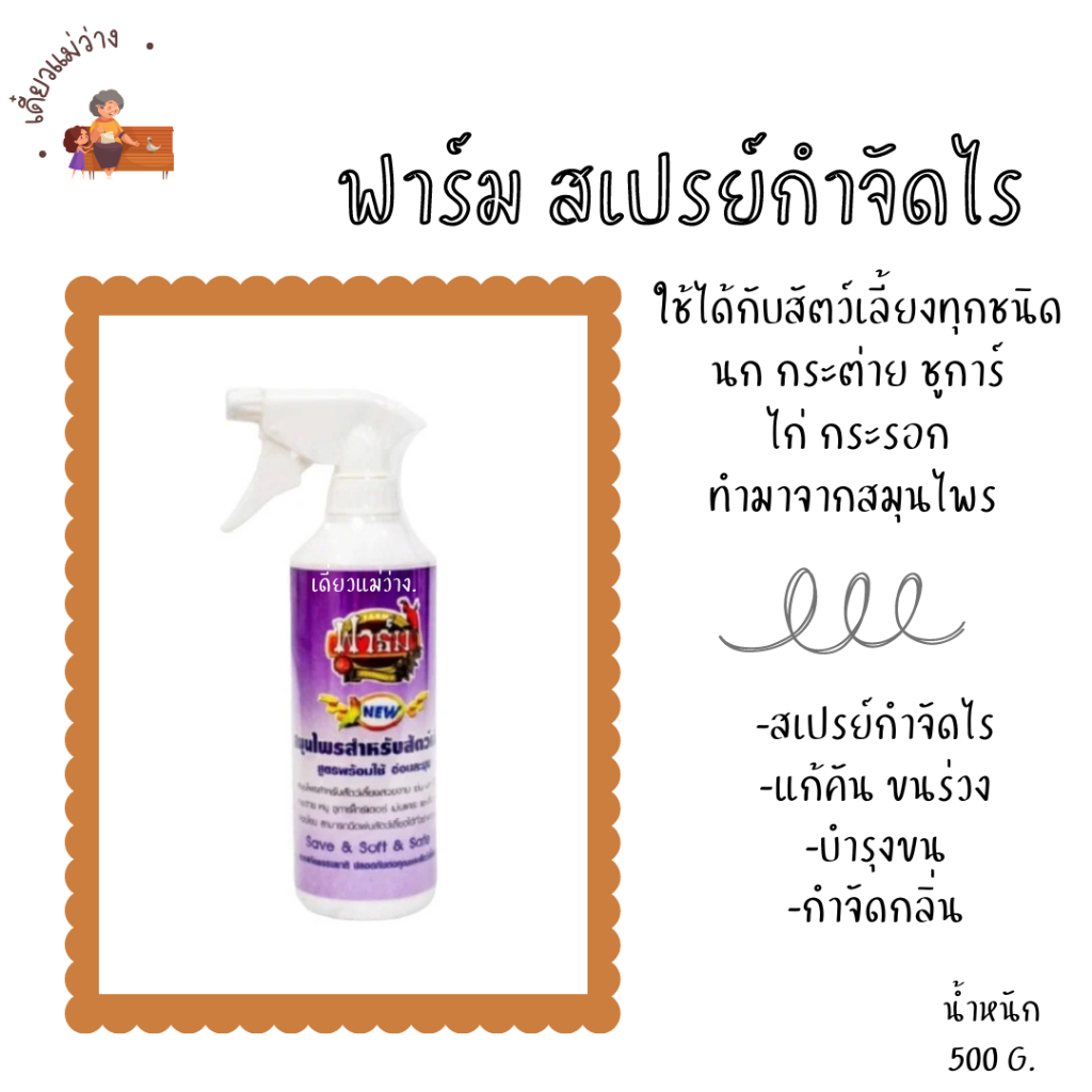 ฟาร์ม สเปรย์กำจัดไร (500 G.)ใช้ได้กับสัตว์เลี้ยงทุกชนิด นก กระต่าย ชูการ์ ไก่ กระรอก