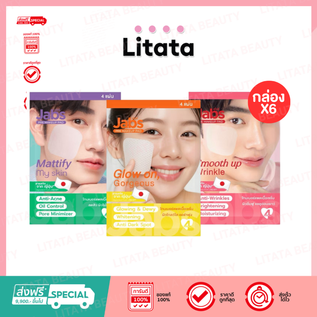 [กล่อง x6] Jabs Pre Make Up Pad Glow on, Gorgeou/Smooth Up Wrinkle/Mattify My Skin แจ๊บส์ พรี เมคอัพ 4 แผ่น
