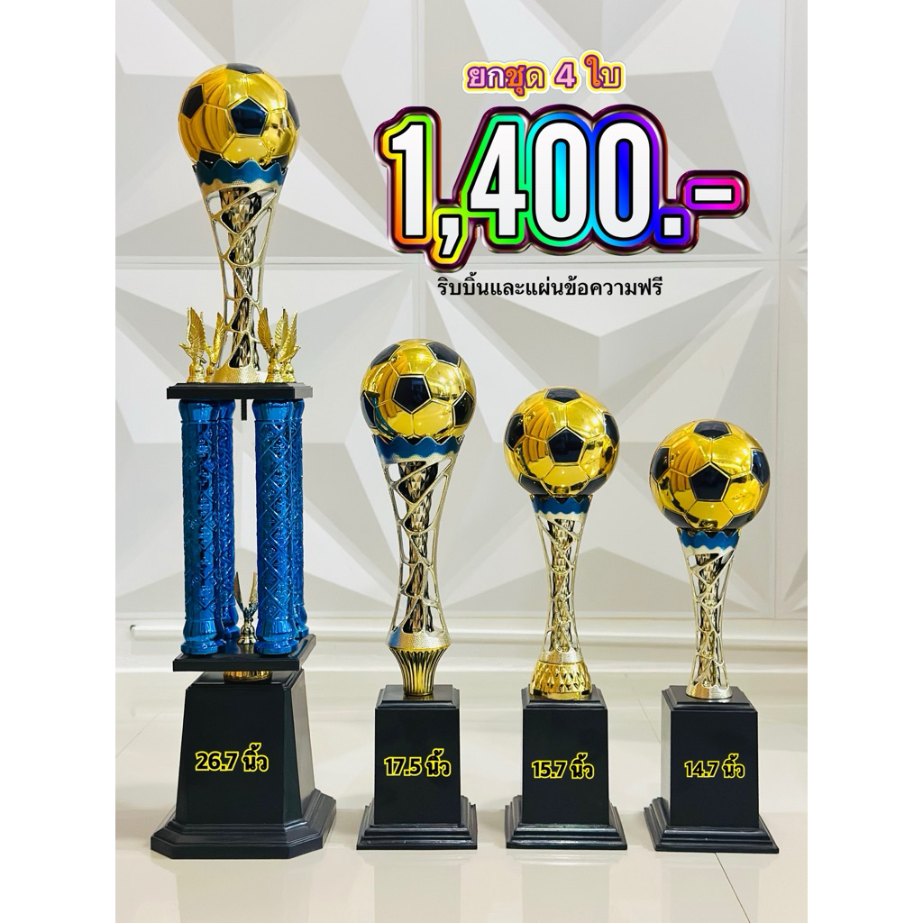 #ถ้วยรางวัลฟุตบอล ชุดเสาน้ำเงินตัวฉลุ+ ลูกบอลใหญ่ (ข้อความและริบบิ้นฟรี)
