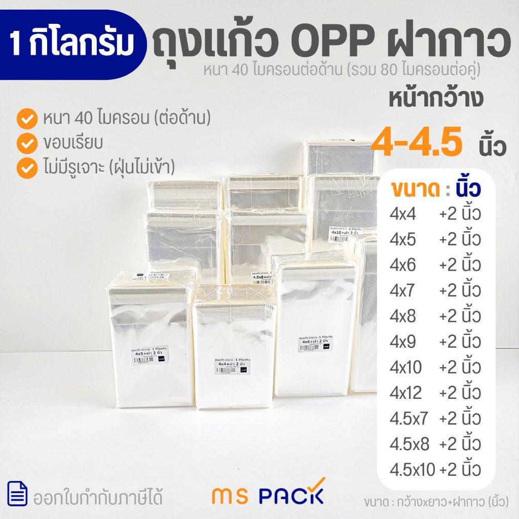 (4-4.5 นิ้ว -1 กิโลกรัม) ถุงแก้วฝากาว แถบกาว ซองใส OPP ขนาด กว้าง 4-4.5 นิ้ว (แพ็ค 1 กิโลกรัม) หนา 40 ไมครอน