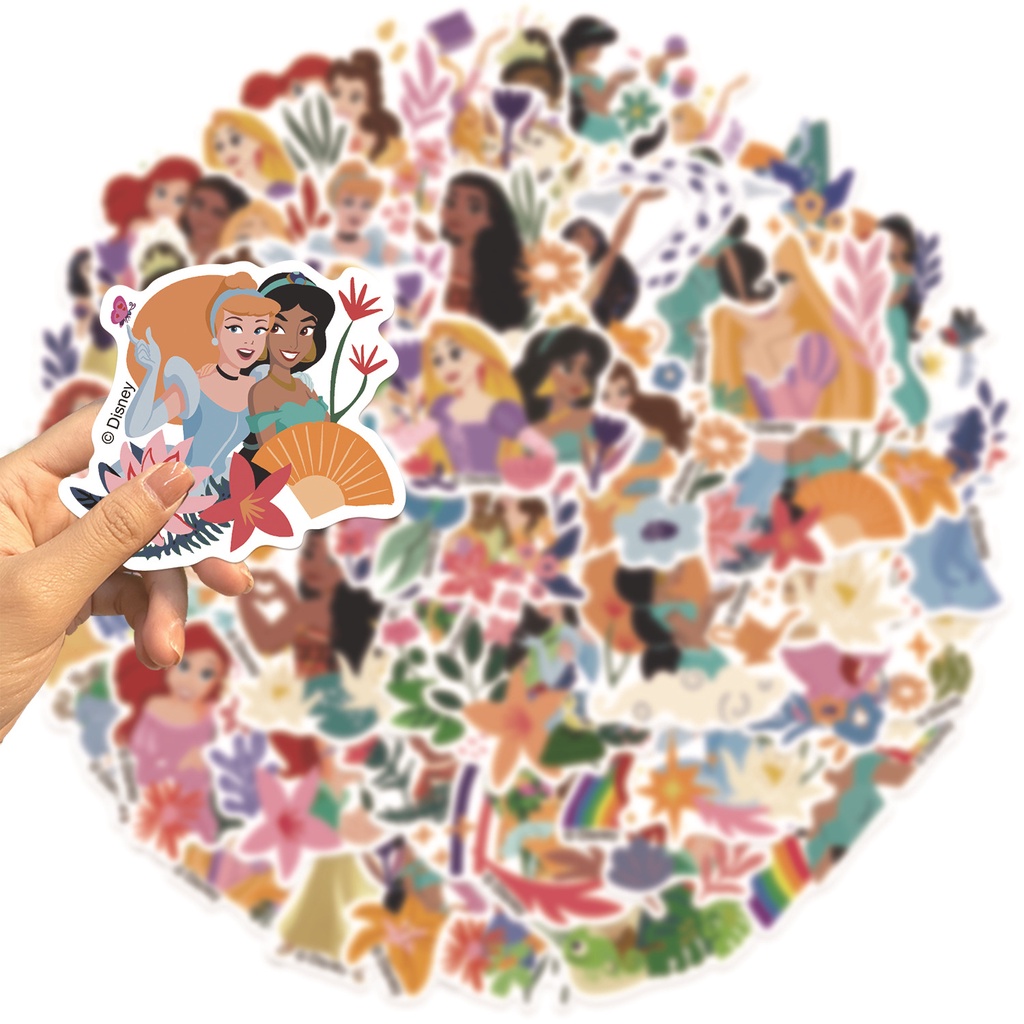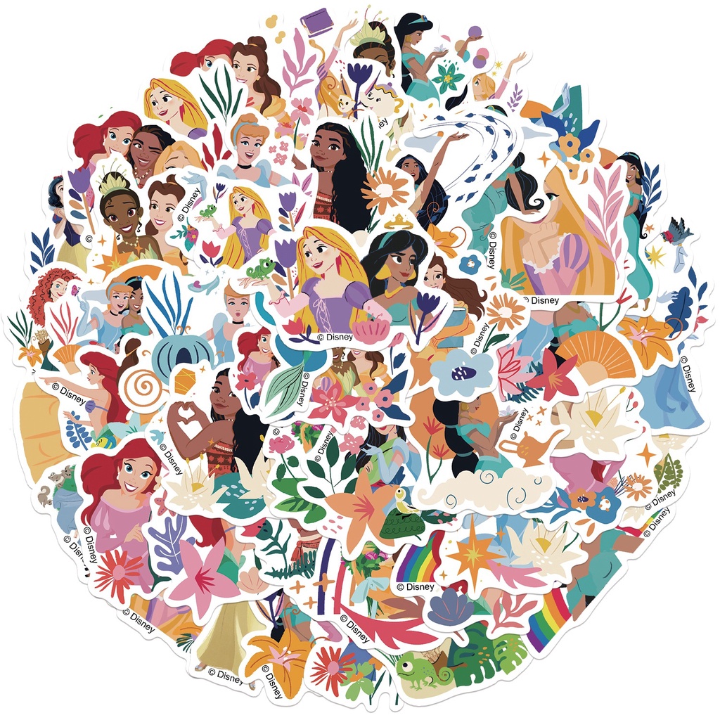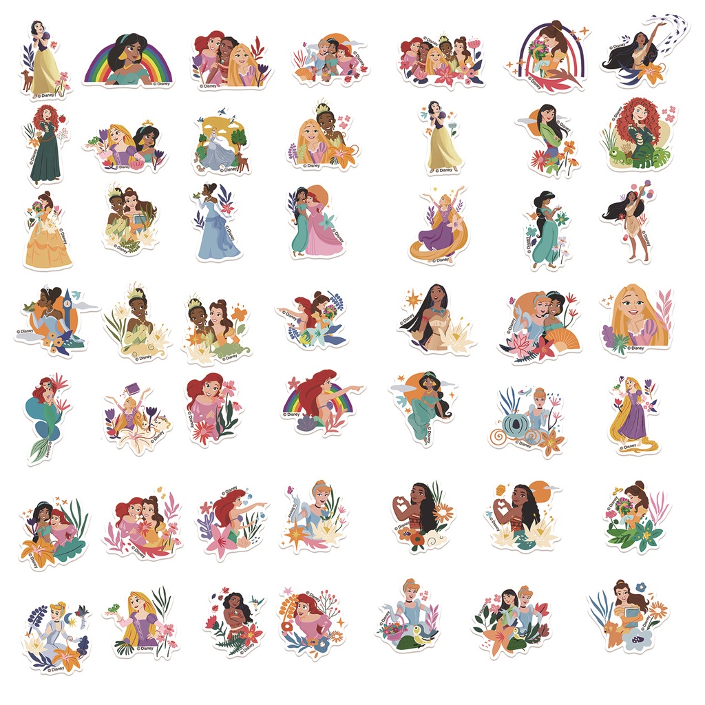 (ที่ได้รับอนุญาต) สติ๊กเกอร์ PVC กันน้ําลายการ์ตูน Disney Princesses and Flowers 50 ชิ้น