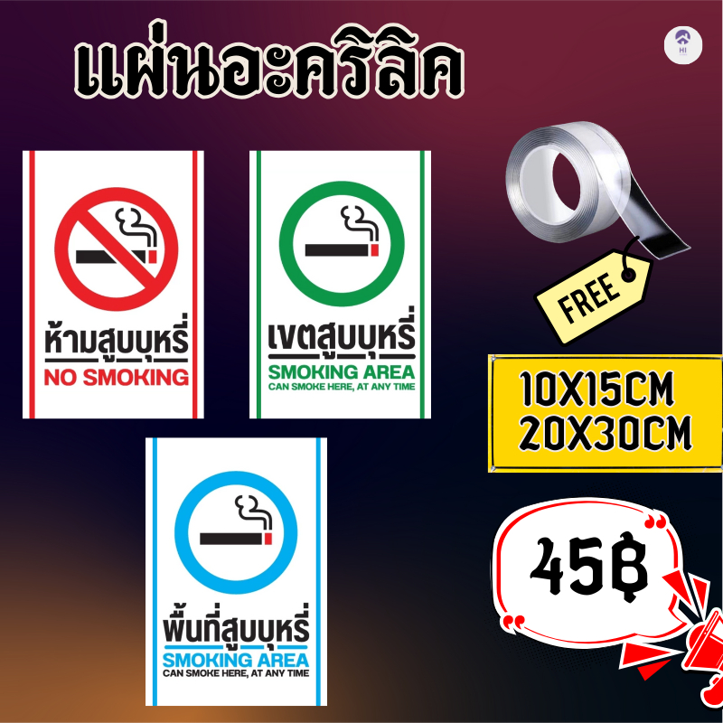(แผ่นอะคริลิค) ห้ามสูบบุหรี่ ป้ายห้ามสูบบุหรี่ ห้ามสูบบุหรี่ เขตสูบบุหรี่ ป้ายพื้นที่สูบบุหรี่