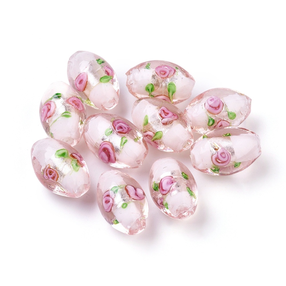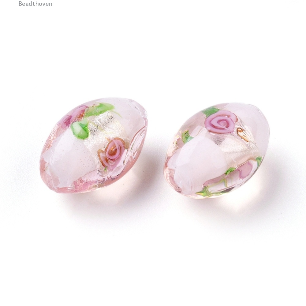 Beadthoven ลูกปัดฟอยล์แฮนด์เมดรูปไข่สีชมพู 16~17X9~11 มม. : 1.5~2 มม.10 ชิ้น