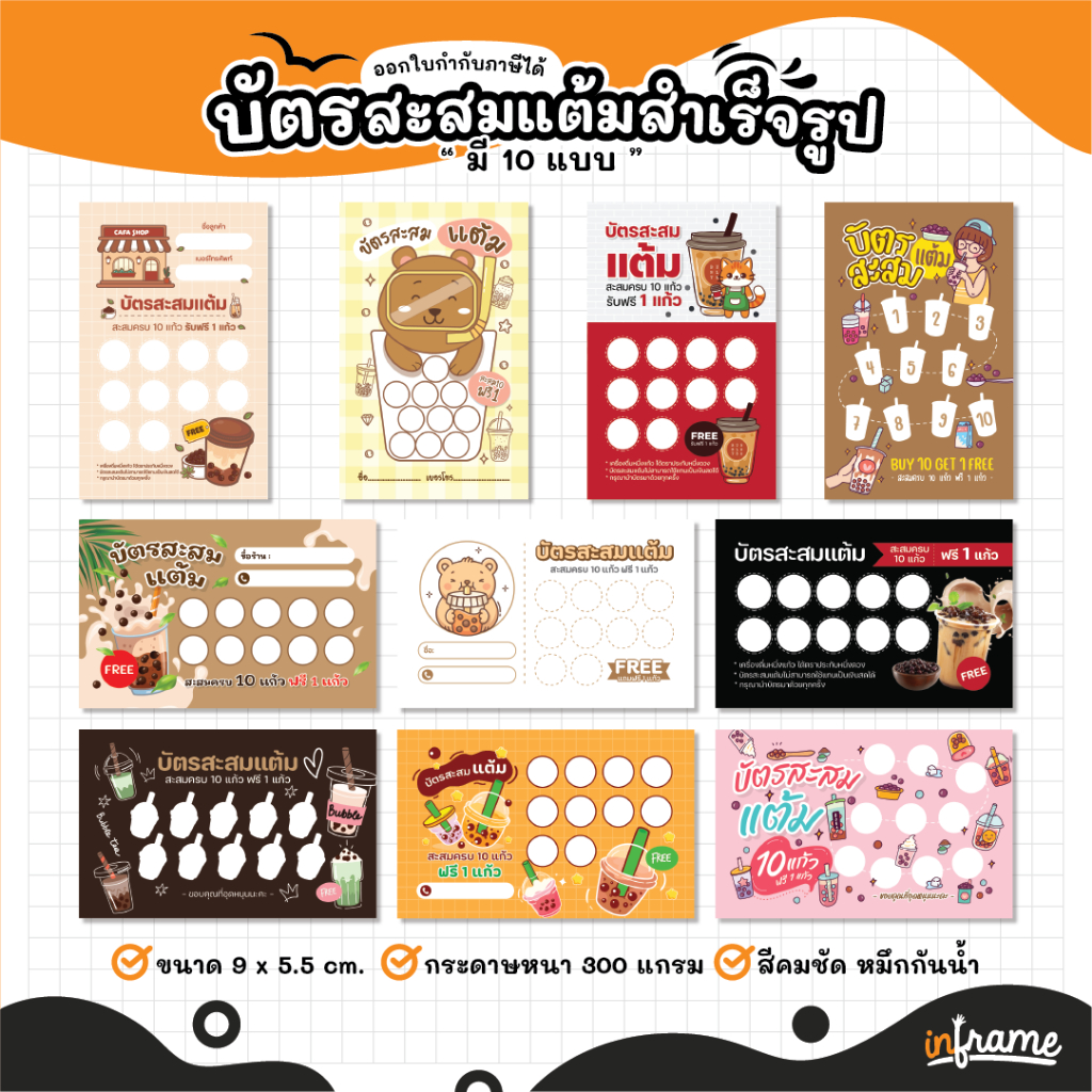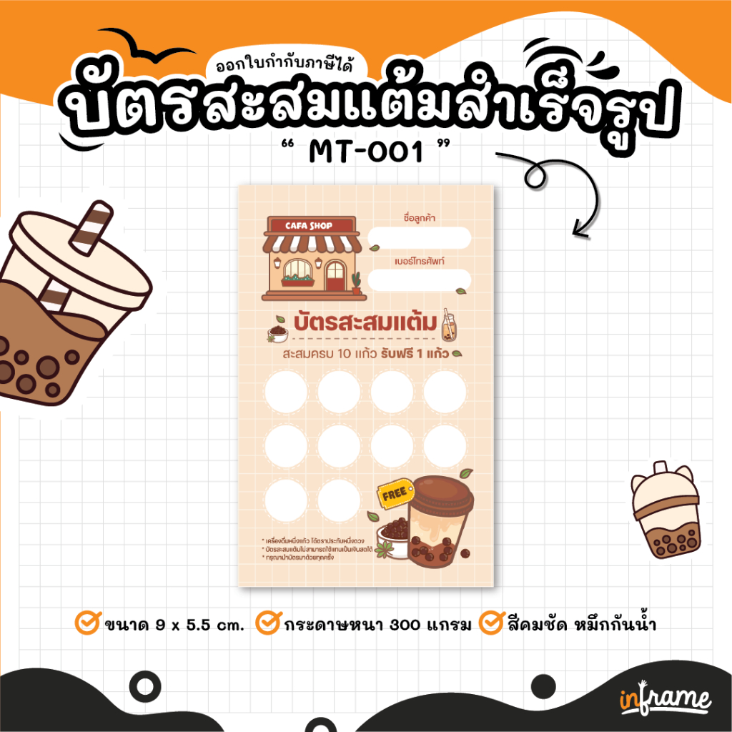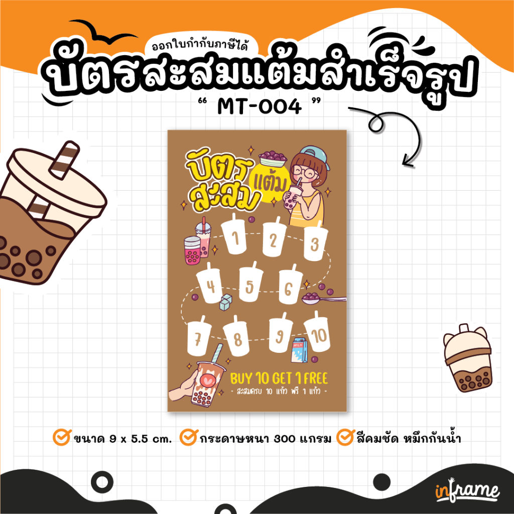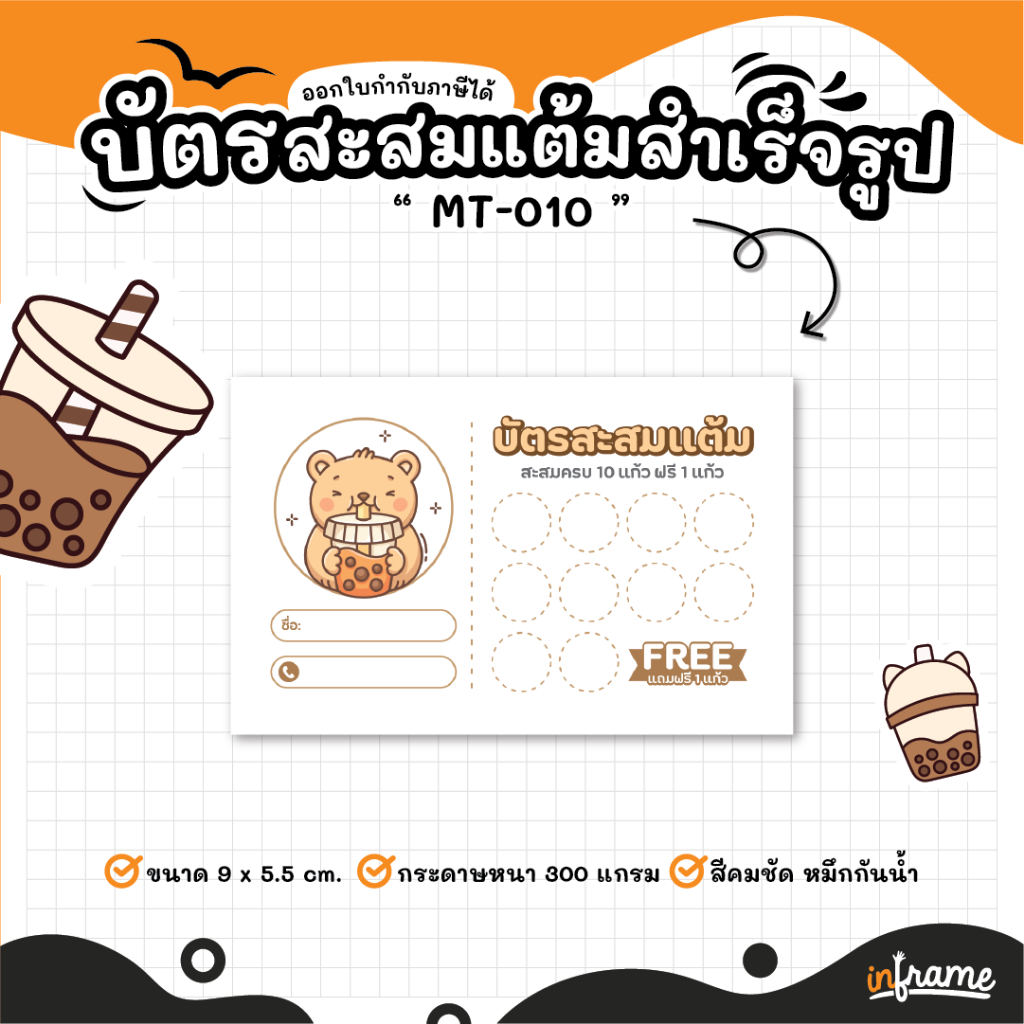 01.PP300-CF01- บัตรสะสมแต้มสำเร็จรูป “ชานมไข่มุก” แบบ 1 หน้า กระดาษหนา หมึกกันน้ำ