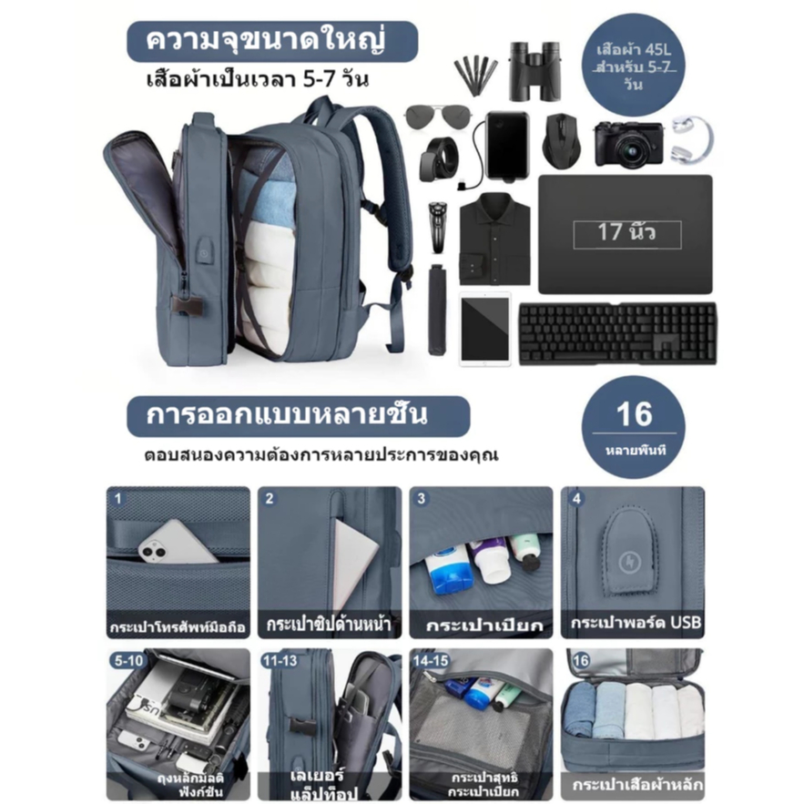 【จัดส่งจากกรุงเทพฯ】กระเป๋าเป้สะพายหลังกันน้ำขนาดใหญ่ ด้วยอินเทอร์เฟซชาร์จ USB อเนกประสงค์ หลายพาร์ทิชัน