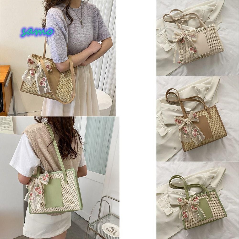 SAMO Vine Tote Bag, กระเป๋าผ้าทอมือ Straw Women Beach Bag, Shoulder Handheld Travel Basket Strawทอ Bag Womens