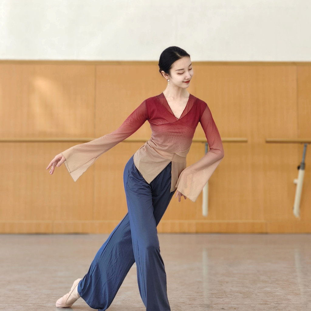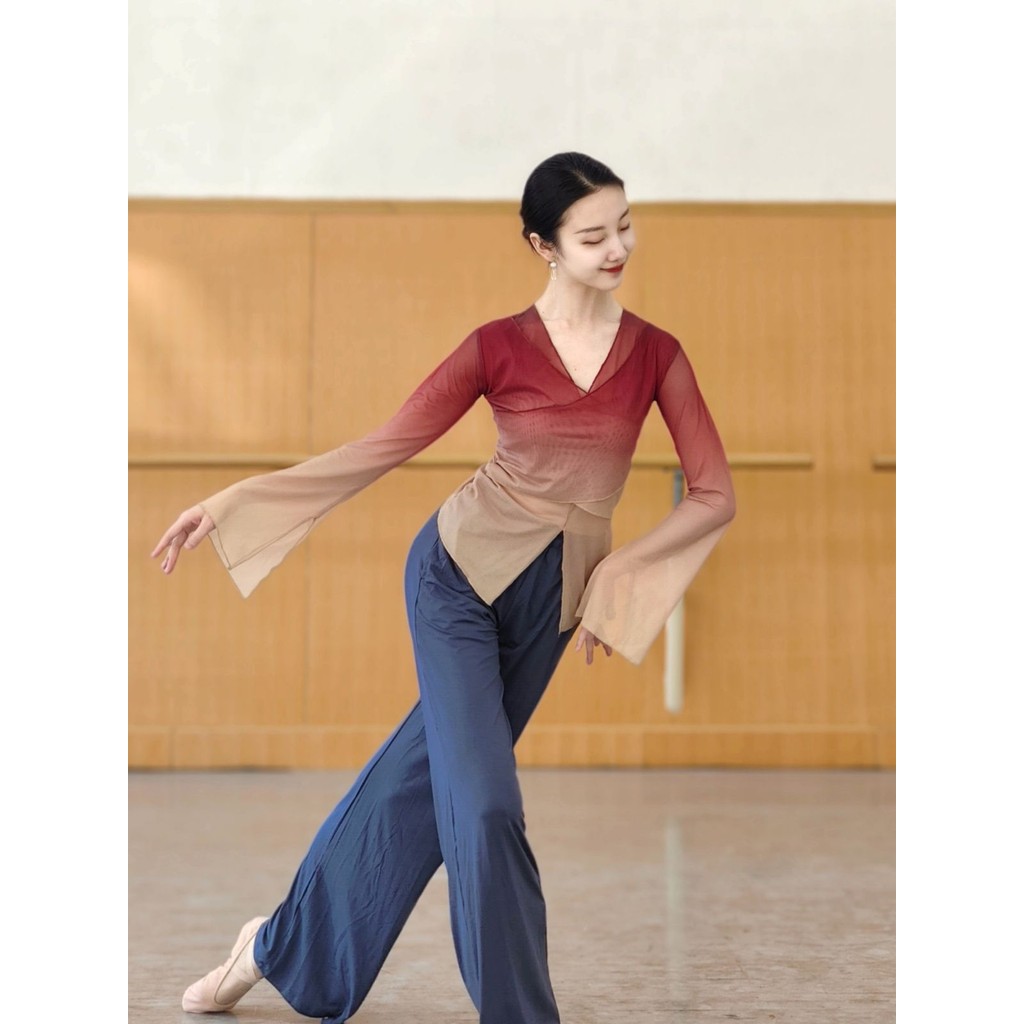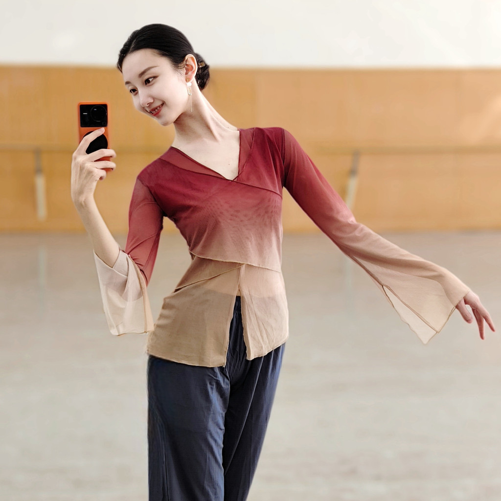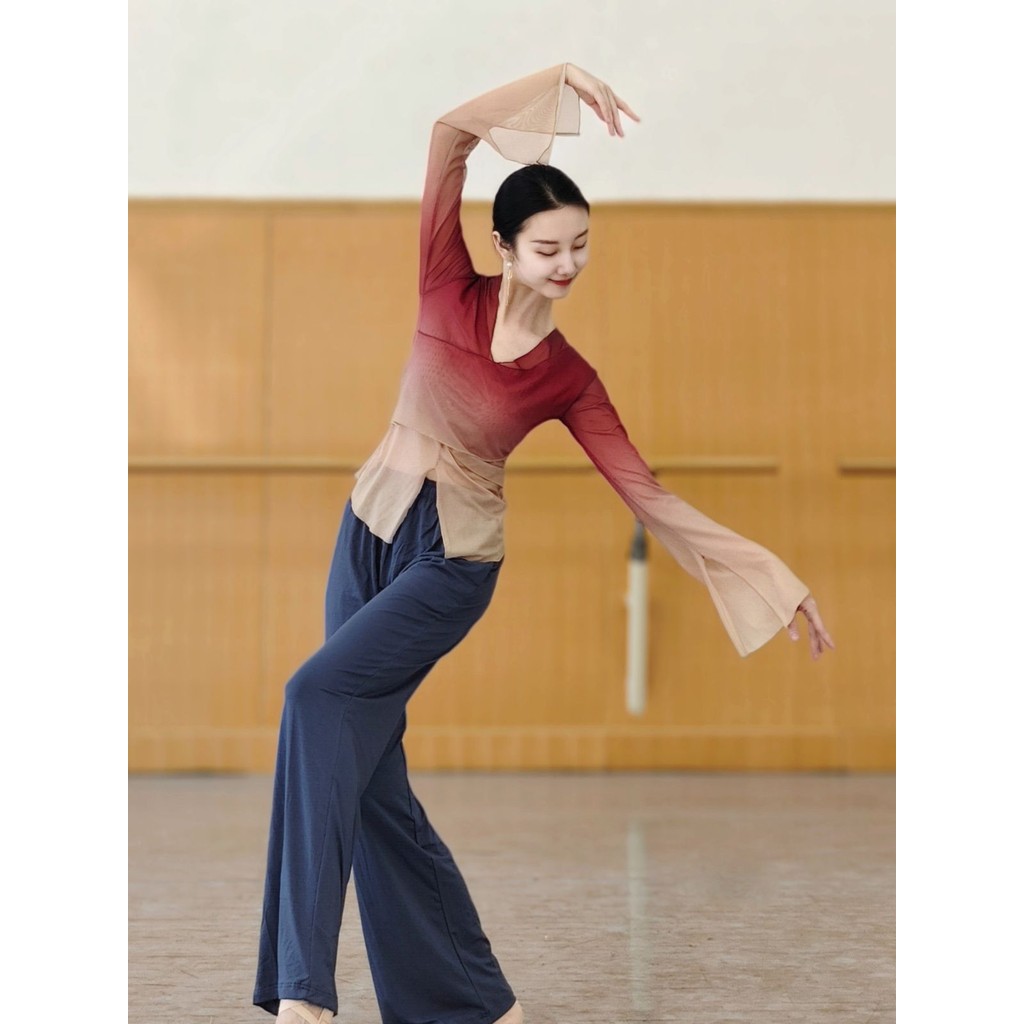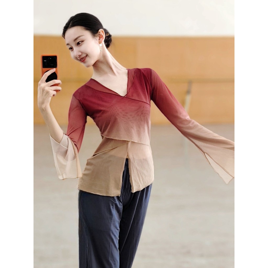 [WDF] เต้นรําคลาสสิกไล่ระดับสีร่างกายสัมผัสผ้ากอซเสื้อผ้าฝึกเสื้อผ้าผู้หญิง,จีนเต้นรําพื้นบ้านเต้นรําสมัยใหม่ชุดเต้นรําด้านบนเสื้อผ้าฝึกพื้นฐาน