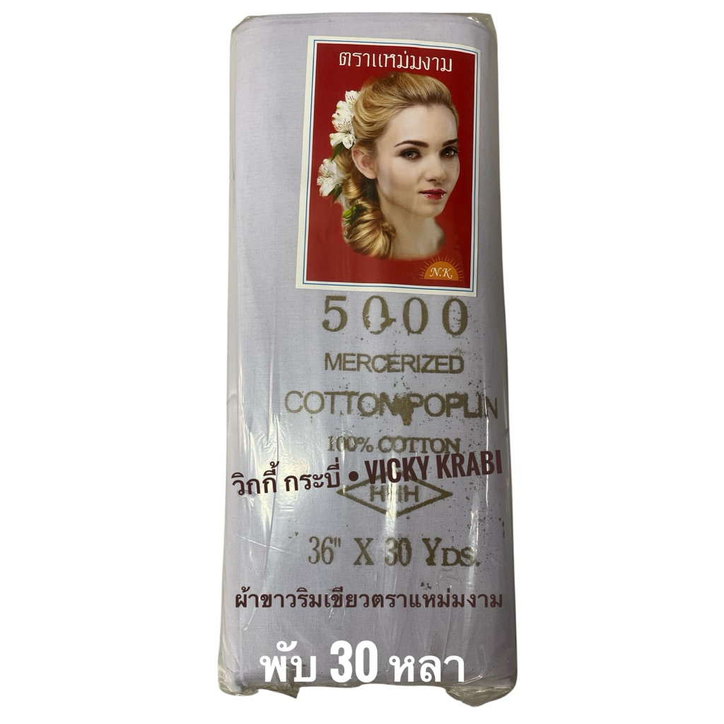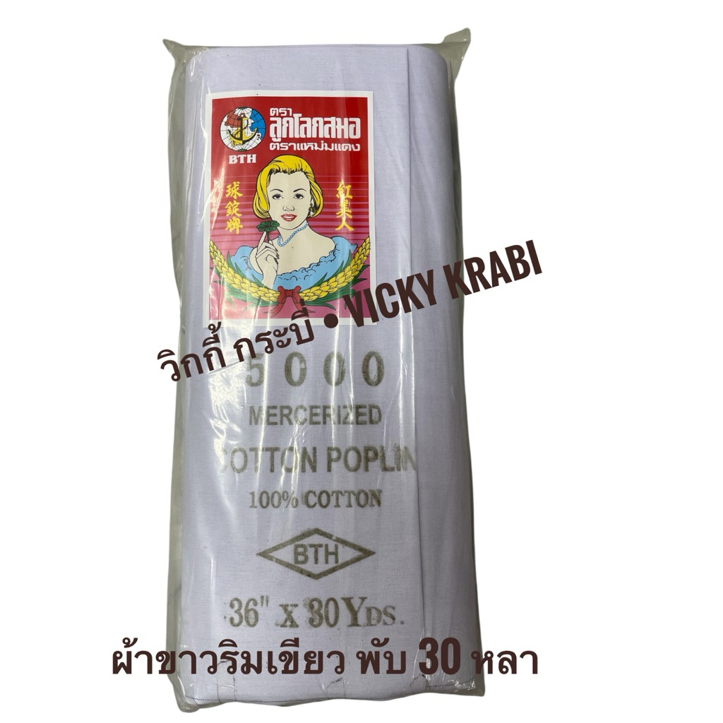 ผ้าขาวริมเขียว ตราแหม่มแดง เกรดพรีเมียม ความยาว 30 หลา (ต่อพับ) สำหรับทำพิธีการต่างๆ/เสื้อผ้า