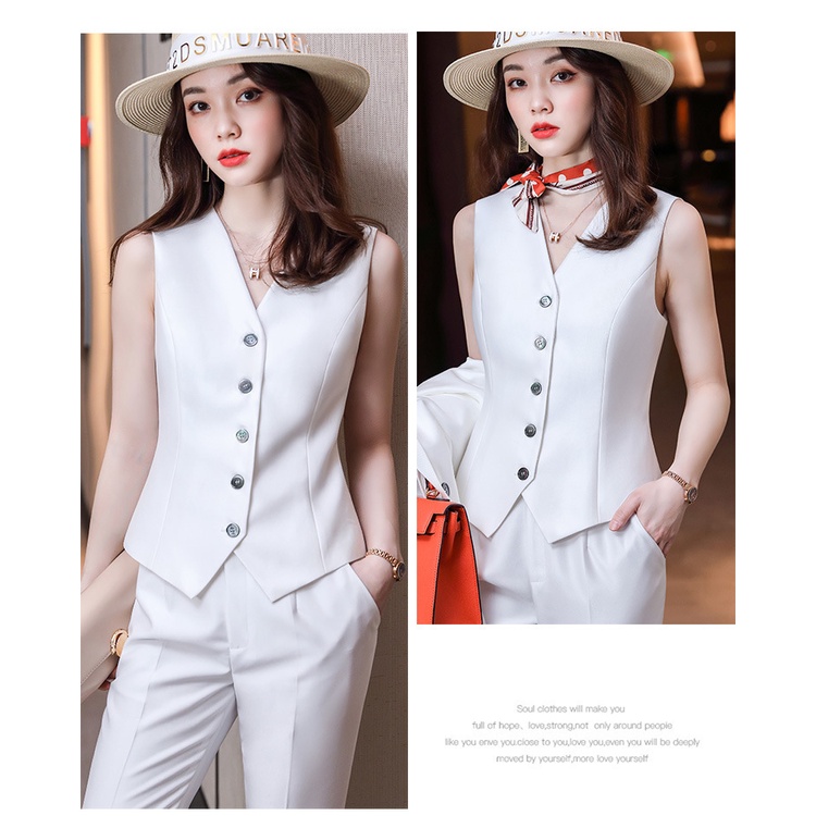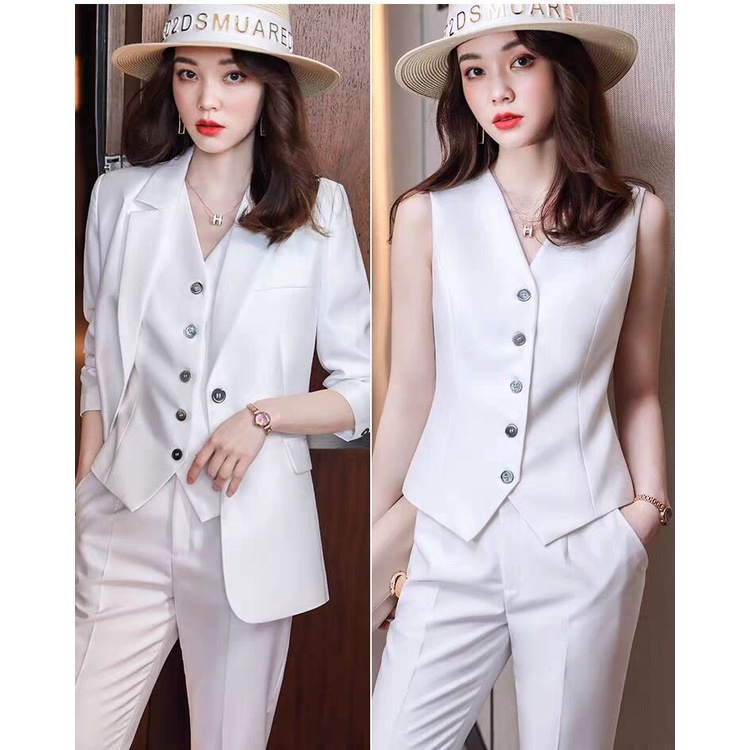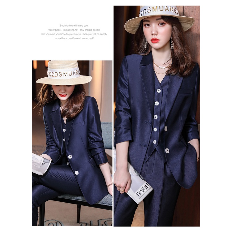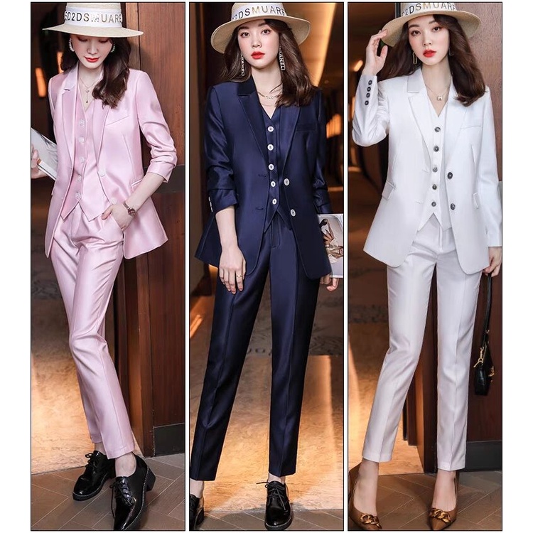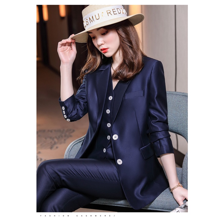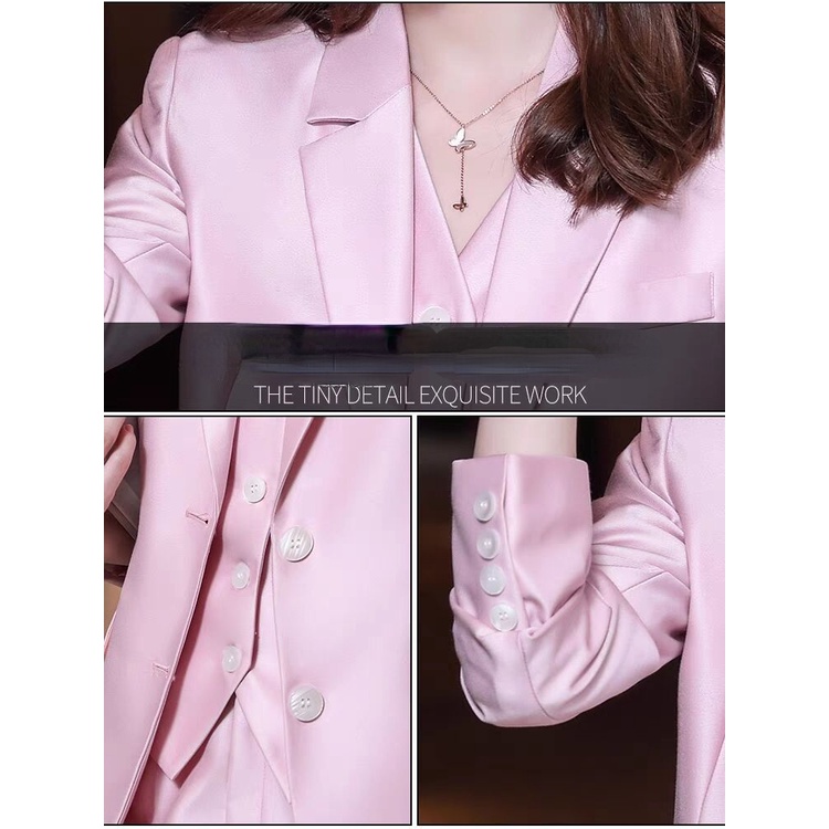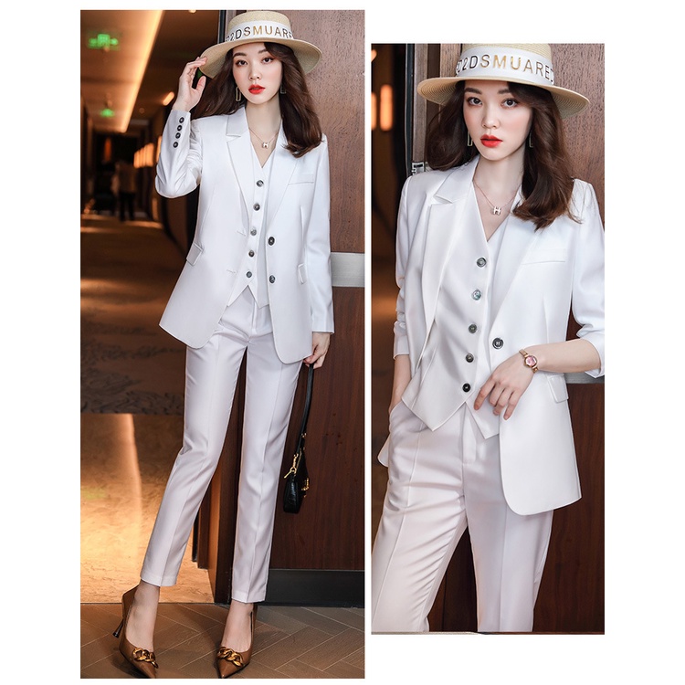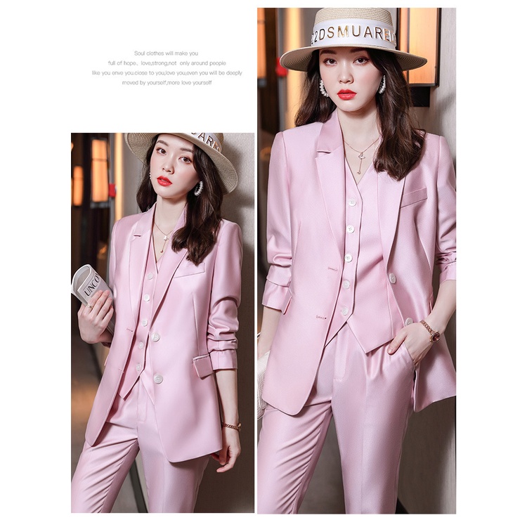 ((เสื้อเบลเซอร์+เสื้อกั๊ก+กางเกง) ชุดสูทผู้หญิงเกาหลีระดับไฮเอนด์เสื้อผ้าสํานักงานทรงเข้ารูปสีทึบ
