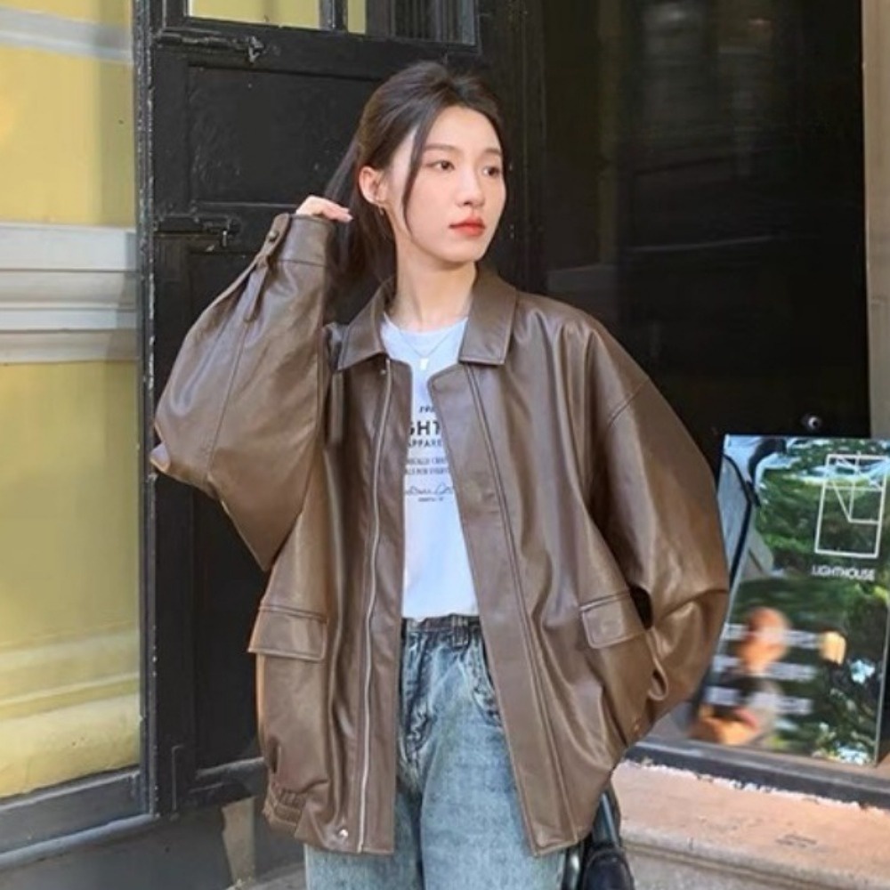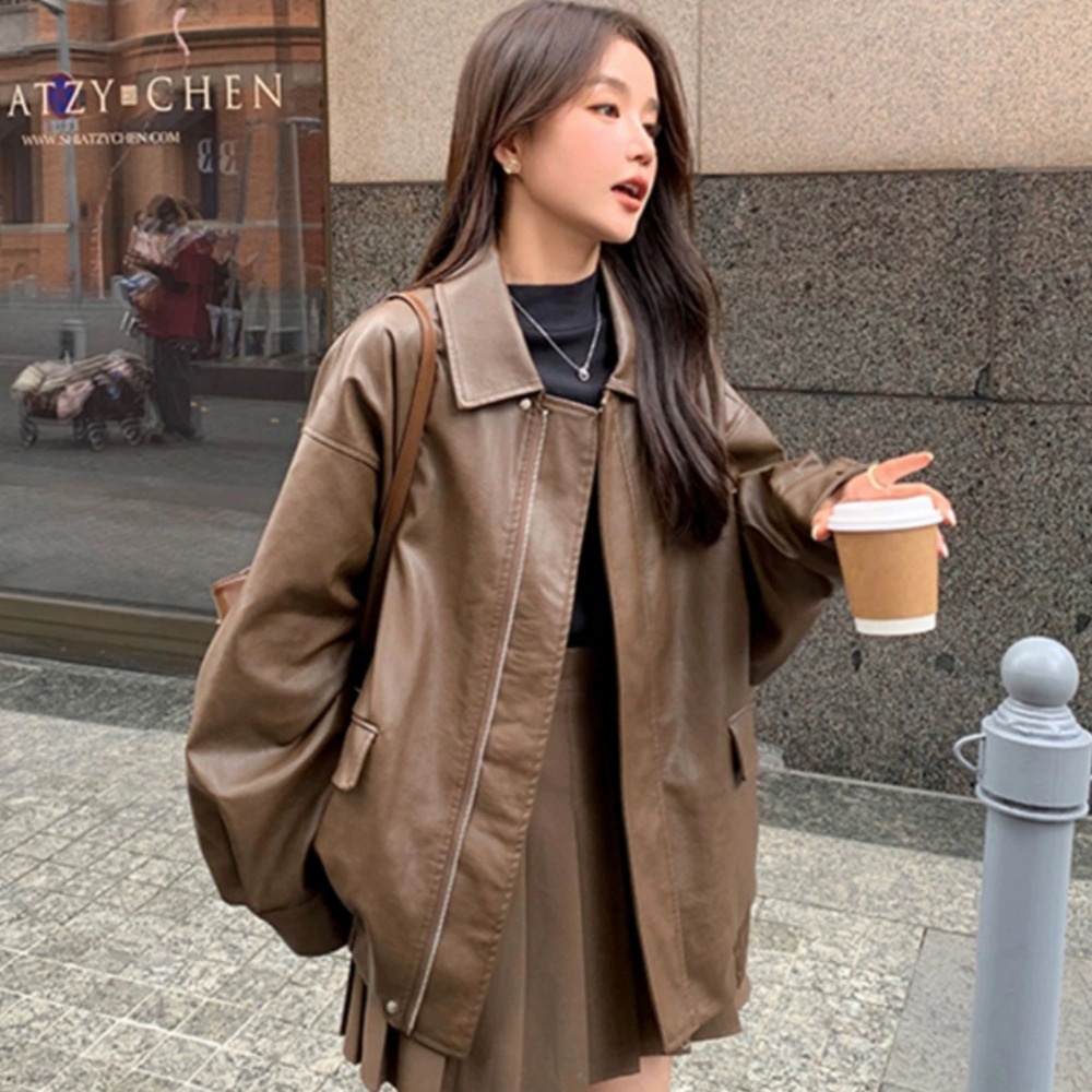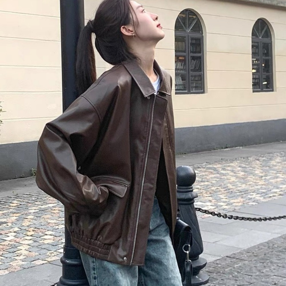 (จัดส่งจากประเทศไทย) ใหม่ฤดูใบไม้ร่วงหลวมแจ็คเก็ตหนังสไตล์อเมริกัน เสื้อแจ็คเก็ตหนังขี่มอเตอร์ไซค์วินเทจสีน้ำตาล