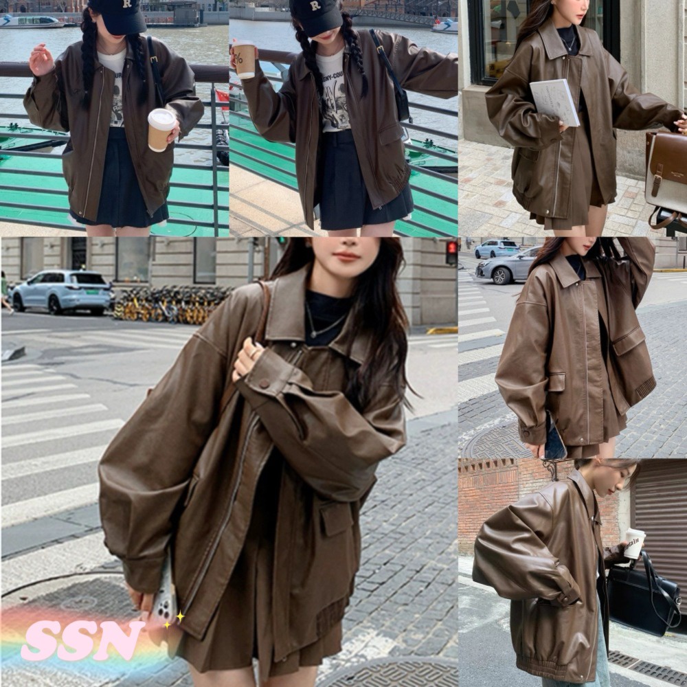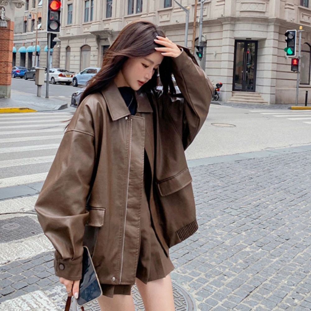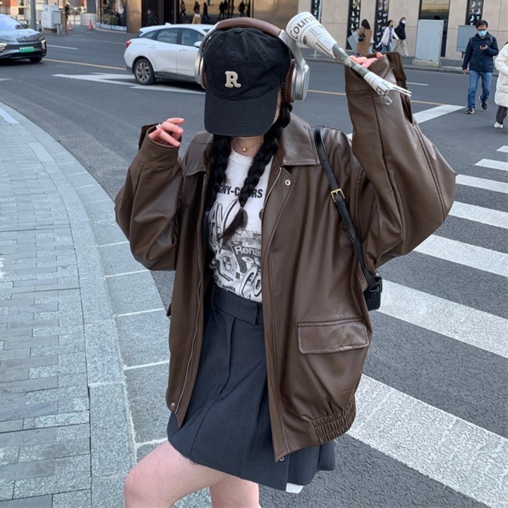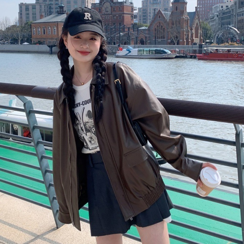 (จัดส่งจากประเทศไทย) ใหม่ฤดูใบไม้ร่วงหลวมแจ็คเก็ตหนังสไตล์อเมริกัน เสื้อแจ็คเก็ตหนังขี่มอเตอร์ไซค์วินเทจสีน้ำตาล