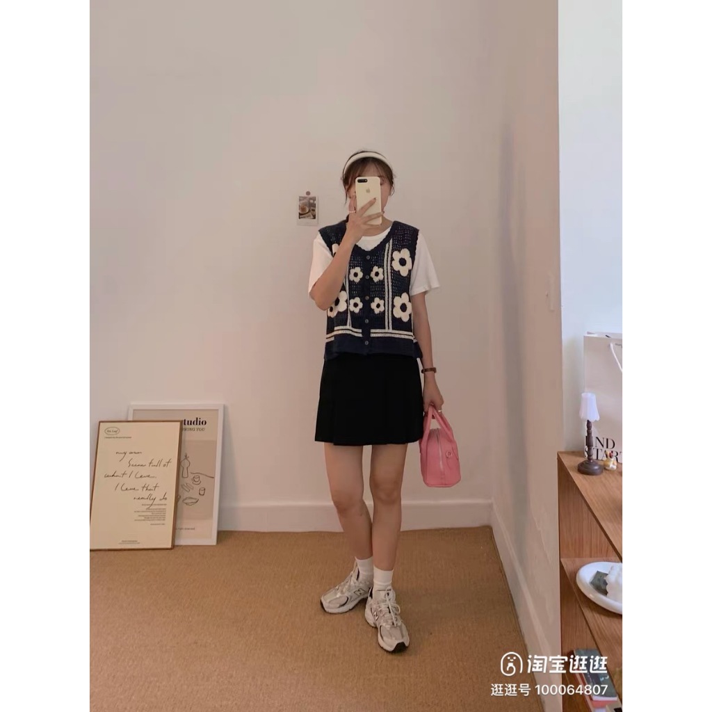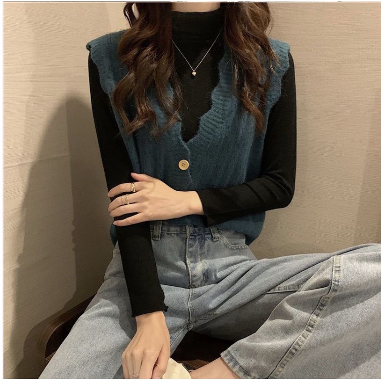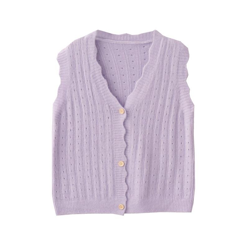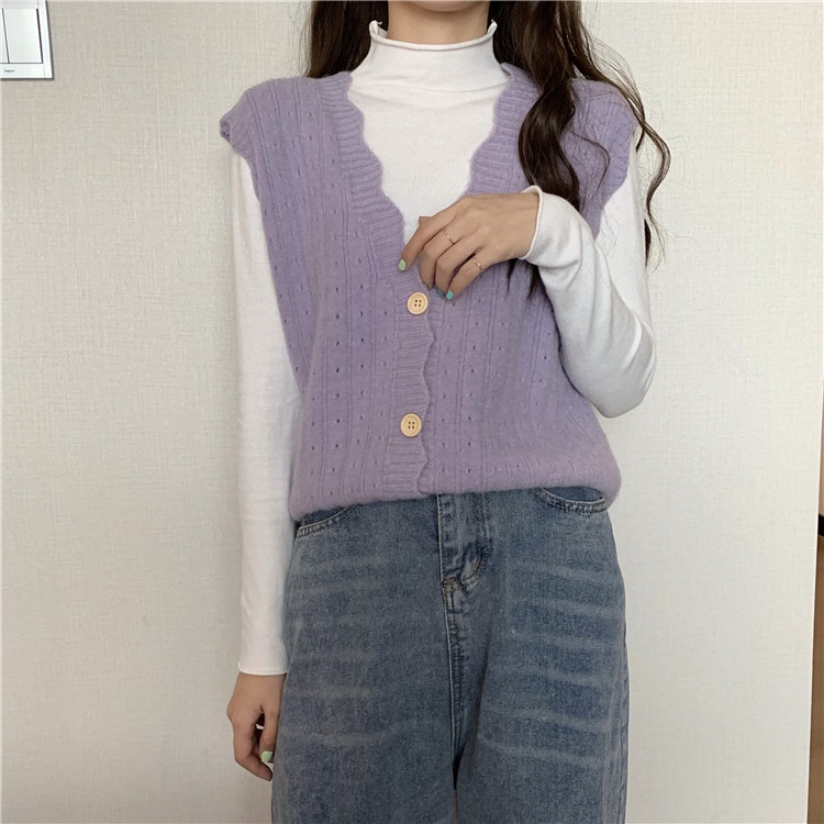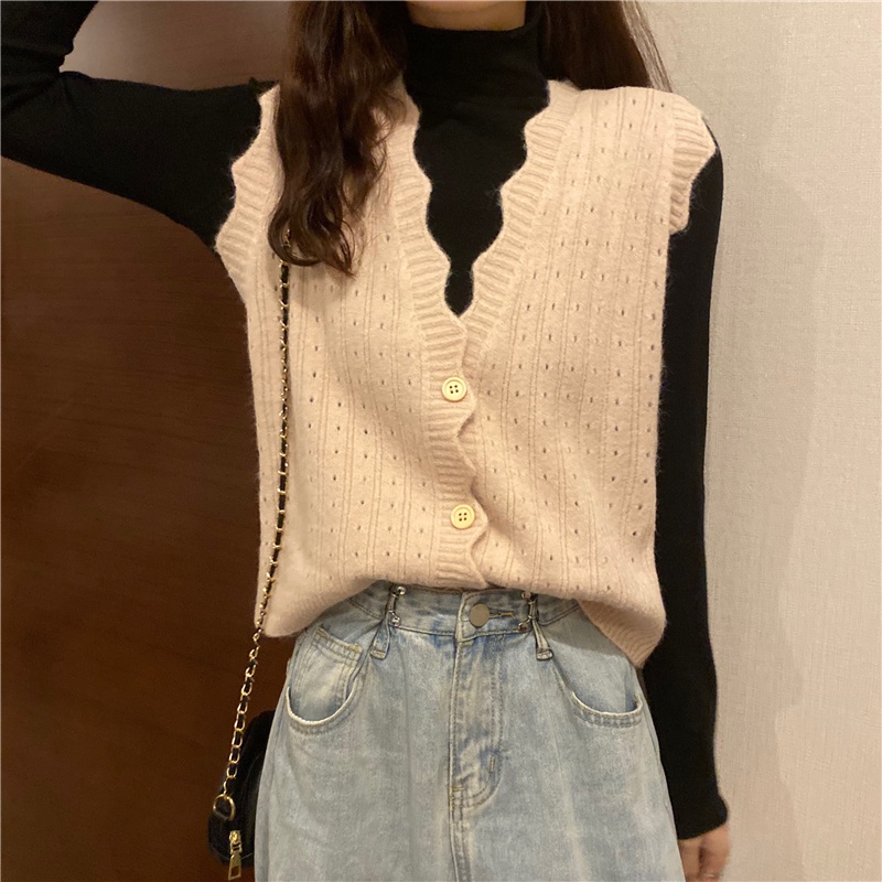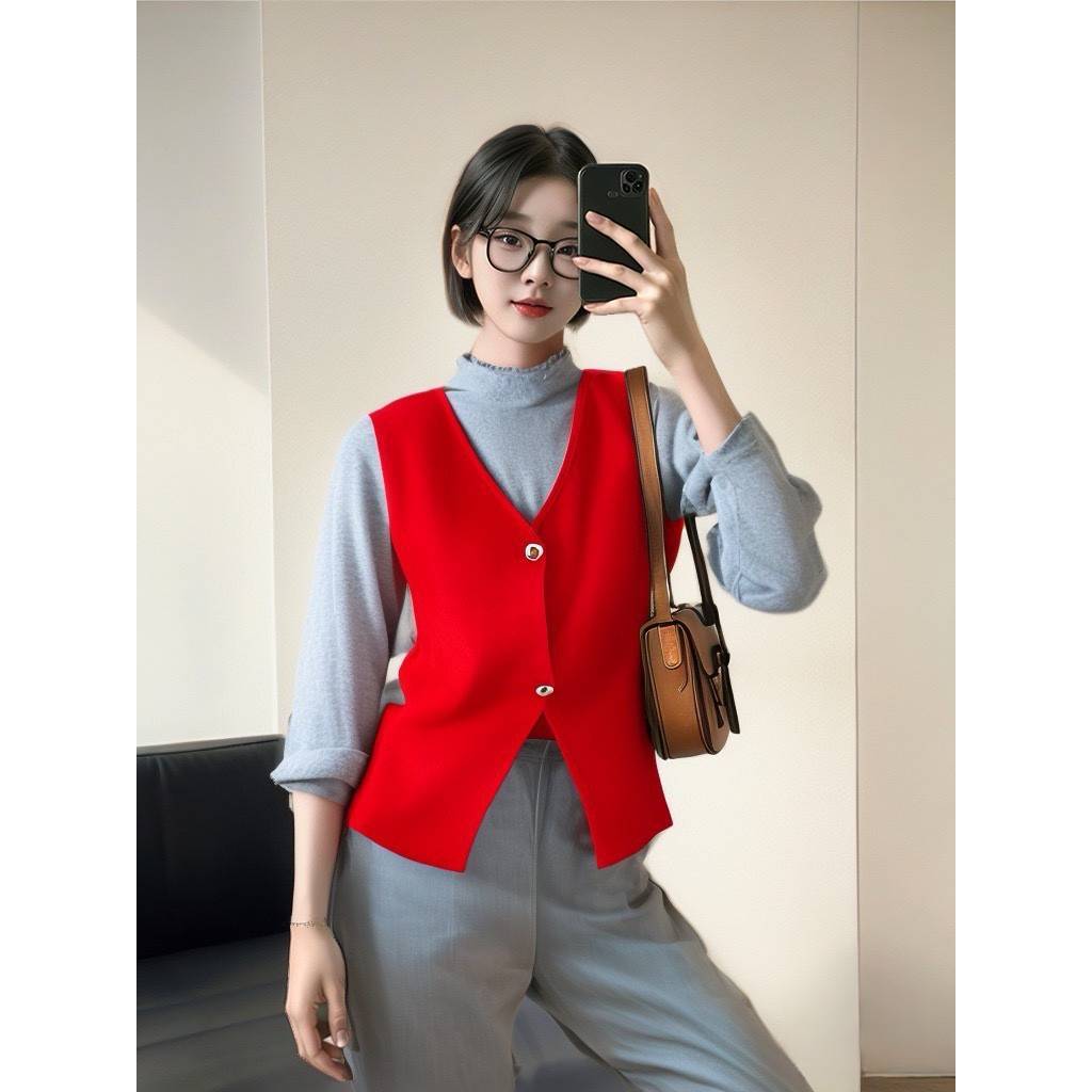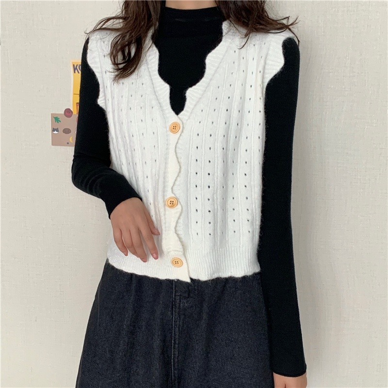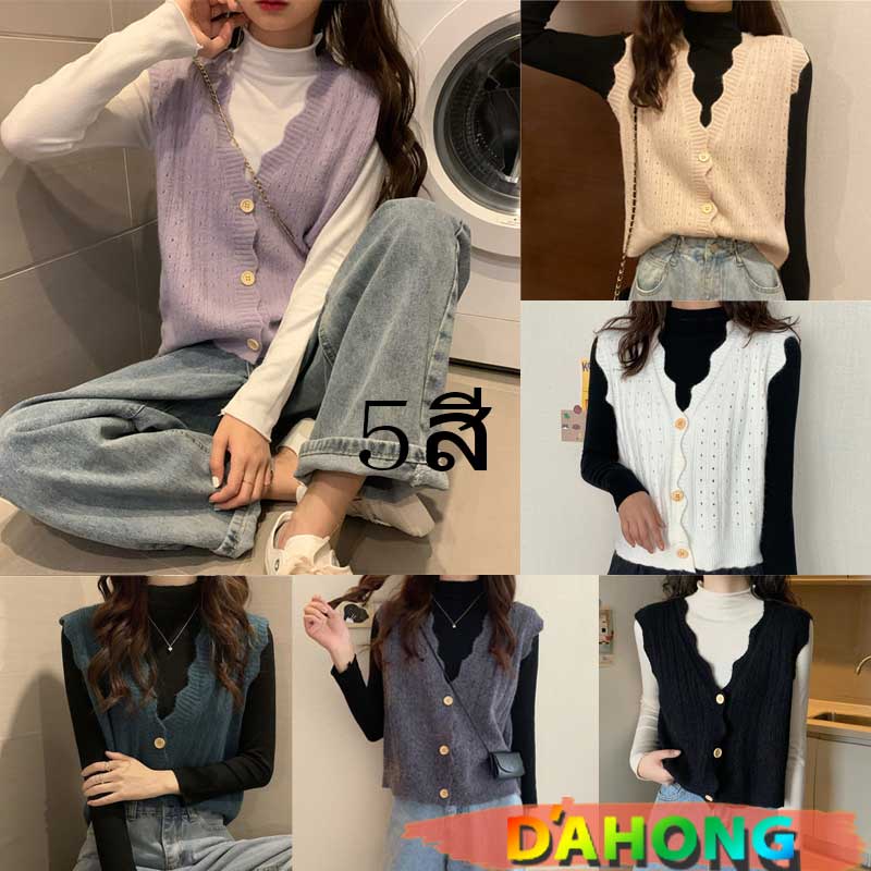Dahong A342💖 เสื้อกั๊กไหมพรมสีพื้น แต่งขอบคลื่นน้ำ สไดล์วัยรุ่น เสื้อไหมพรมแฟชั่น สีพื้น เสื้อกั๊กไหมพรม🍂