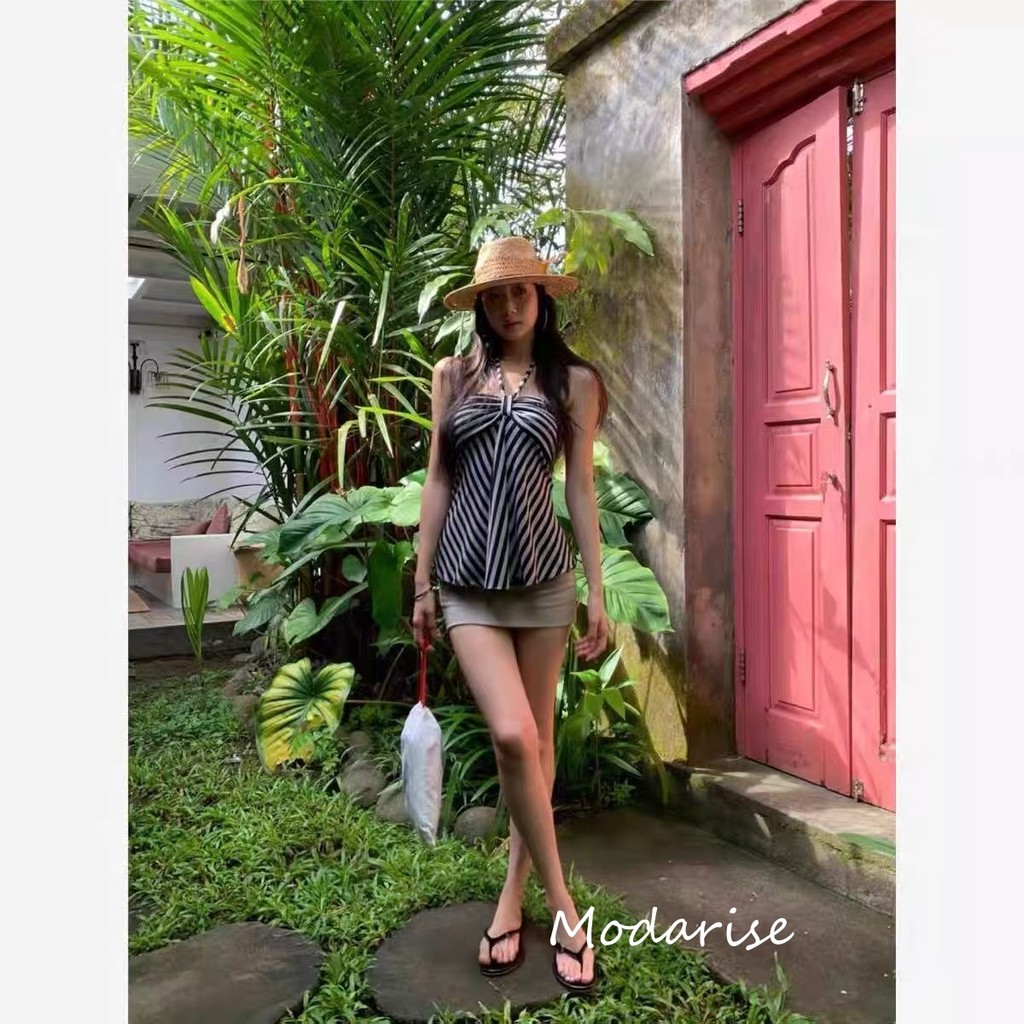 Modarise เสื้อครอปเกาะอกแบบคล้องคอสไตล์สาวอเมริกัน ลายทาง สำหรับผู้หญิง ใส่ไปข้างนอกได้ โชว์หลัง ไม่มีแขน แฟชั่นเทรนด์