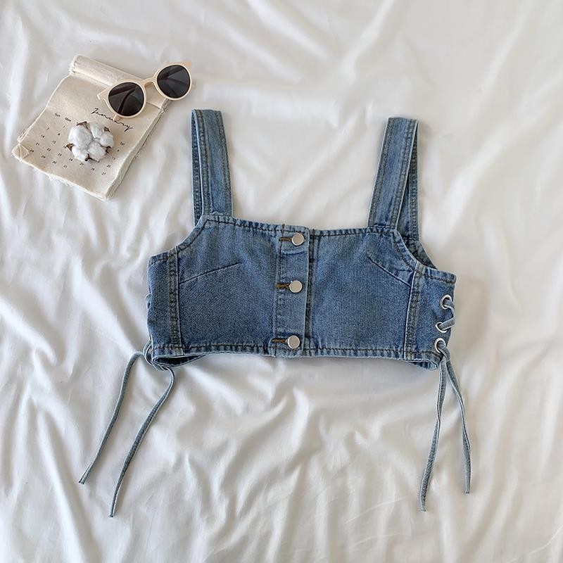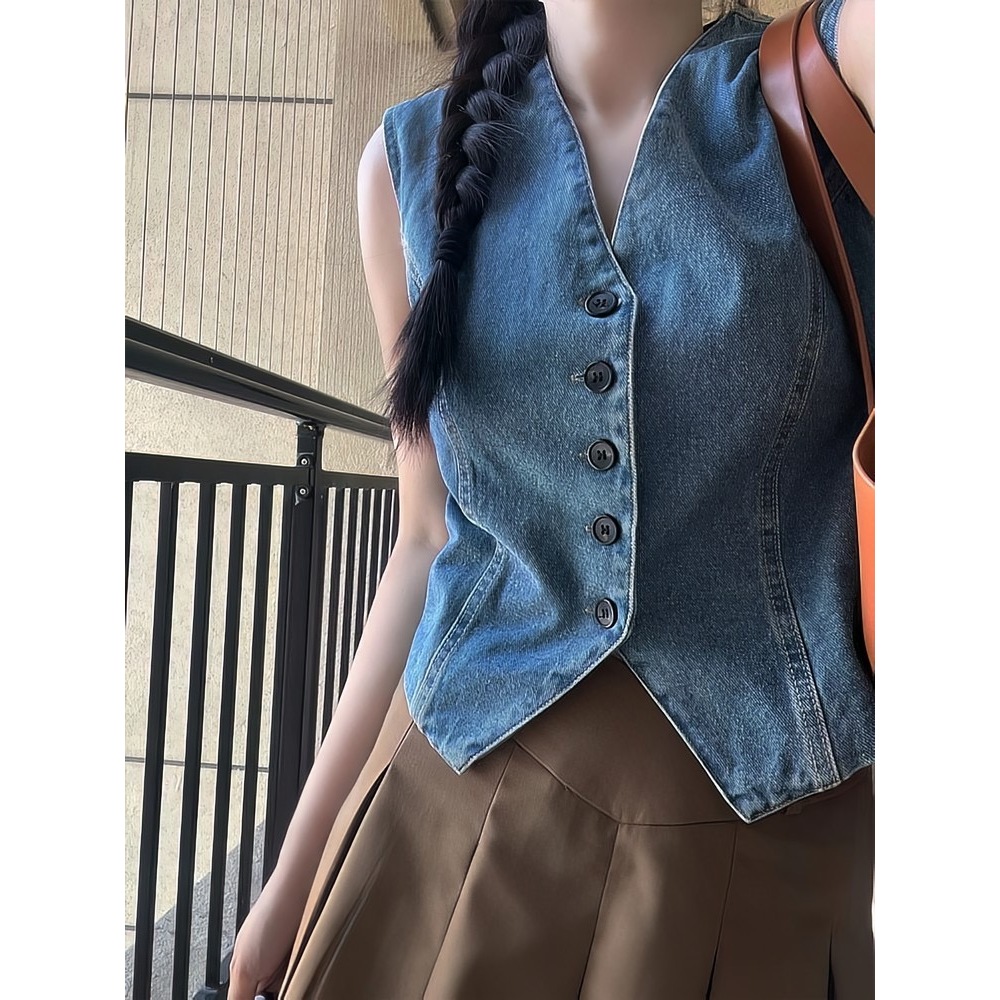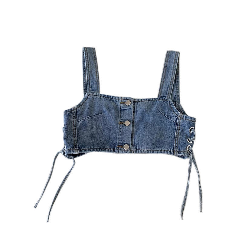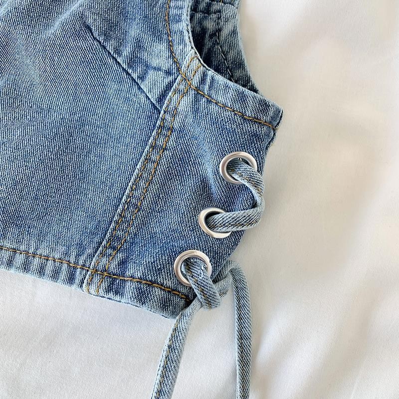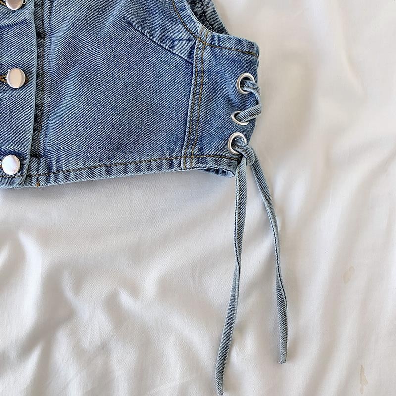 Laced Short Design Slim-fit Single-Breasted เสื้อกั๊กยีนส์แขนกุดสลิงขนาดเล็ก