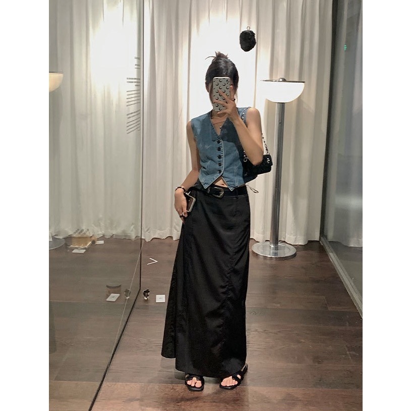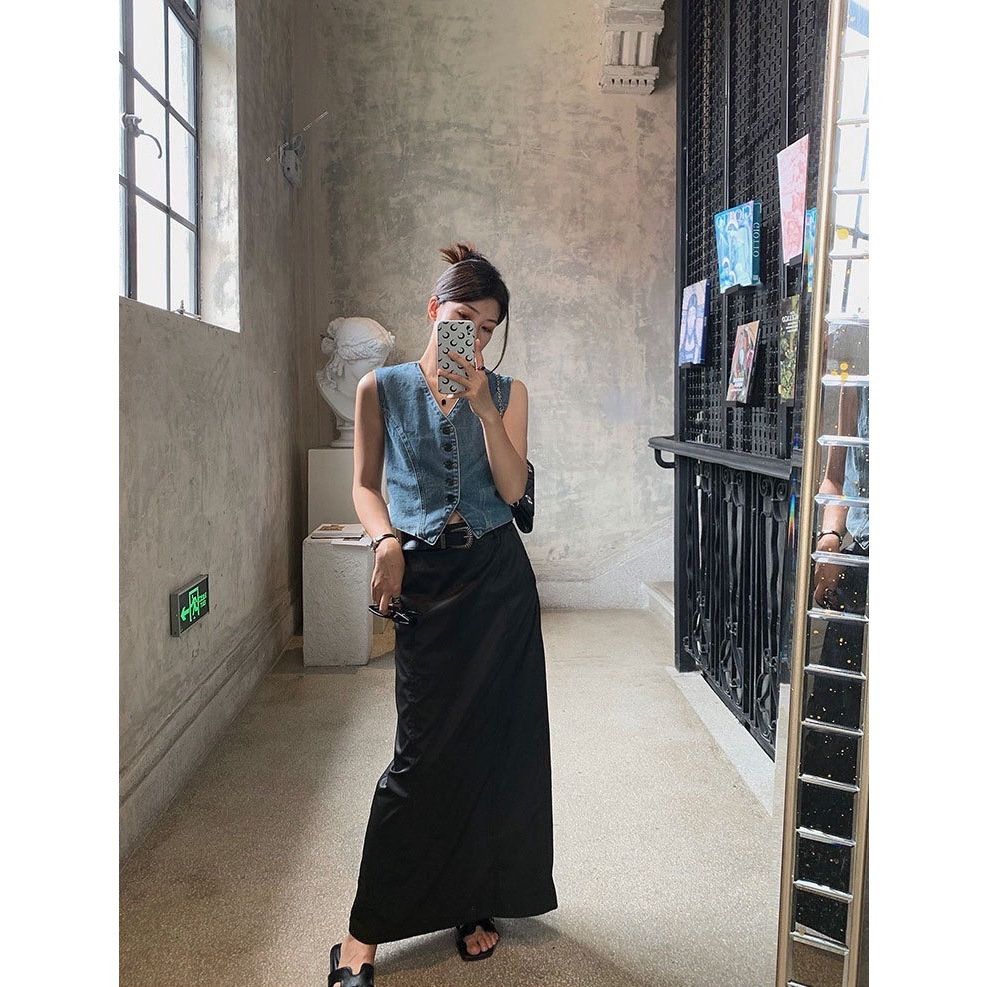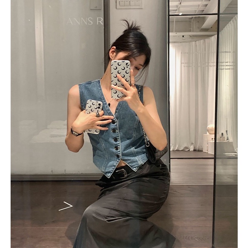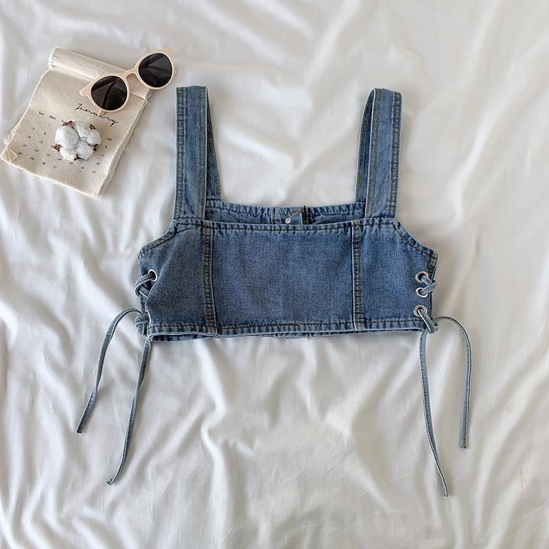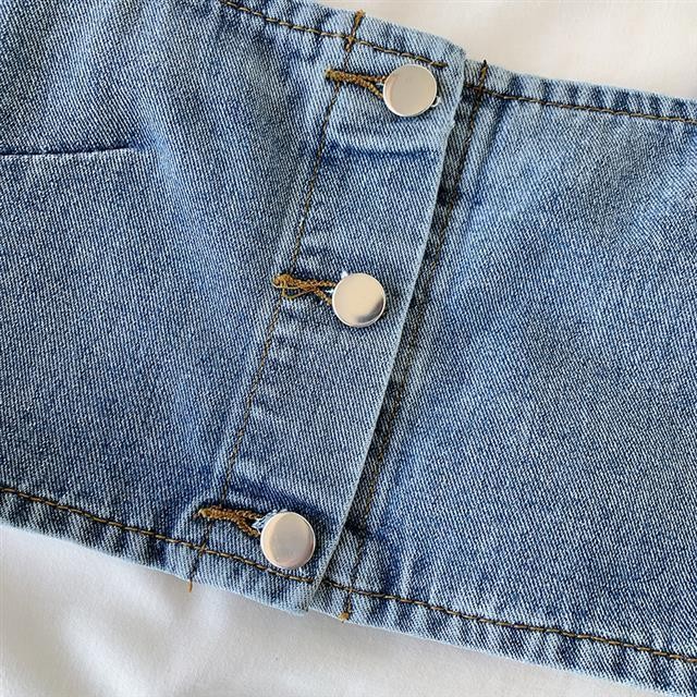 Laced Short Design Slim-fit Single-Breasted เสื้อกั๊กยีนส์แขนกุดสลิงขนาดเล็ก