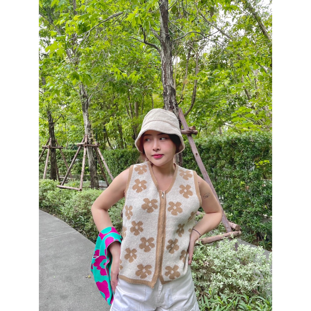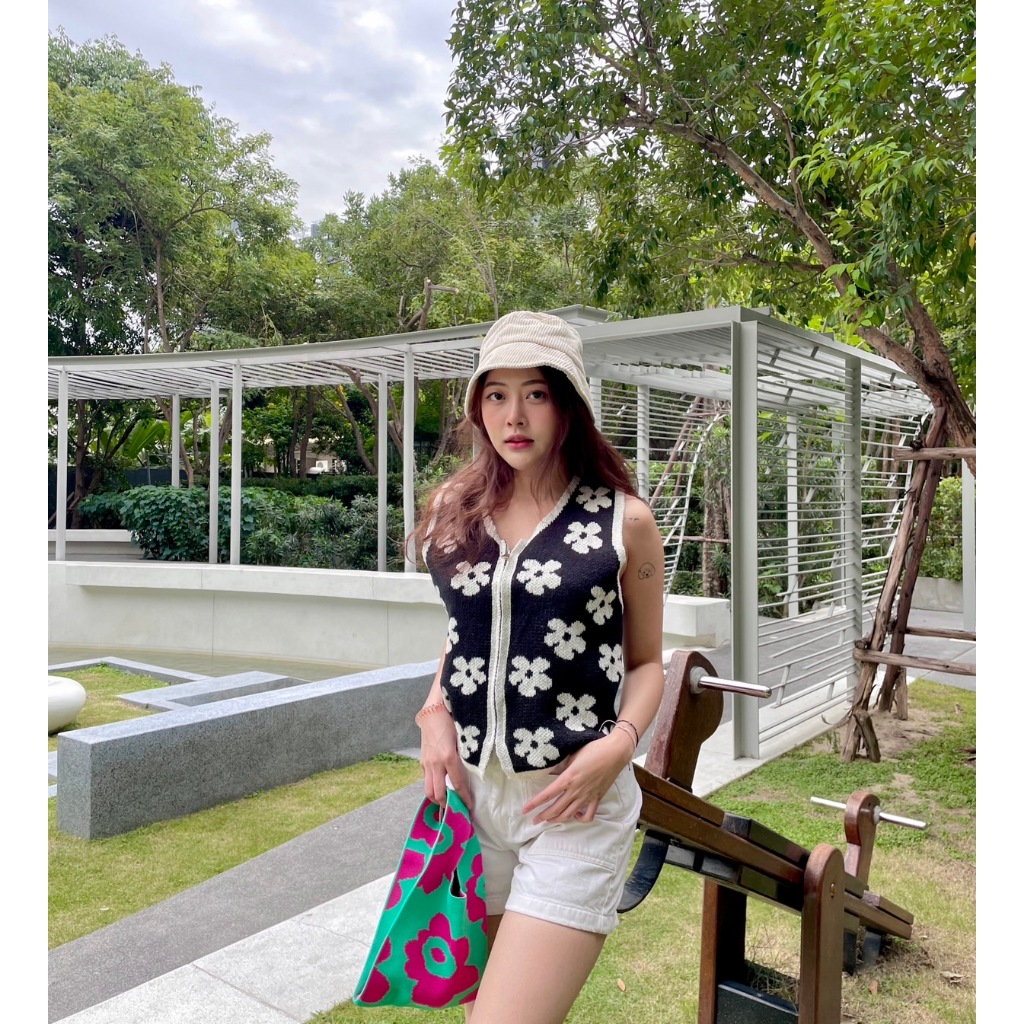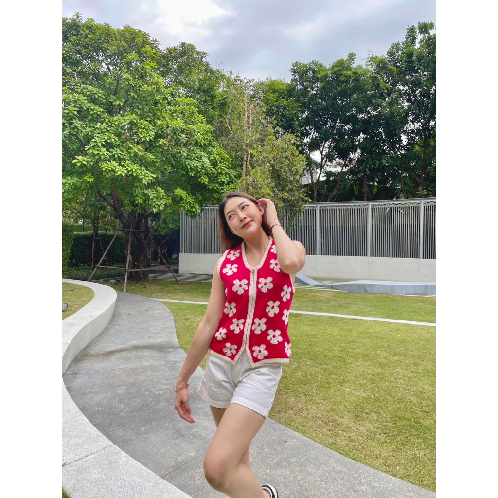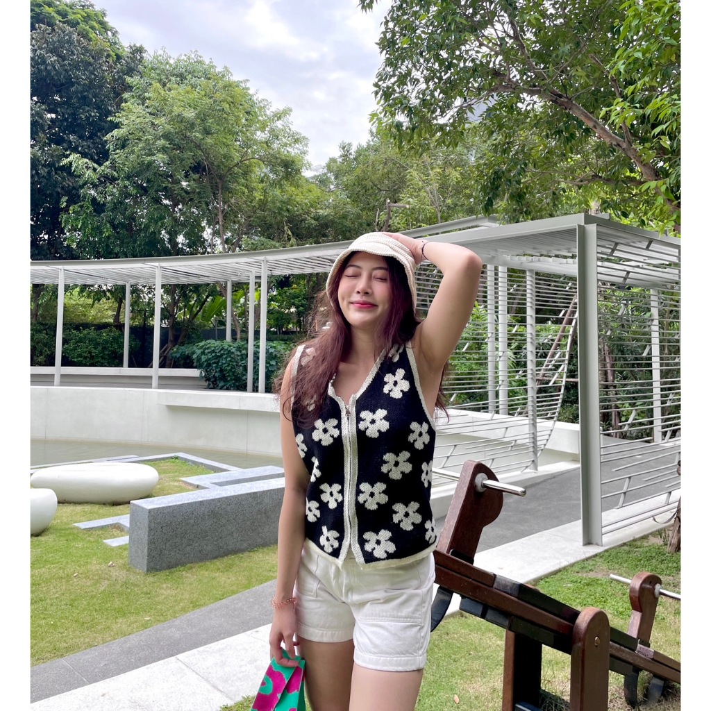 Cicishop(SALE Z8051)เสื้อกั๊กไหมพรมลายดอกไม้ ดีเทลซิปหน้า สไตล์เกาหลี สุดCute