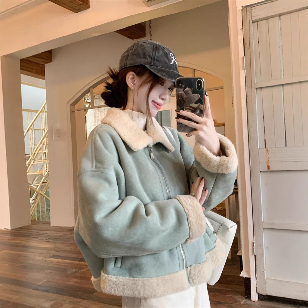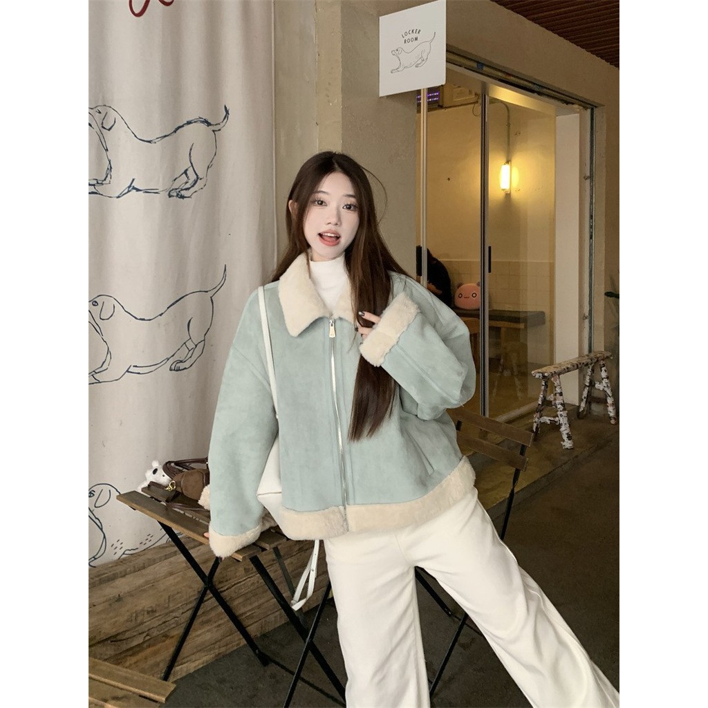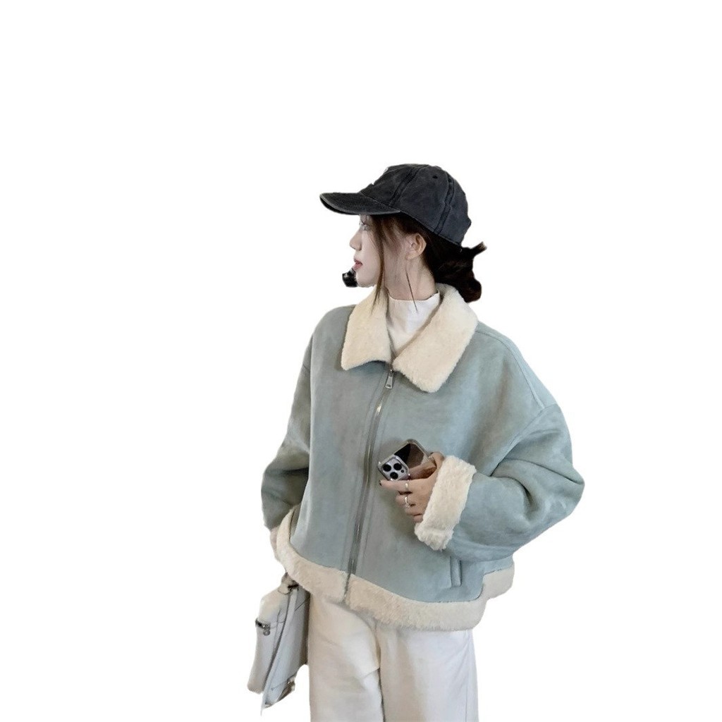 เกาหลีความรู้สึกขั้นสูงสีฟ้าอ่อนปกสั้นเสื้อเนื้อแกะหญิงฤดูหนาวขนแจ็คเก็ตแบบบูรณาการฤดูหนาว