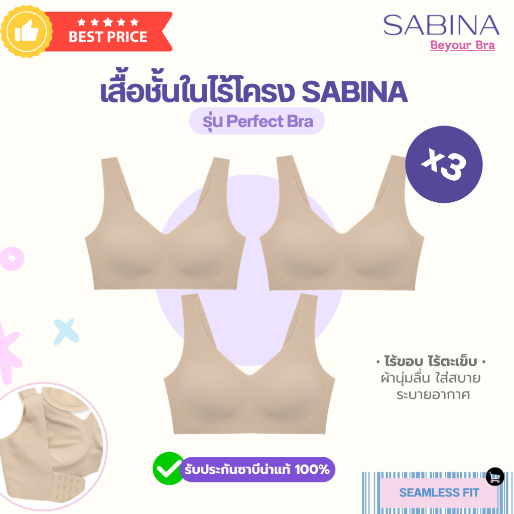(แพ็ค 3 ตัว) SABINA บราไร้โครงไร้ขอบ รุ่นPerfect Bra รหัส NBD24006 ฟองบาง ตะขอหลัง สัมผัสนุ่มใส่สบาย